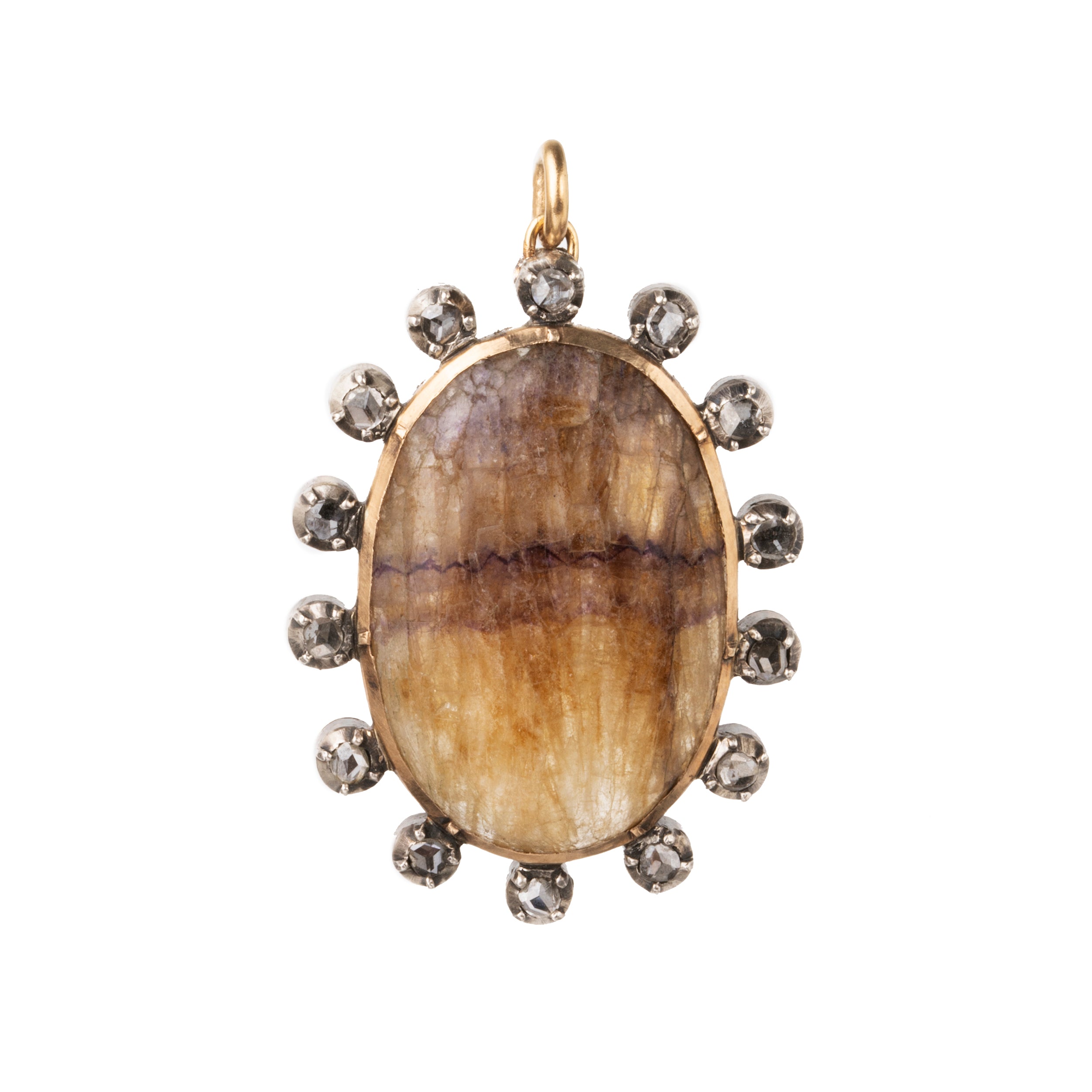 Rare Blue John stone pendant with rose cut diamonds set in silver and gold. A uniquely colored variety of fluorite, Blue John is the rarest gemstone found in Britain. In all the world it is found in one single location, a legendary cave in Derbyshire, England. Portuguese in origin.