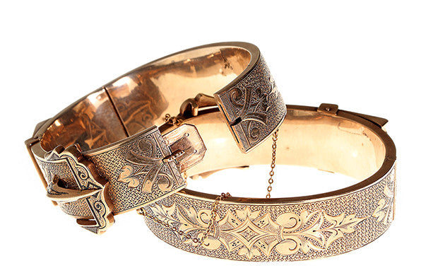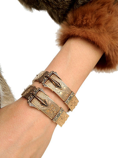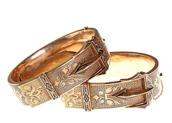 Wonderful & rare matched set of Victorian era gold bangles. Circa 1870/80. Taille d'epargné enamel details on bold buckle designs. The buckle was a common victorian motif standing for strength and loyalty. A perfect sentiment for a set of wedding bracelets. A pair rarely remains together for so many years as they are typically separated amongst daughters in later generations.