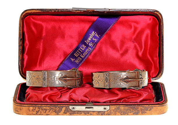 The bracelet was a favorite accessory of a finely appointed Victorian woman and it is said they would wear them stacked from wrist to elbow! When sets such as these are found still together, they are often referred to as 'wedding bracelets'. As we have learned the tradition, the bracelets would begin as an engagement gift and worn upon the bride's wedding day. These are complete with original fitted box from a San Francisco Jeweler. American in origin, 14k Gold. Inner circumference of each bracelet measures approximately 6". Push-tab closure with security chain.