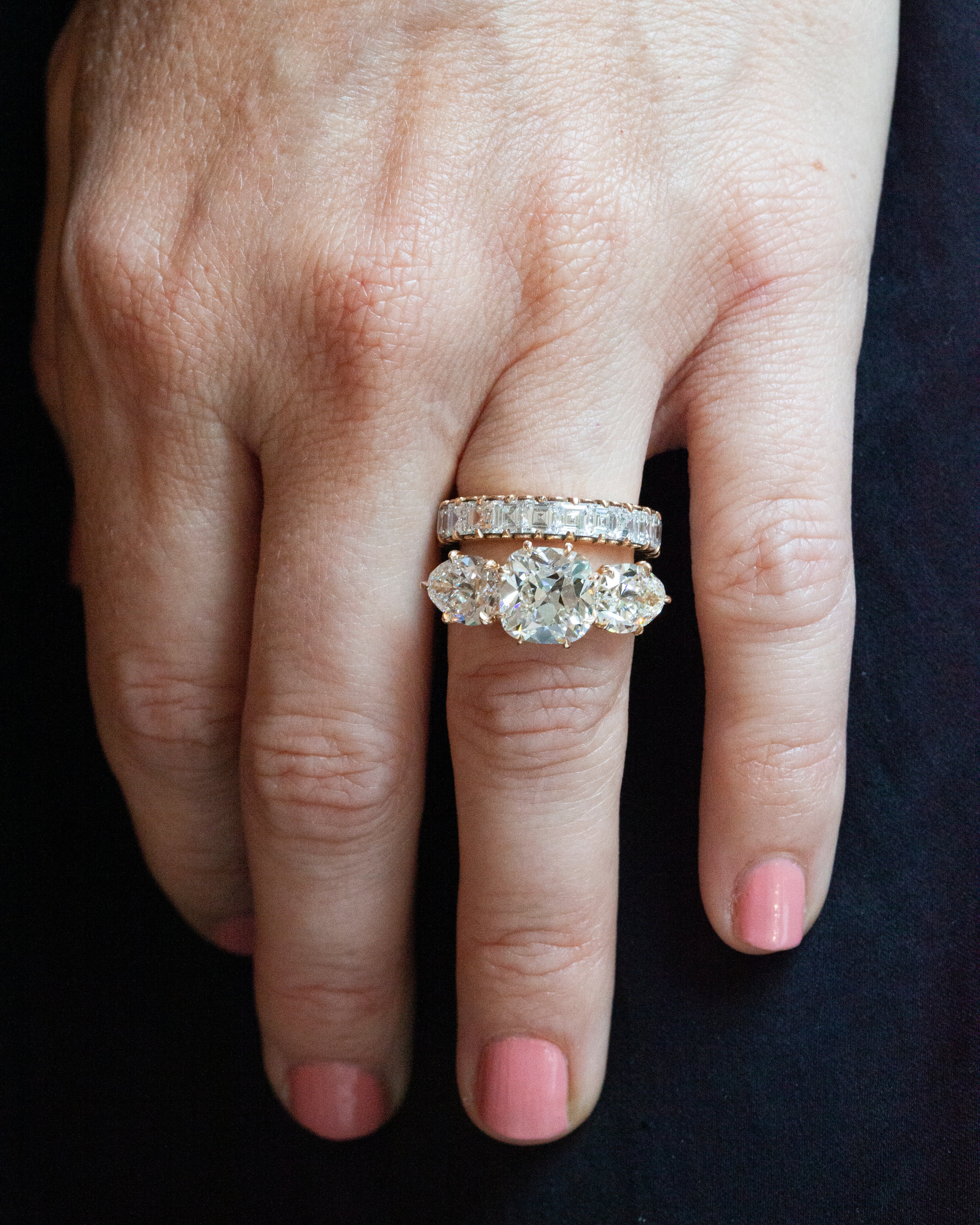 This design is inspired by art deco-era rings that often used the crisp lines of French cut and carré cut stones. Carré cut diamonds are square step-cut stones. The setting technique is inspired by a labor-intensive setting cutaway technique of many 18th and 19th-century rings. Made in our 18k "old" gold. A size 5.5 has approximately 3.36 carats, diamond quality ranges G-H color and VS clarity.