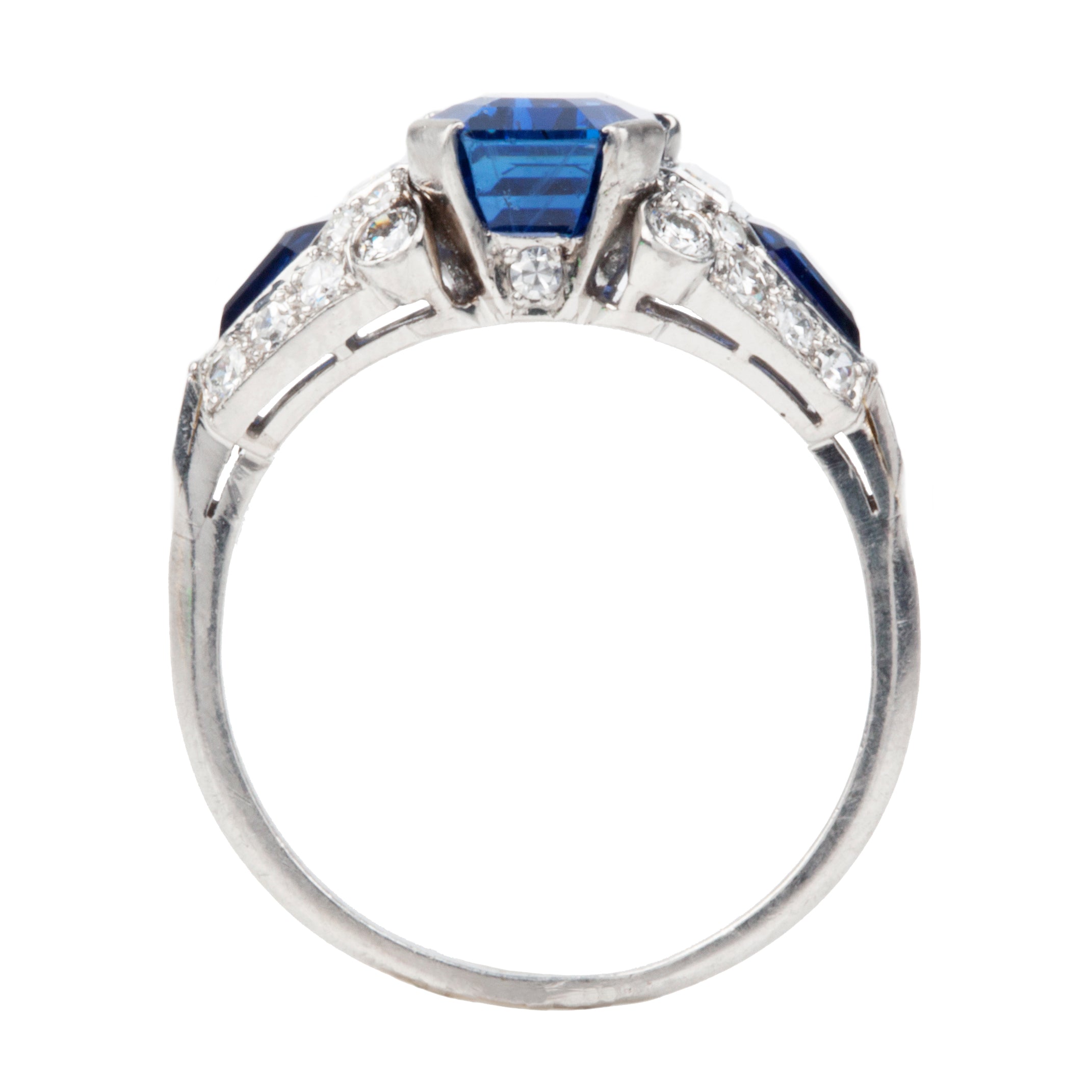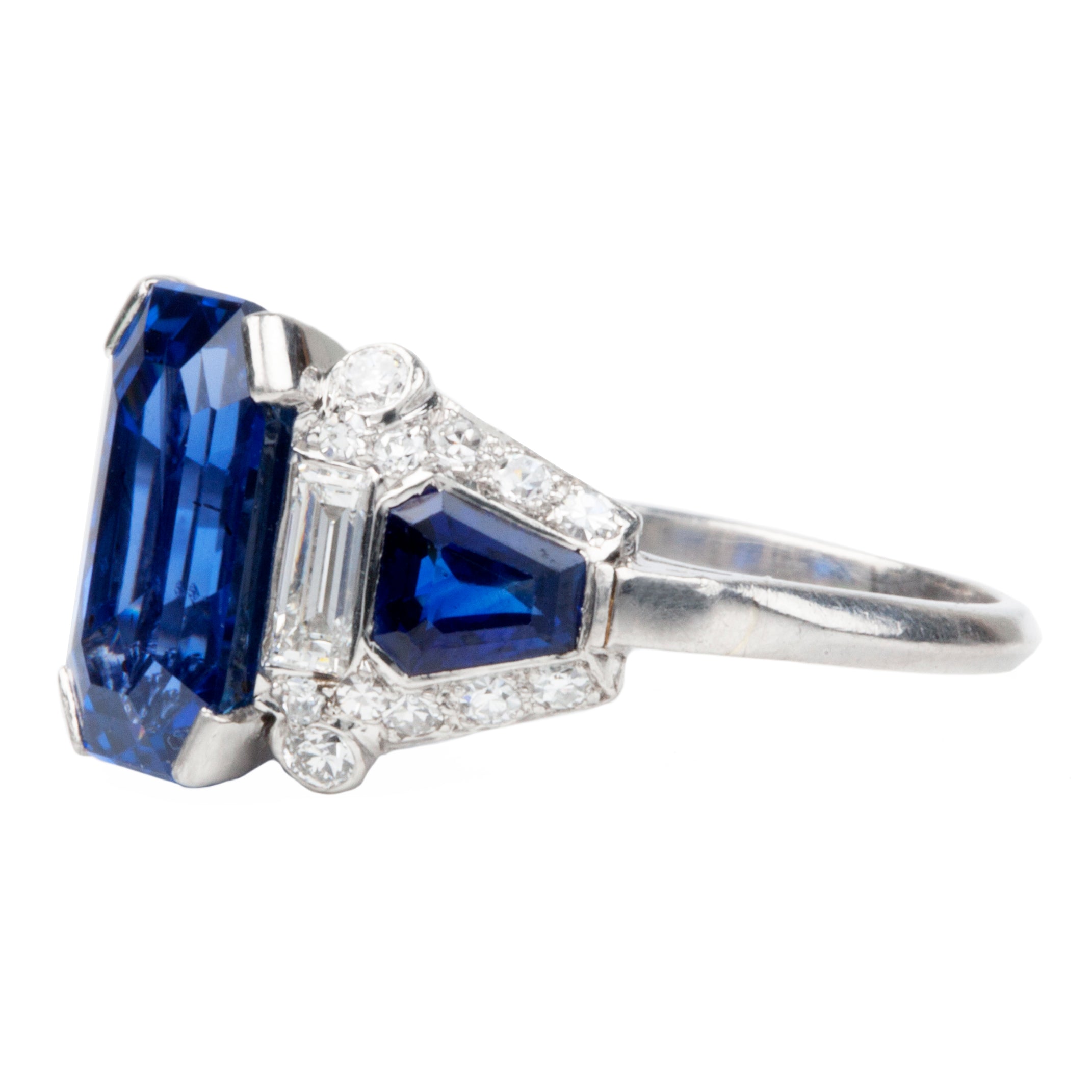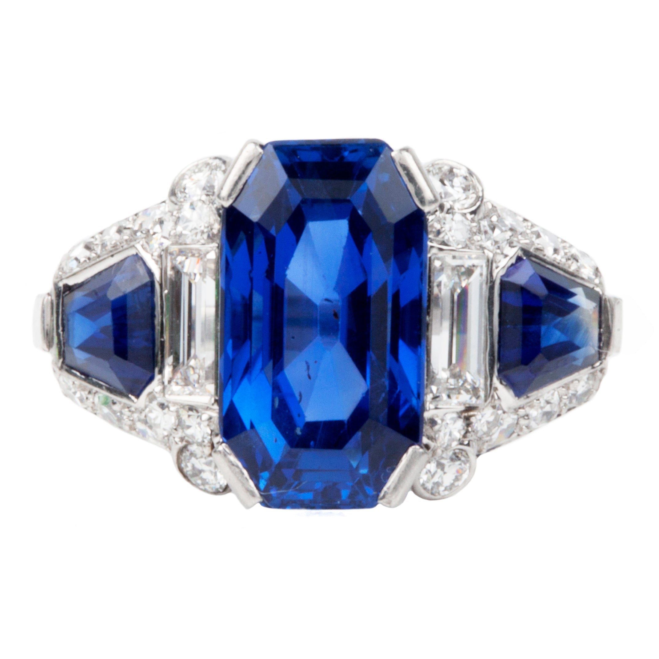 Sapphire and diamond ring in platinum. Center stone is an octagonal step cut sapphire, certified to be a 4.6 carat Ceylon stone, Sri Lankan origin with no evidence of treatment. Two further sapphire side stones of matched color. The sapphires are surrounded by Old European cut, single cut and baguette shaped diamonds of approximately .88 carats in total diamond weight.