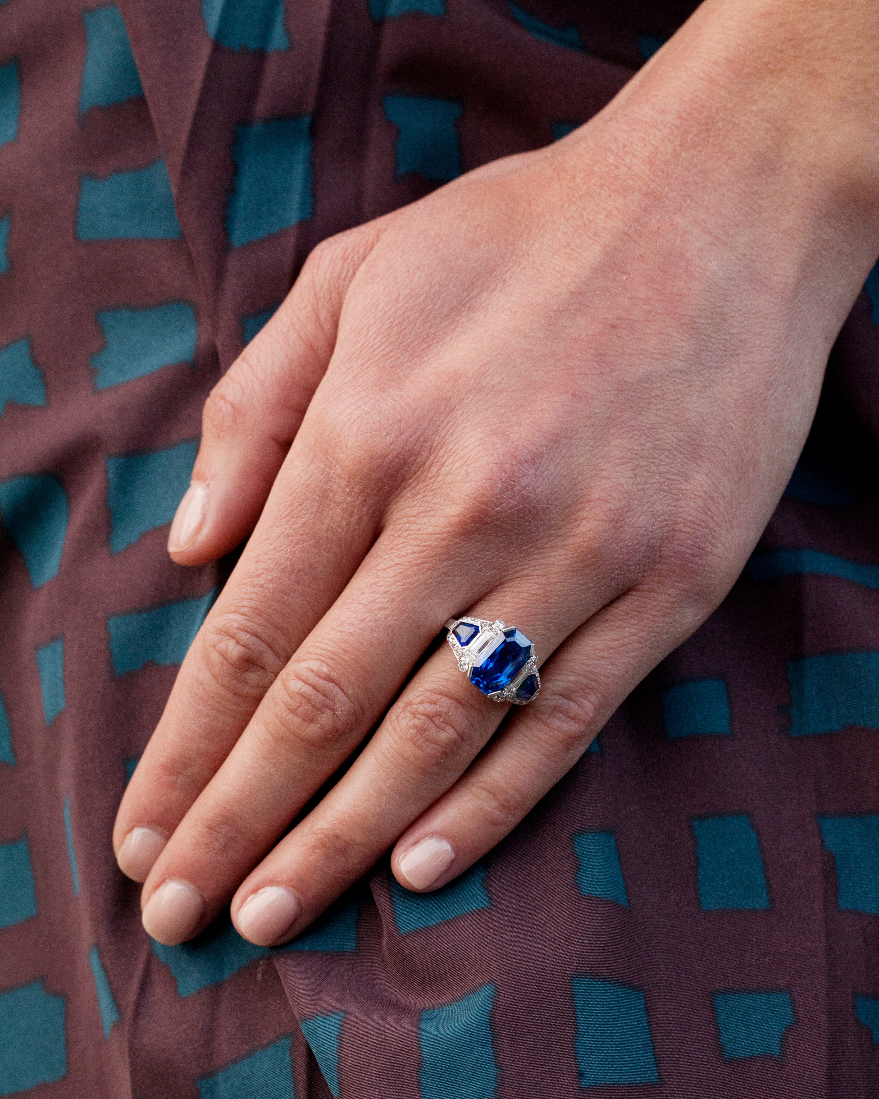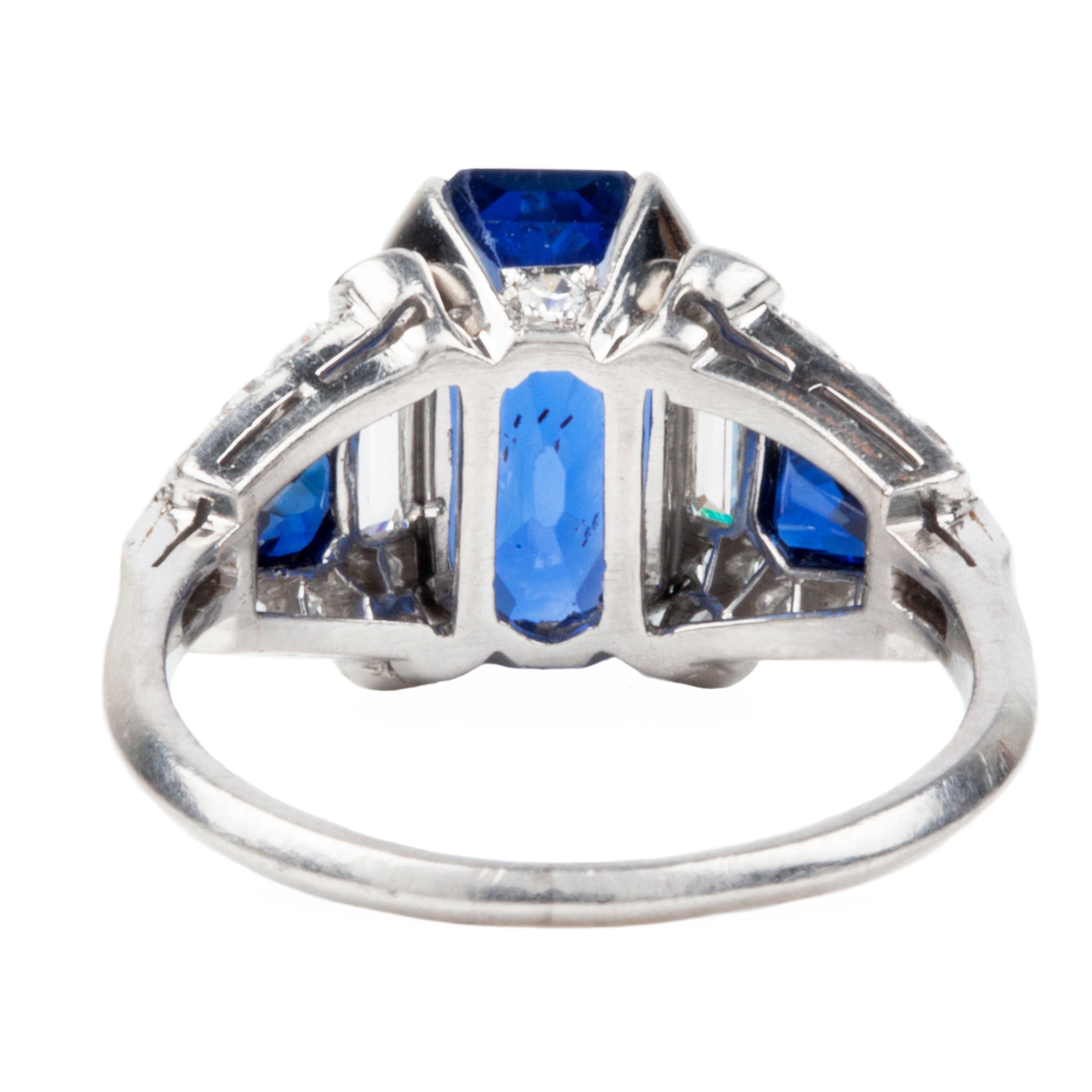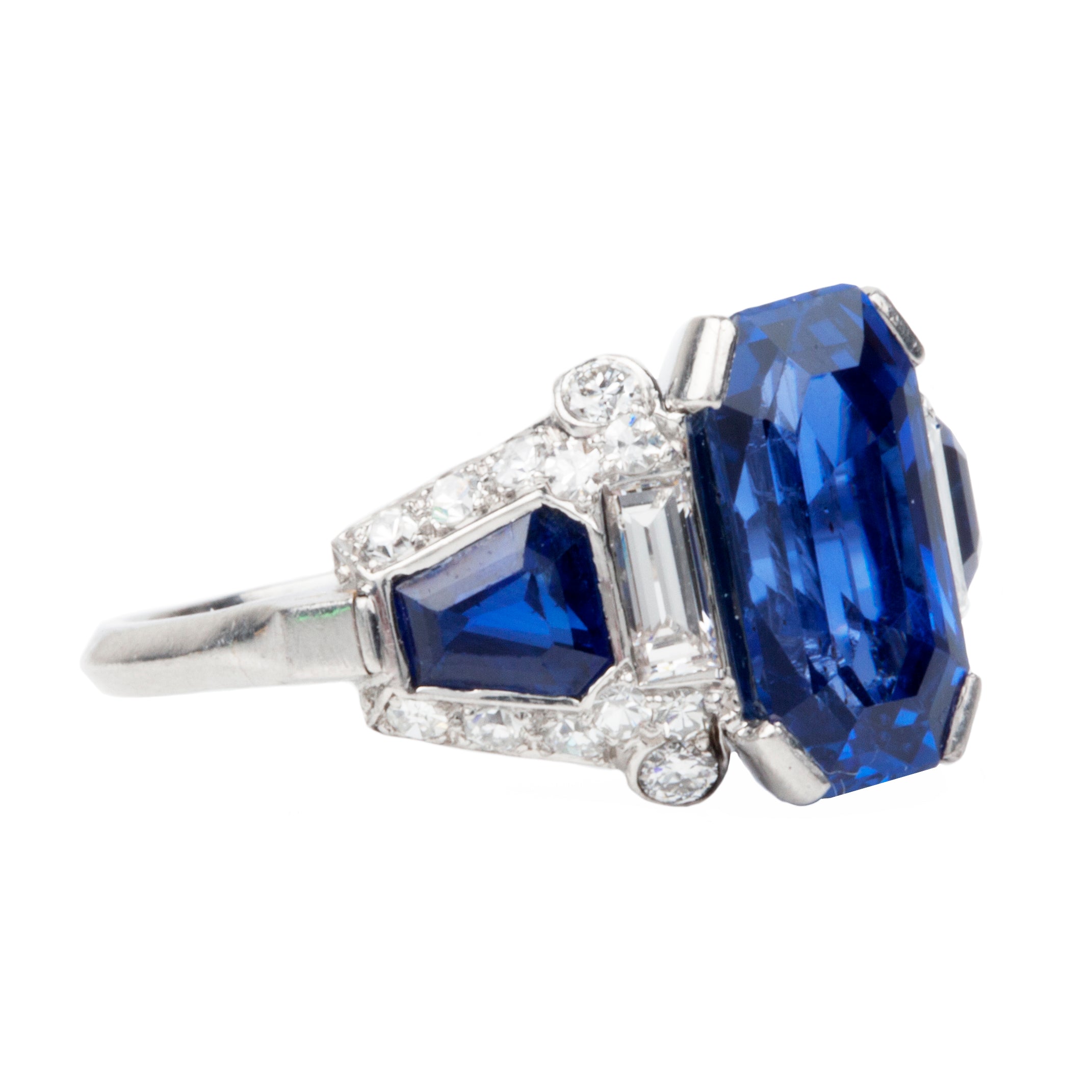 Sapphire and diamond ring in platinum. Center stone is an octagonal step cut sapphire, certified to be a 4.6 carat Ceylon stone, Sri Lankan origin with no evidence of treatment. Two further sapphire side stones of matched color. The sapphires are surrounded by Old European cut, single cut and baguette shaped diamonds of approximately .88 carats in total diamond weight.