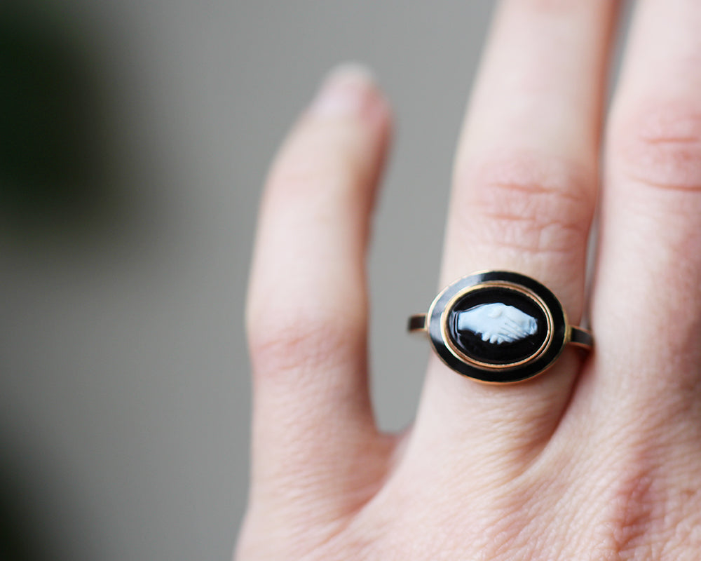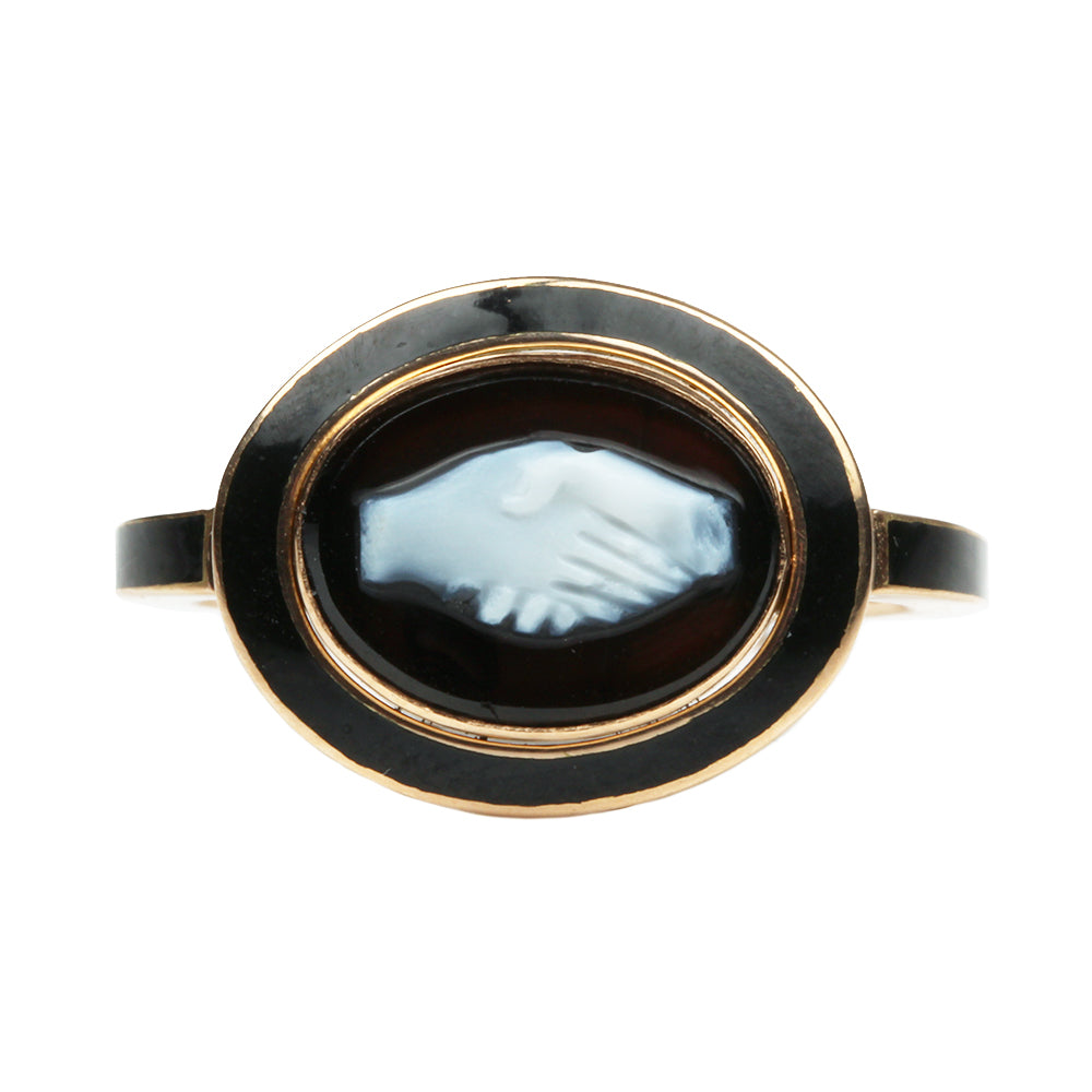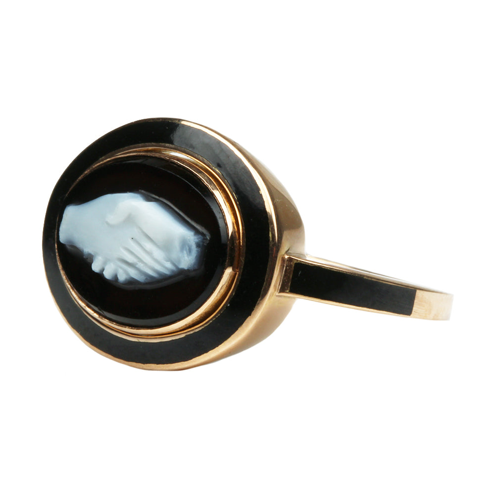 Custom handmade black enamel setting for antique Fede cameo. 18th century hard stone cameo, in our custom 18k "old" gold and black enamel. The Fede design was traditionally a symbol of betrothal with the design of clasped hands dating to the Romans.