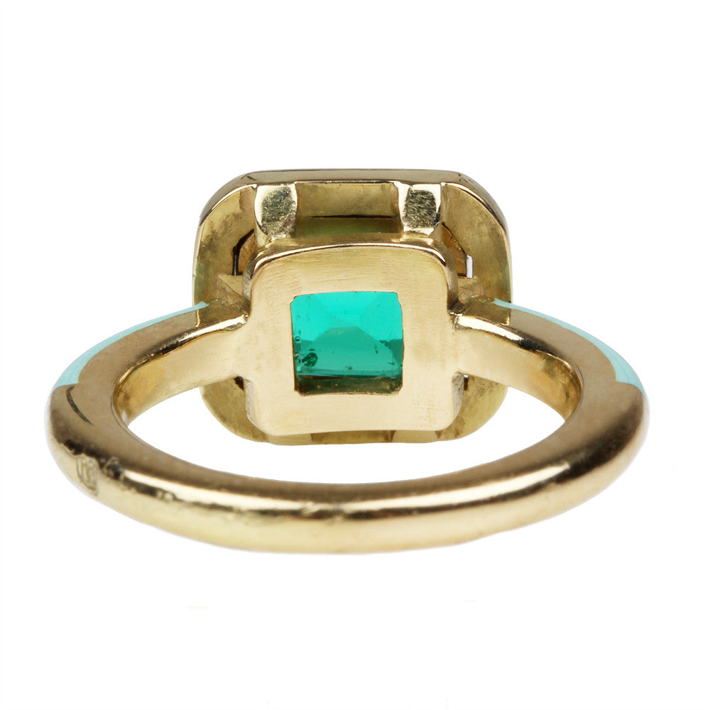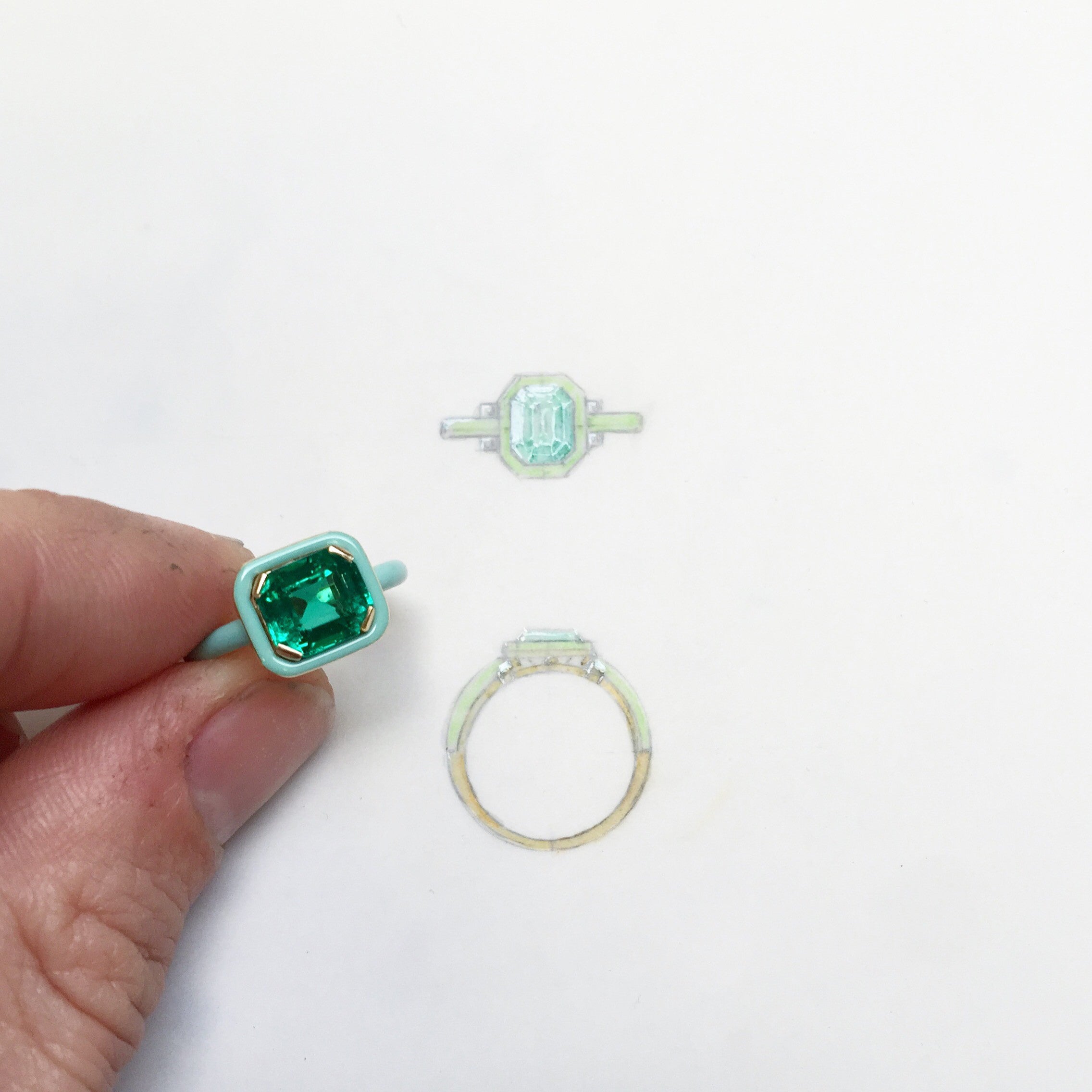 Our handmade setting with Colombian Emerald in our custom 18K yellow gold. Center stone 1.72 carats with mint green enamel detail.