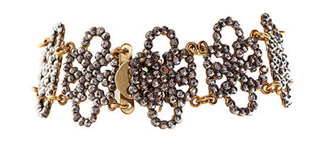 19th century cut steel bracelet. The contrast of brassy gilded links with the grayness of the steel makes for one of our favorite color combinations. Each cut steel rivet throws a beautiful gray sparkle especially in low light atmosphere.