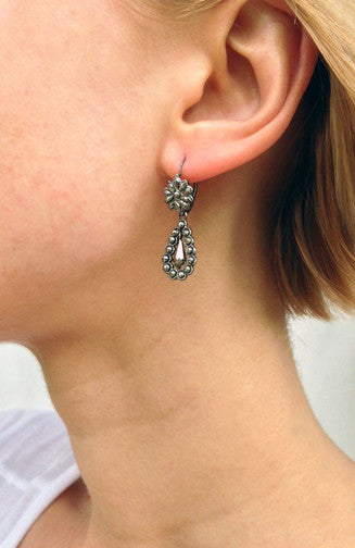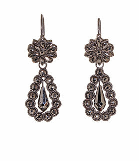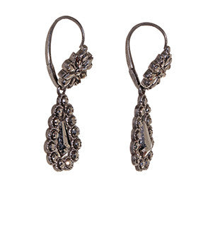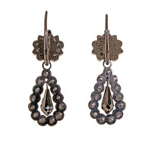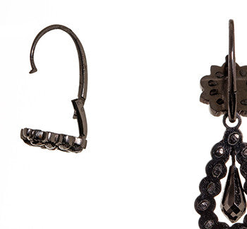Perfect examples of early cut steel earrings. Dating to the late 18th Century to early 19th century they are original and in flawless condition. They sparkle like rose cut diamonds in low light. See our Field Guide for more information on cut steel. Back to front ear wires are done in a day and night style. Top portion can be worn alone or with the 1.25" drop. Entire earring, including wires are made in steel.
