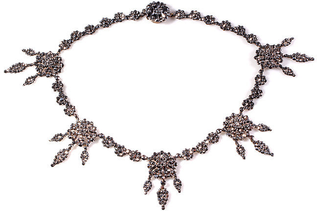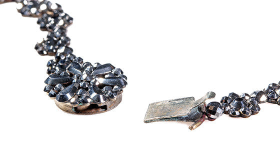 Early 19th Century Cut steel necklace. Beautifully preserved with a bright gray sparkle. Most likely English in Origin. Please see our Field Guide for more history on Cut Steel jewels.
