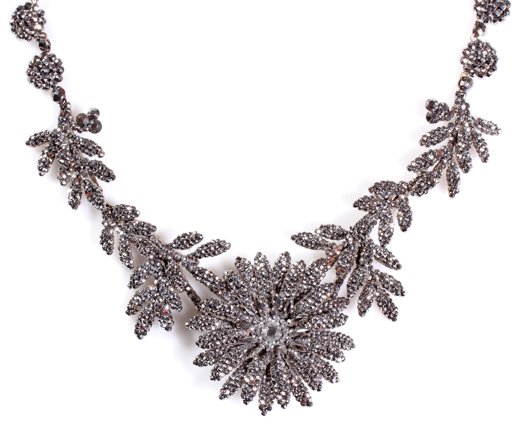 A fine example of an early 19th Century cut steel necklace. The central portion of flower and garland is earlier than the back portion that goes around the neck. The finest examples of cut steel are comprised of these smaller facetted rivets. English or french in origin. Found in England.