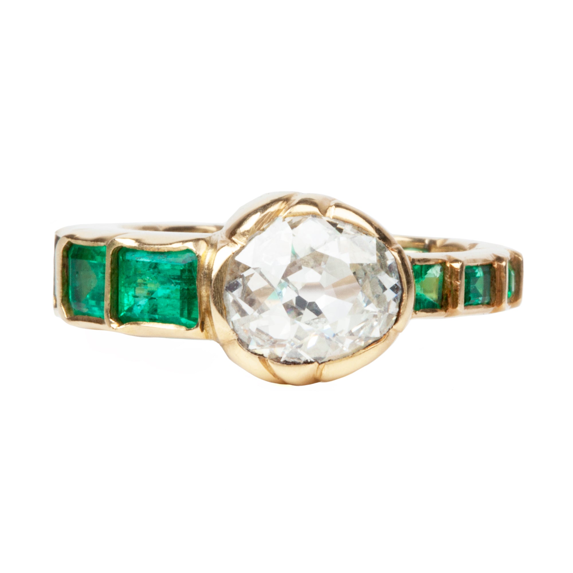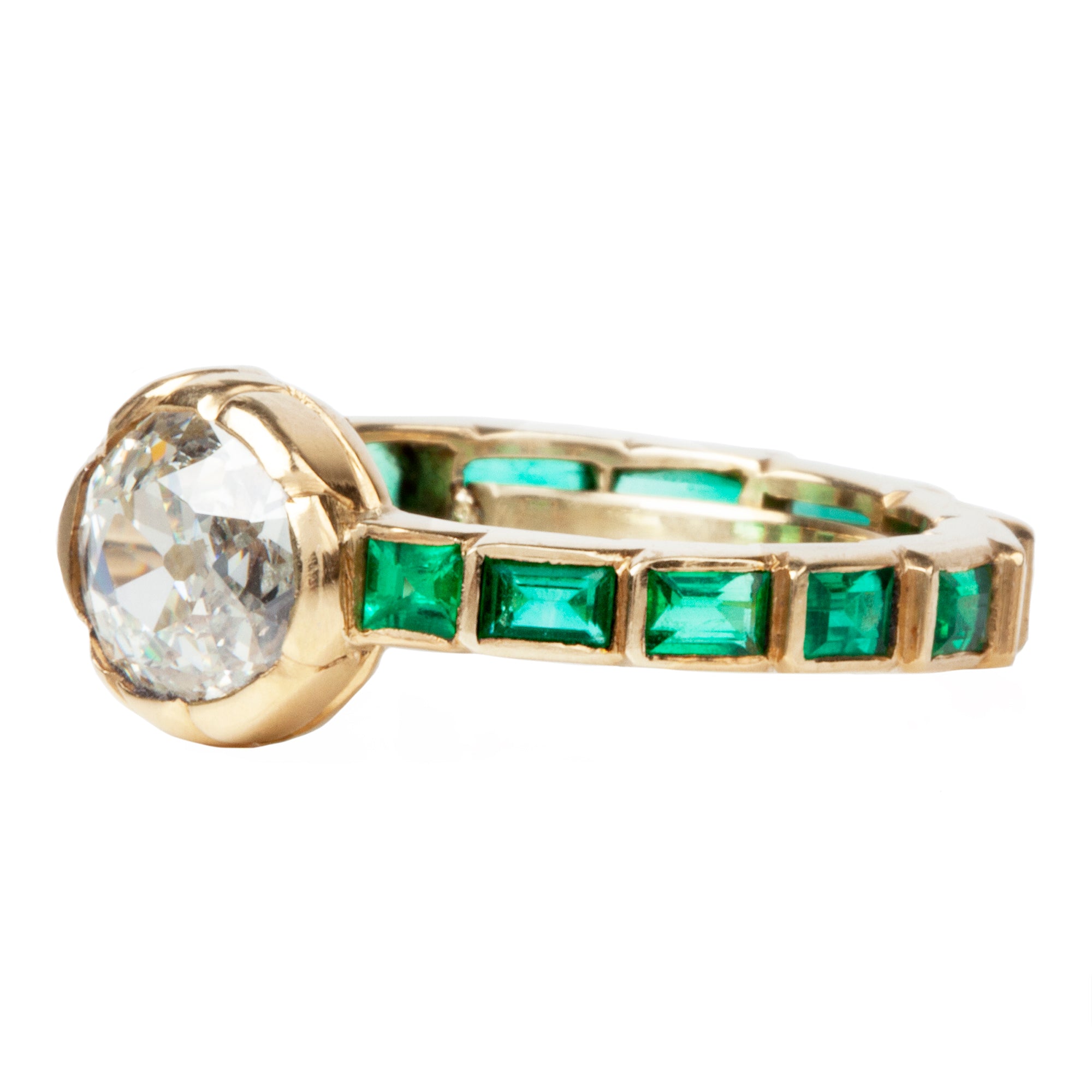 The ouroboros is a centuries-old symbol of eternity and wholeness. Completely hand fabricated in our custom color 18K old gold. Inspired by Victorian-era snake rings that have passed through our hands. This ring features an antique approximately 1.20 carat old mine cut diamond set in the head and 13 graduated natural emerald baguettes. Beautiful engraved snake scale details. No castings or molds were used in production.