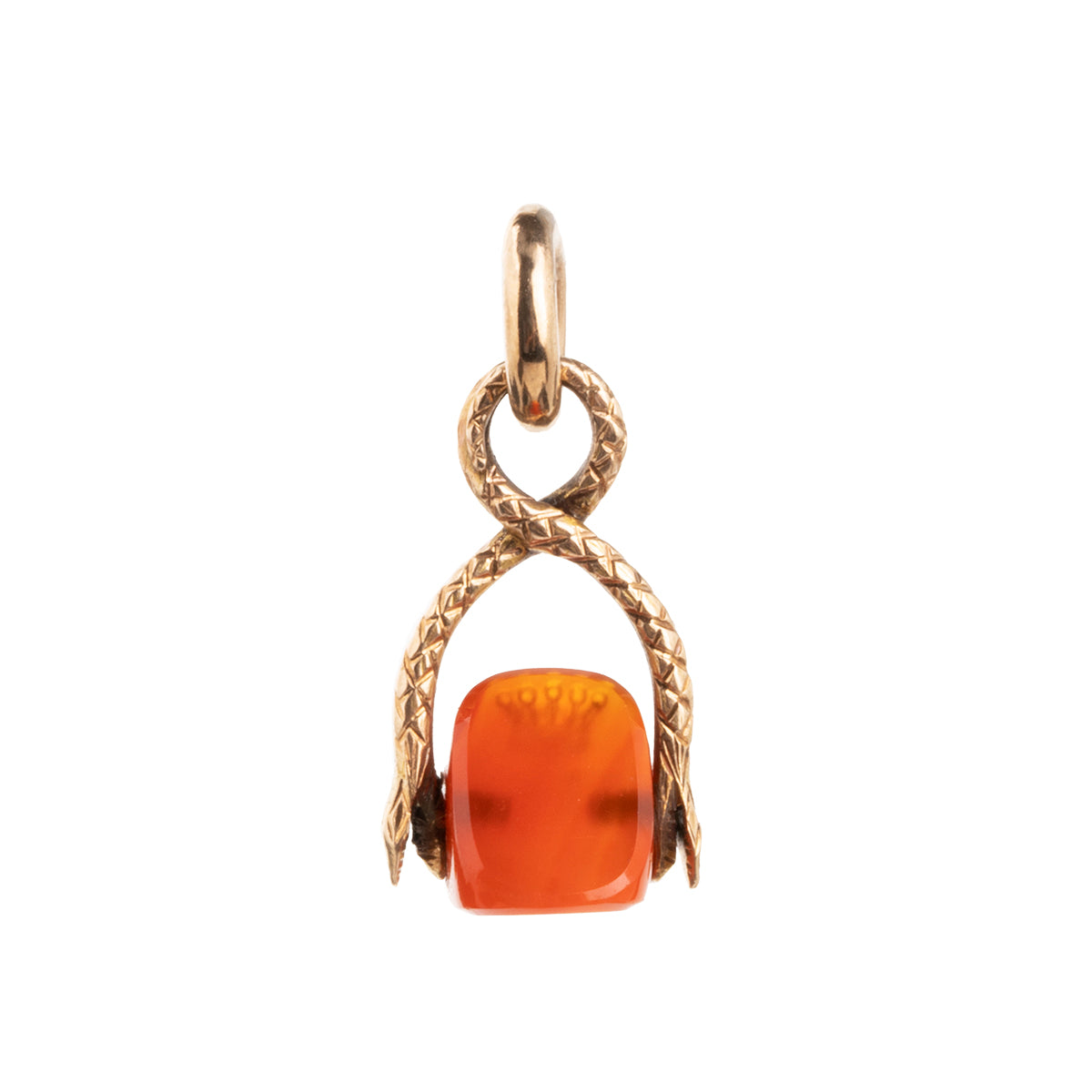 Diminutive Georgian era twin serpent fob, in 15k gold. Carved carnelian spinning fob with a crowned monogram reading "SD". Circa 1830. English in origin.