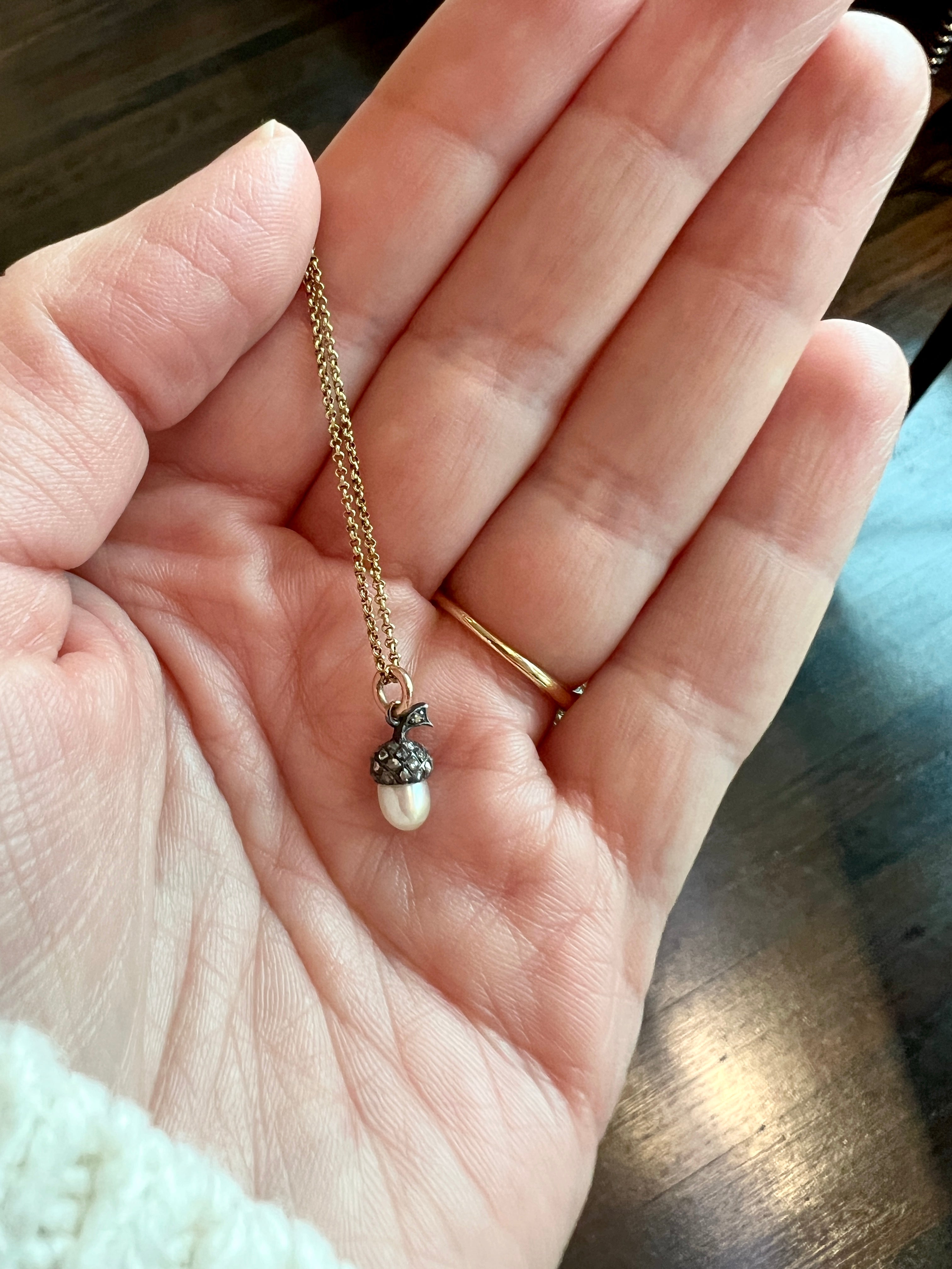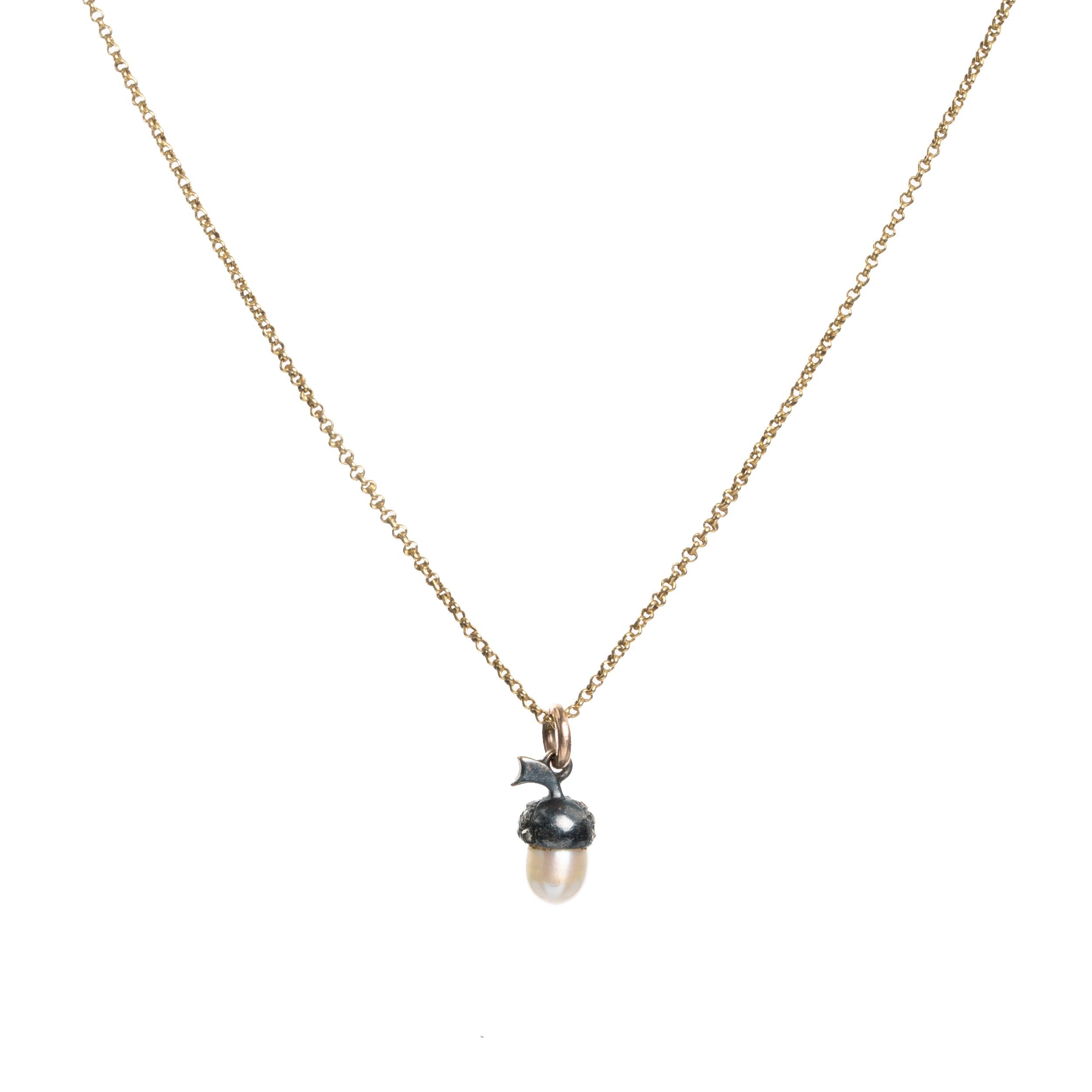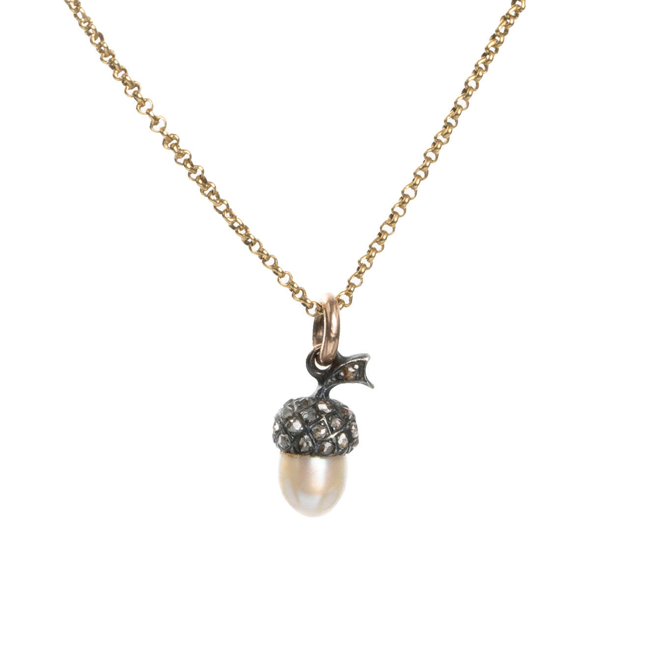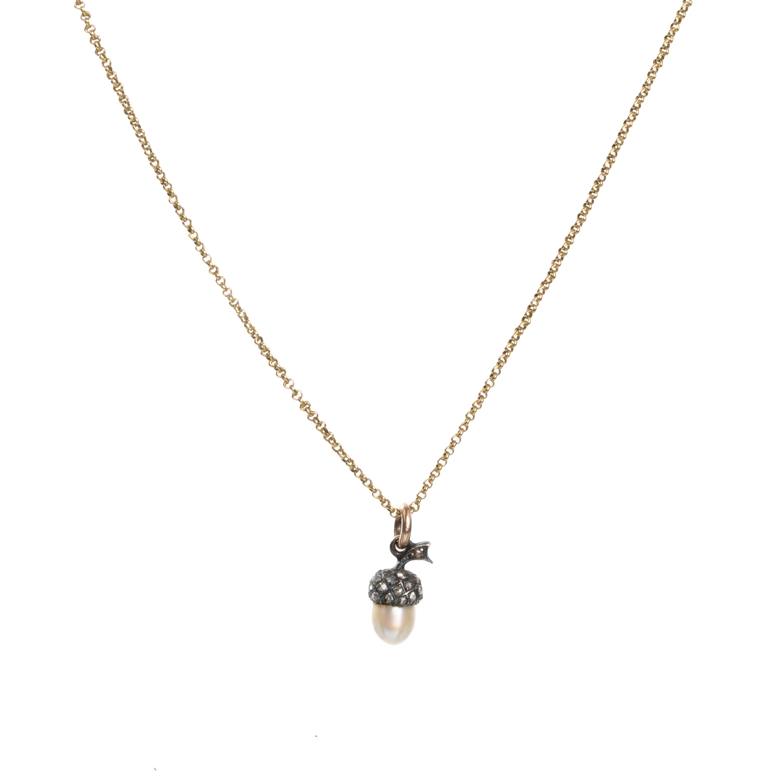 Diminutive Victorian Era Pearl and Diamond Acorn Necklace
