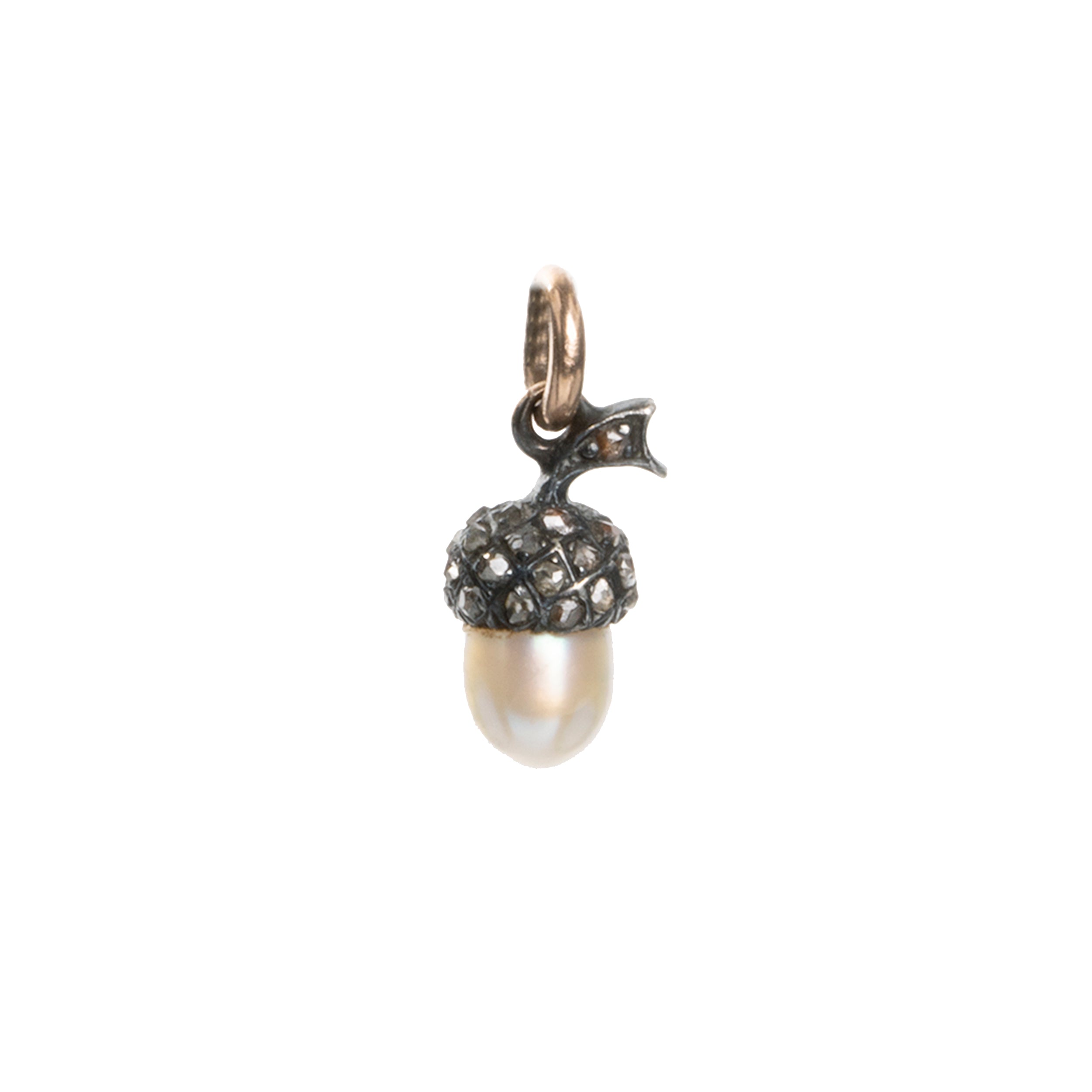 Diminutive Victorian era acorn charm necklace. Rose cut diamonds set in silver with a natural pearl. English in origin. Circa 1870. Originally hanging on a Victorian Era hat pin.