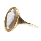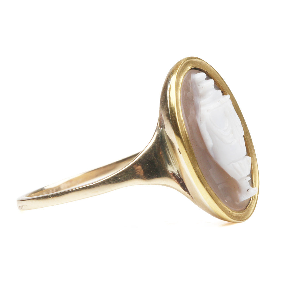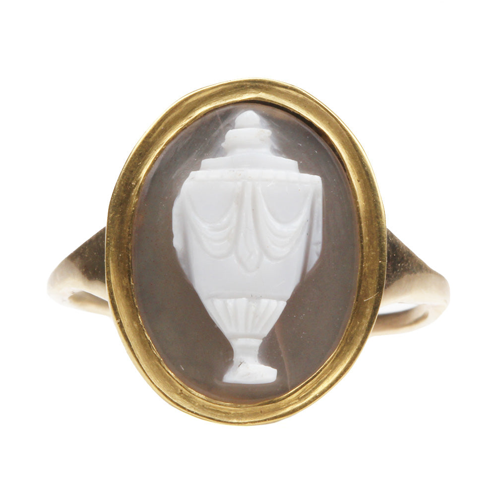 Early 19th Century carved urn ring, in hardstone. Set in a 18k gold revival shank. English in origin. Circa 1820.
