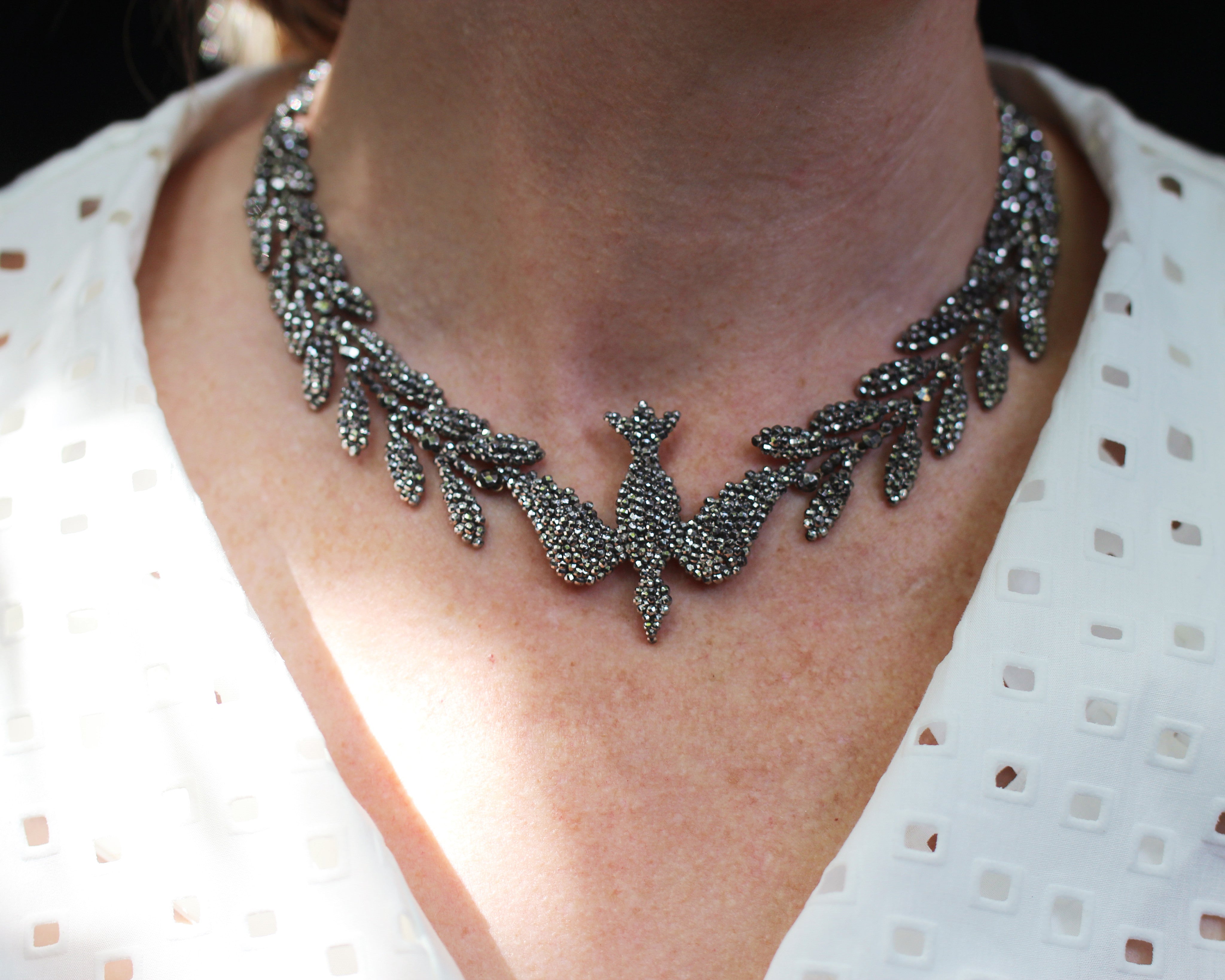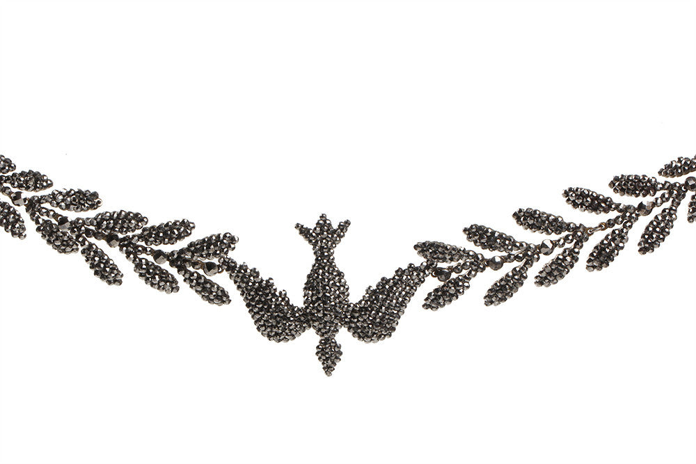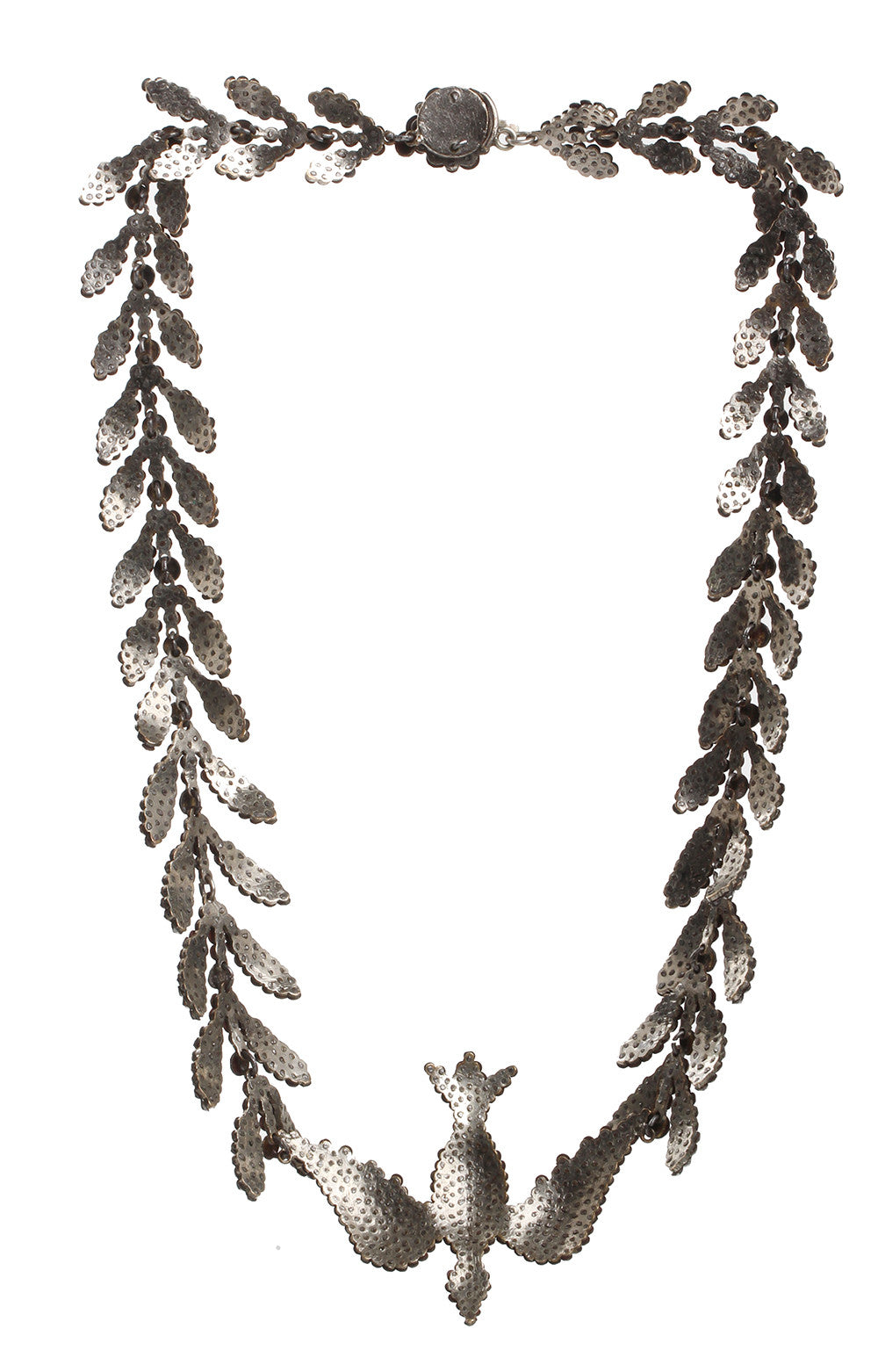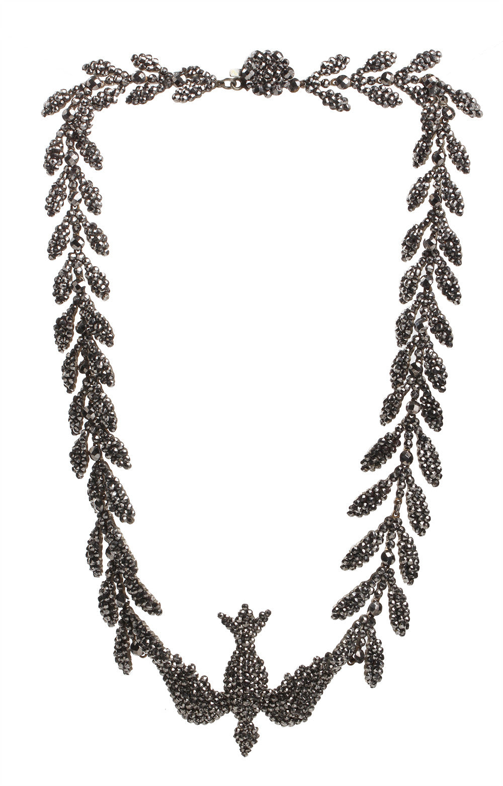 A nice example of an early 19th century cut steel necklace. Dove and olive branch motif. Cut steel push clasp. Measuring a generous 16.5". It is difficult for the camera to capture the dark sparkle this necklace gives. Circa 1840, found in England.