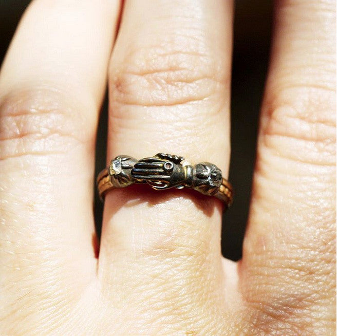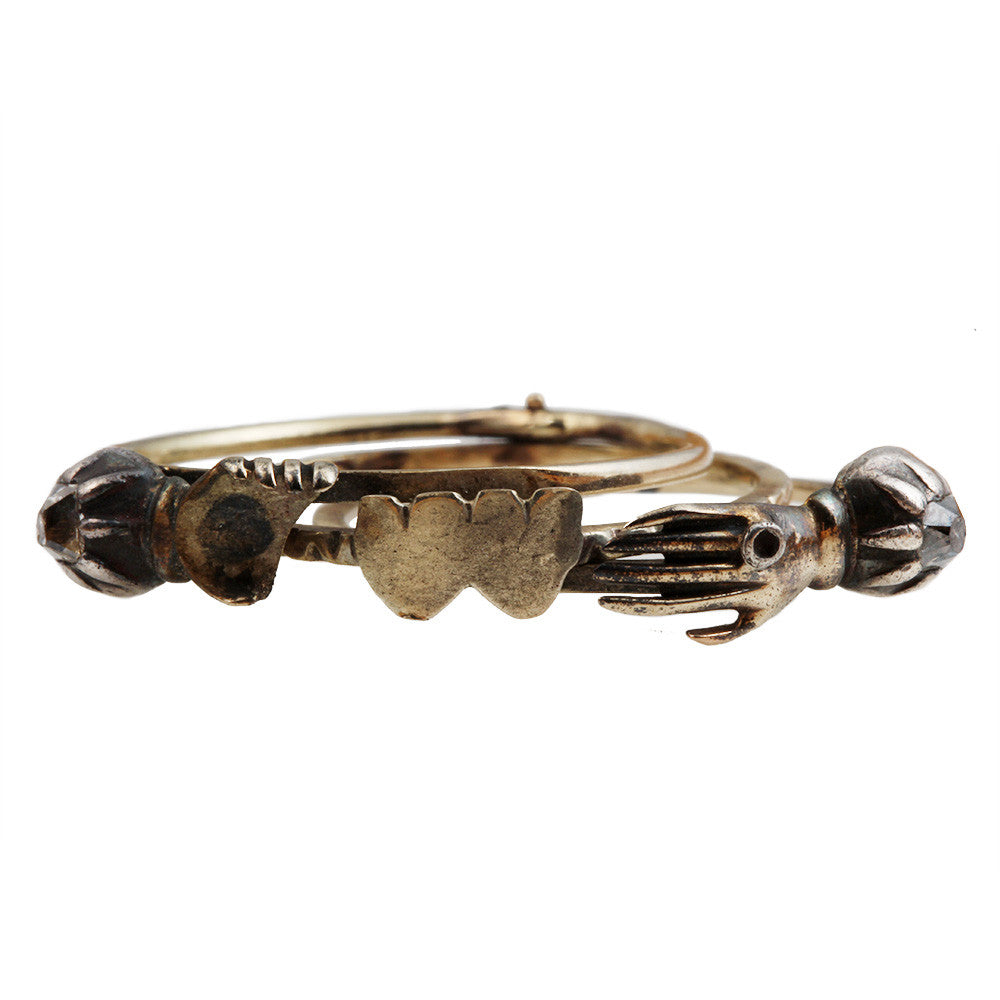 Early 19th century old mine cut diamond gimmel ring. Diamonds set in silver on gold shanks. The clasped hands open to reveal a double heart. The gimmel motif represents the joining of hands in a ceremony of marriage. The ring is comprised of three rings held together by a center pin at the base, allowing the ring to swivel open. The two hands join snugly together. Circa 1850.