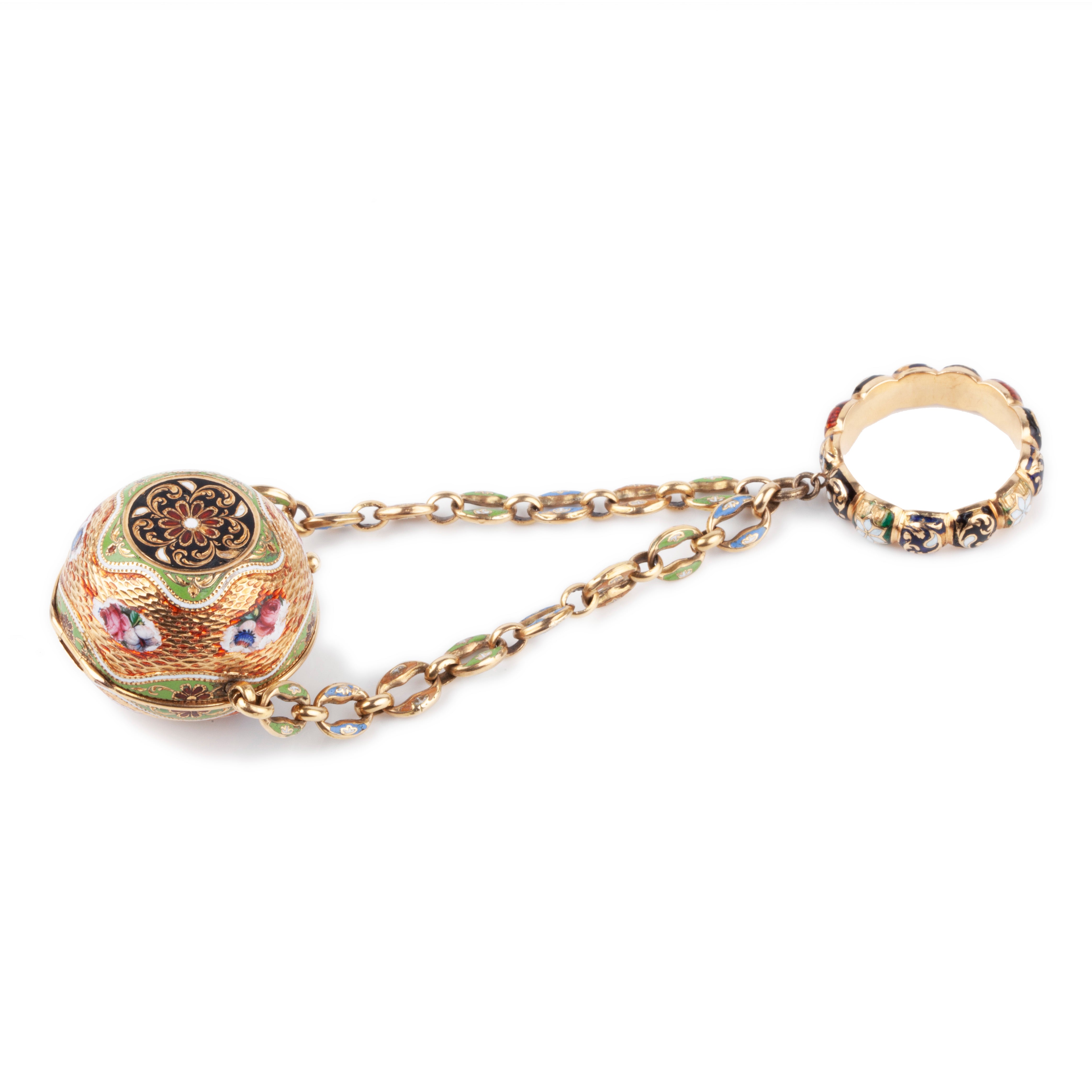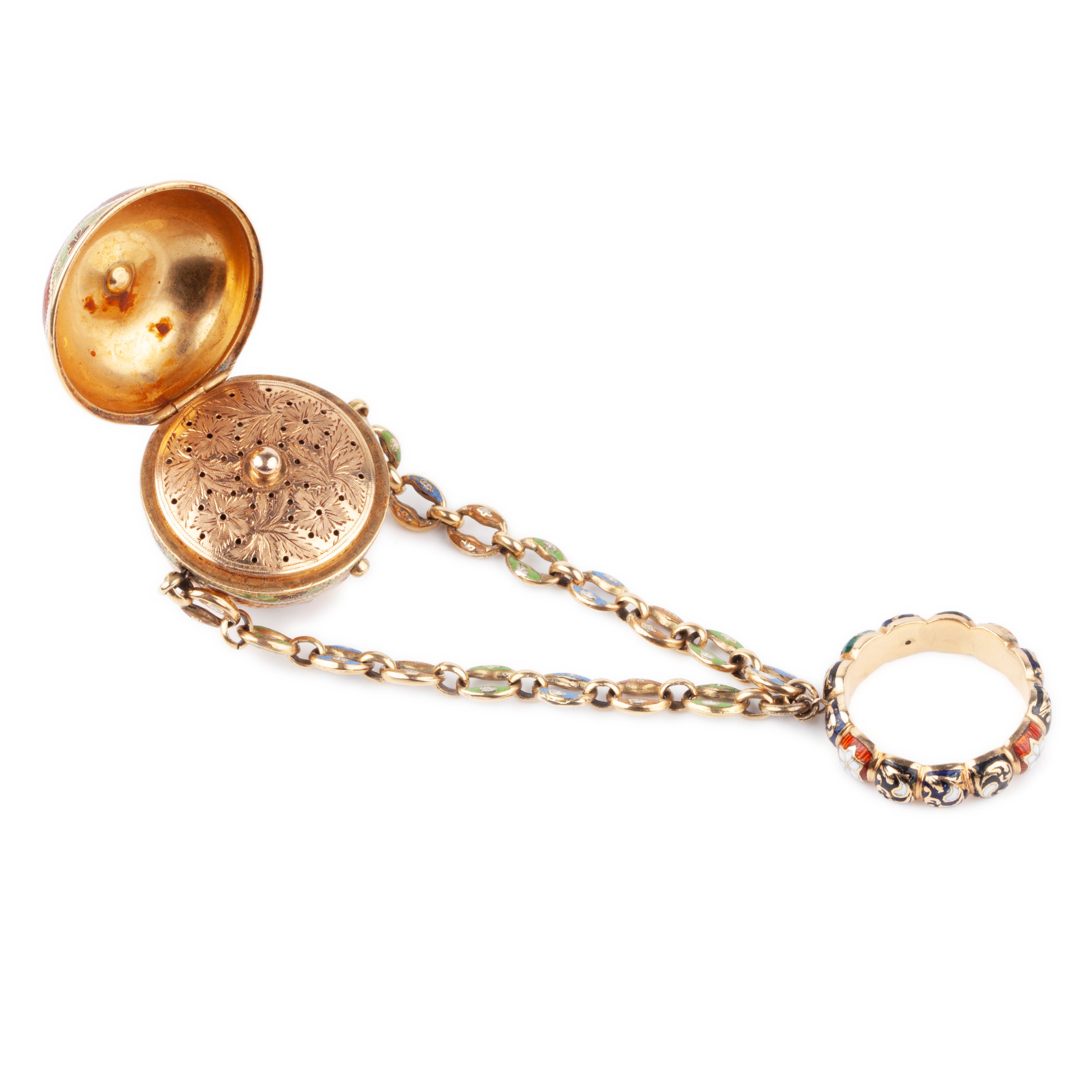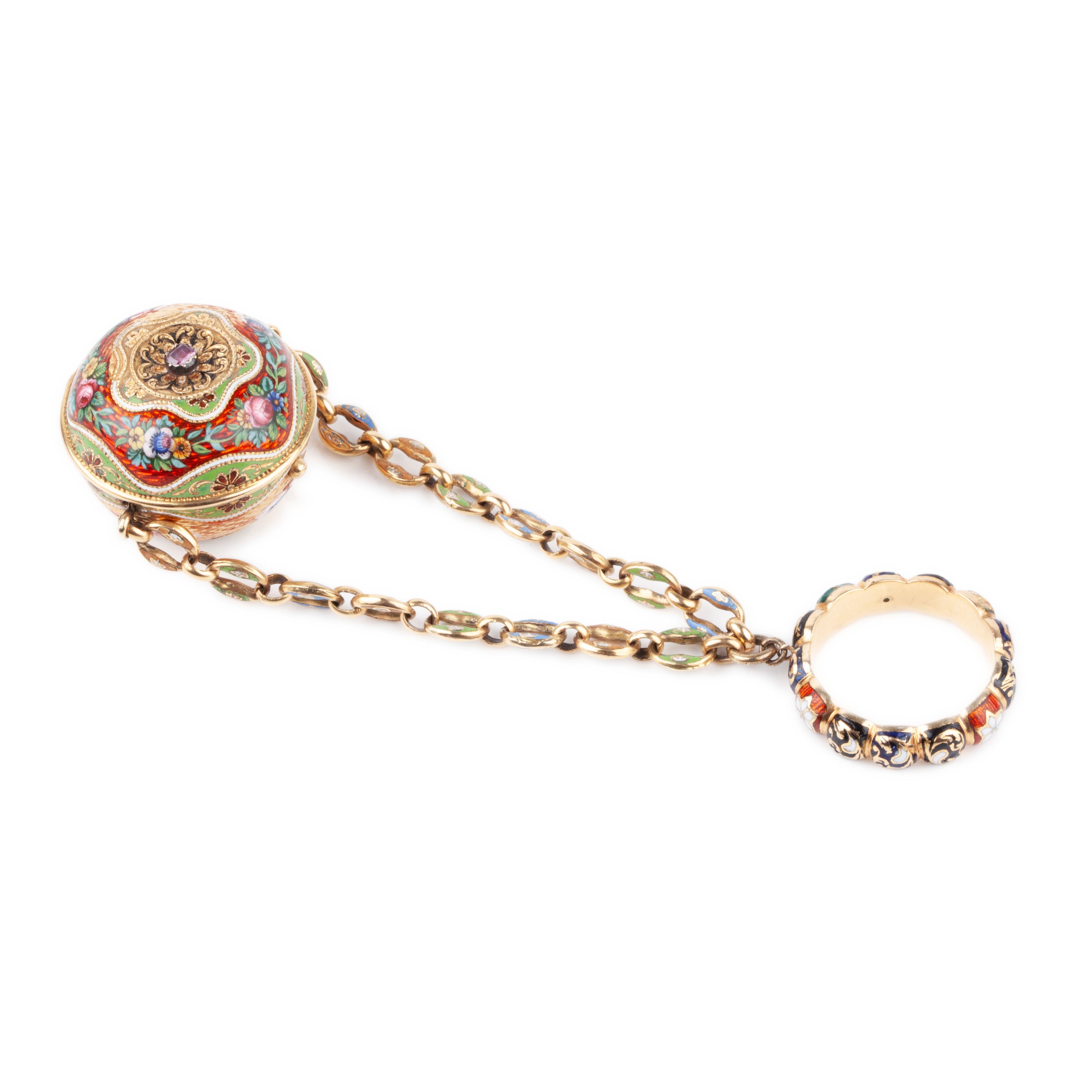 Early 19th century enamel vinaigrette ring, in 18k gold. Enamel links attached the vinaigrette basket to the enamel ring. The backset is decorated with a translucent red enameled guilloché layered with decorative floral designs and a tiny set ruby. When opened the basket reveals a removable pierced cover with an intricately engraved floral motif. Swiss enamel work. Circa 1820.
