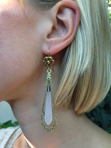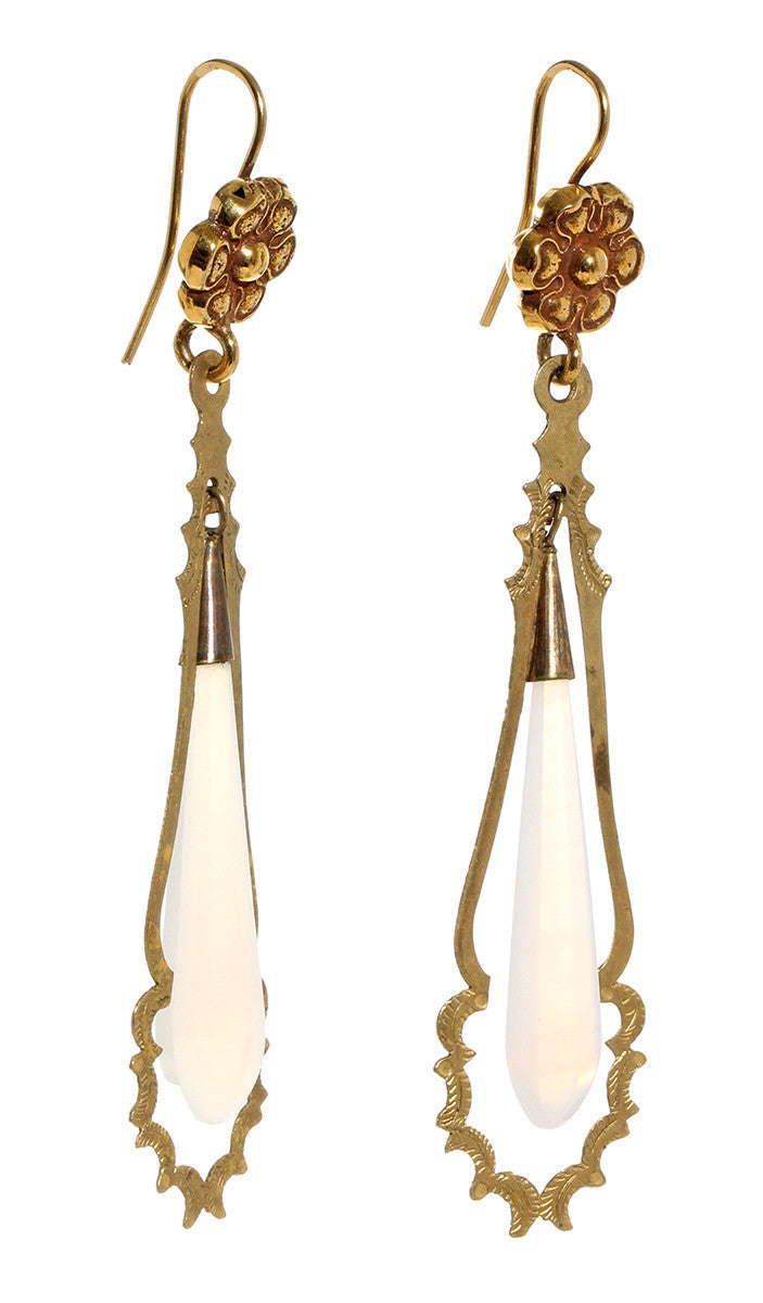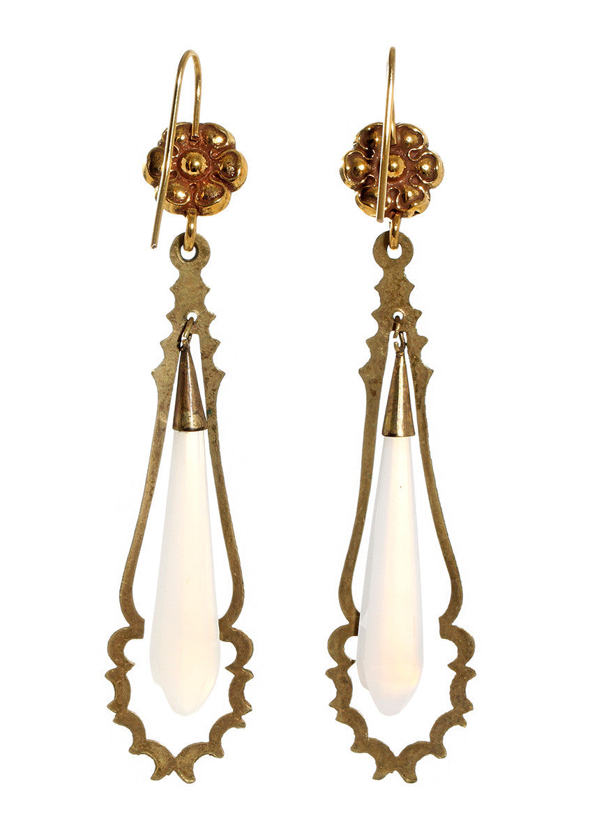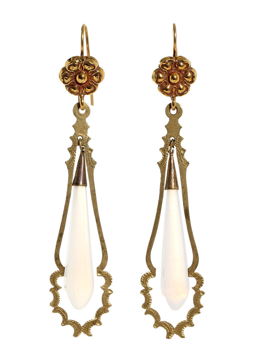Great example of torpedo drop earrings from the 1830's & 1840's. Their size and lightness were dictated by fashion. The horizontal lines of style of dress and hair needed to be offset by long pendants. While at the same time the scarcity of precious metal encouraged the use of wafer-thin foil of gold. This pair is in gilded metal or Pinchbeck and transparent white agate stones. French in origin, found in Paris.