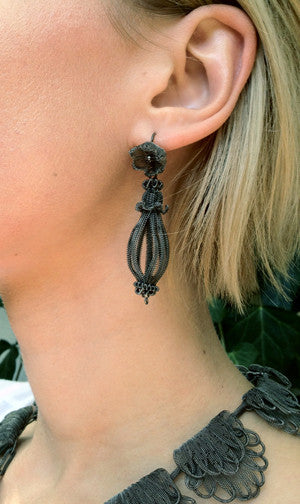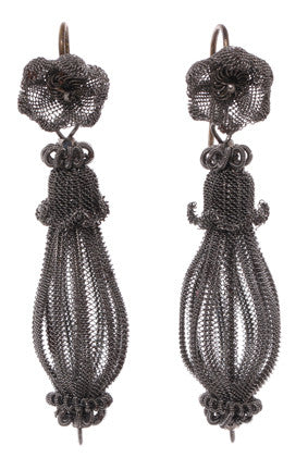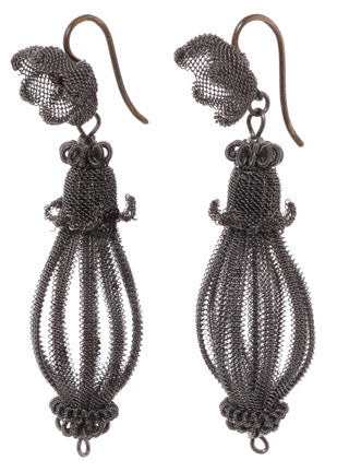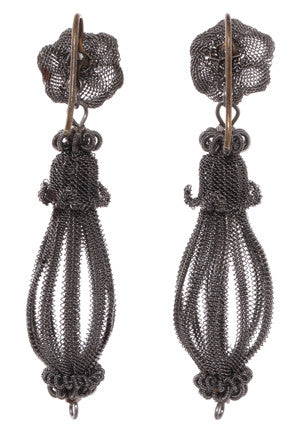 Circa 1800 these earrings are made out of very fine strands of grey iron wire produced by the earliest foundry in Silesia located in central Europe. Extremely light in weight with magnificent intricate iron wire-work weaving.