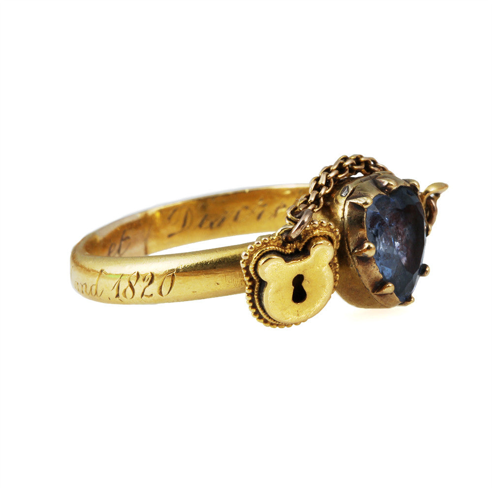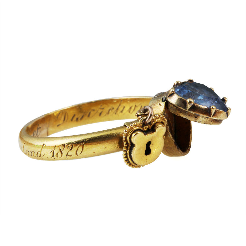 This ring engraved with the date 1820 has a natural sapphire, in a pinched collet setting, which conceals a locket compartment in the shape of a subtle heart. On either side of the sapphire, connected by a