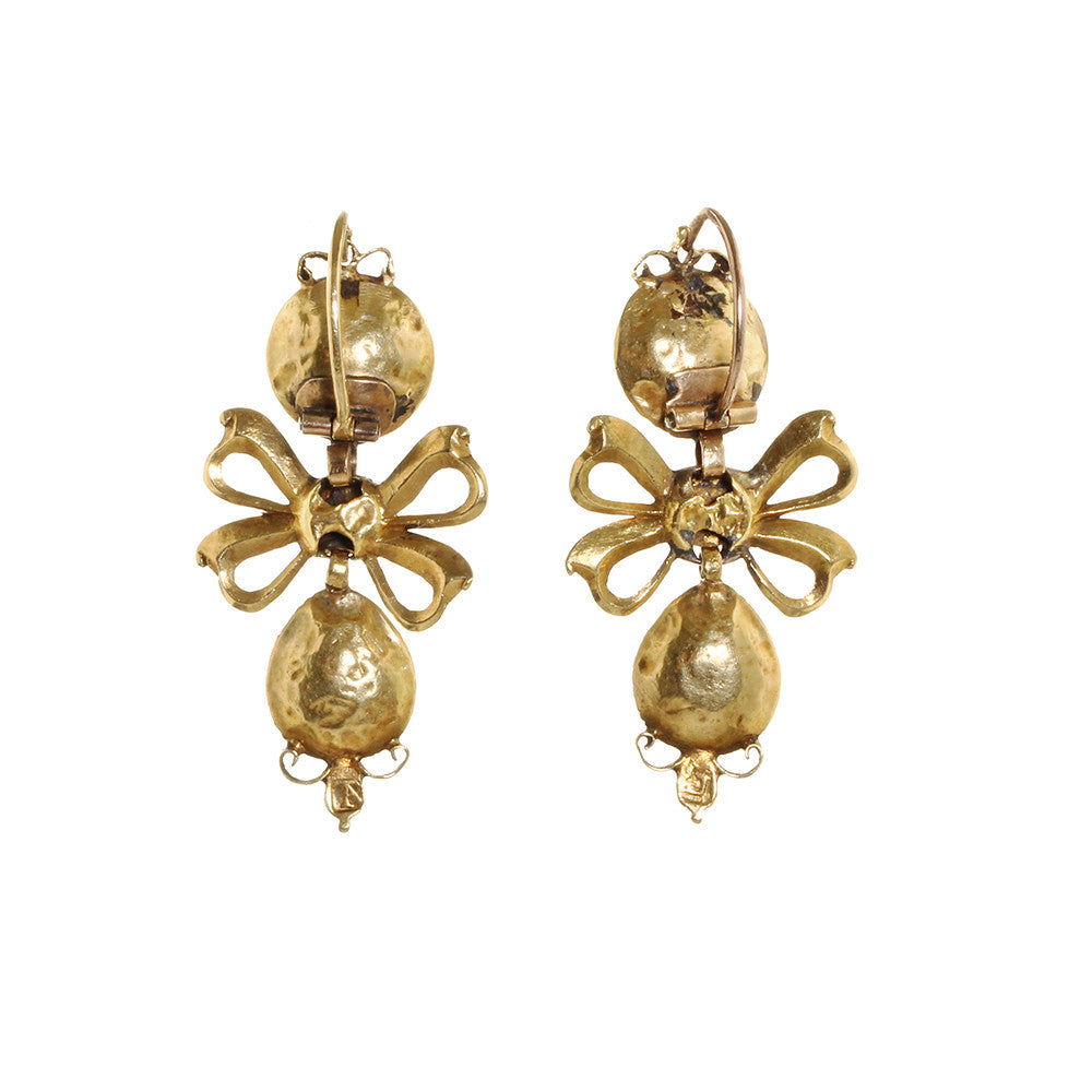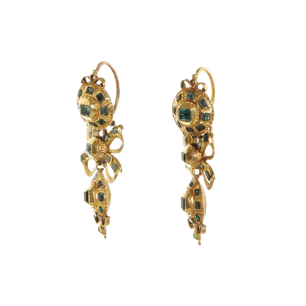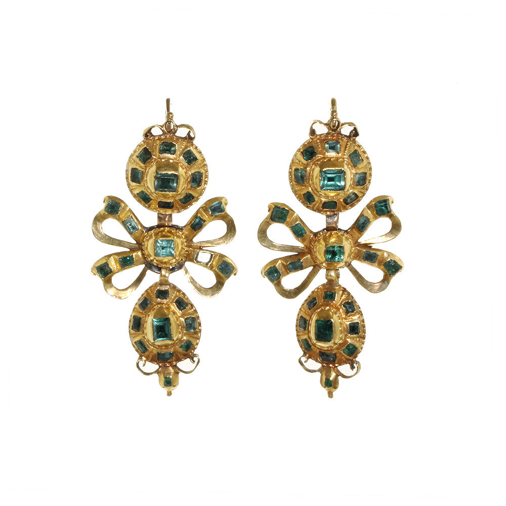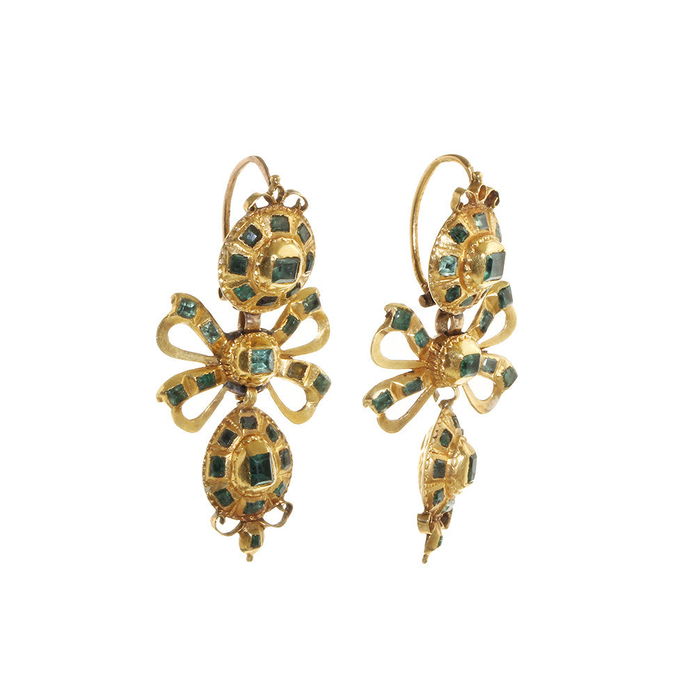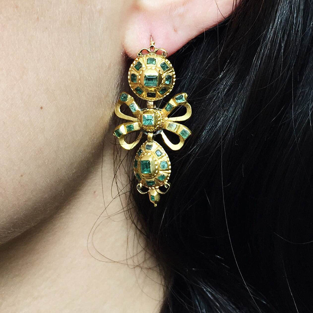 Early 19th century Emerald and gold earrings, Spanish in origin. Hand made in 18k gold and emeralds, sourced in colonial mines in Columbia and Peru. They are petite Lazo (bow) design, a variation on the pendeloque.