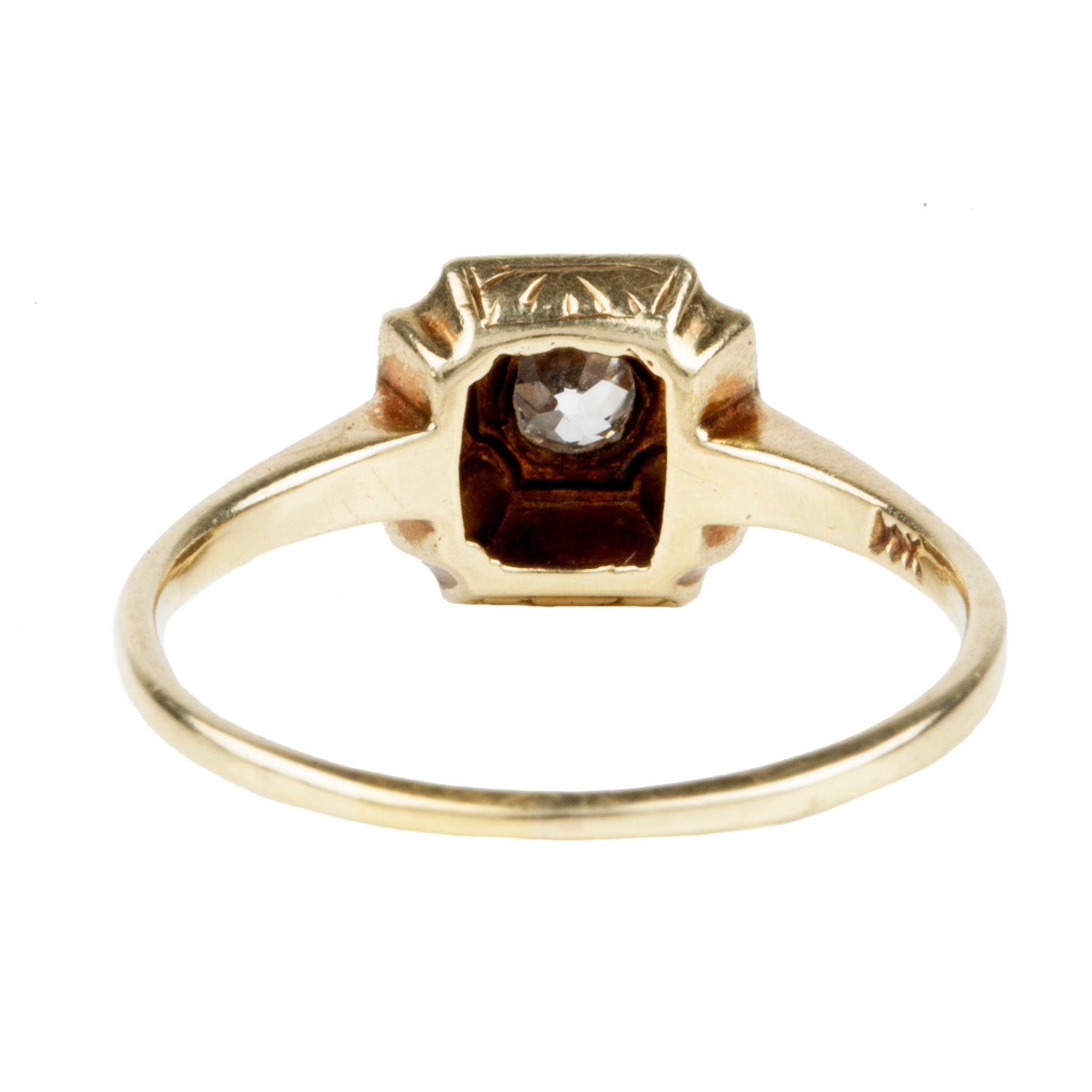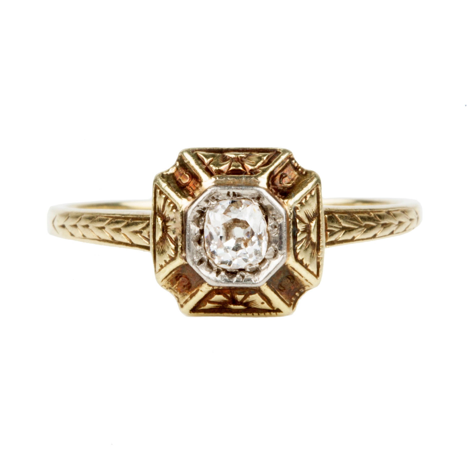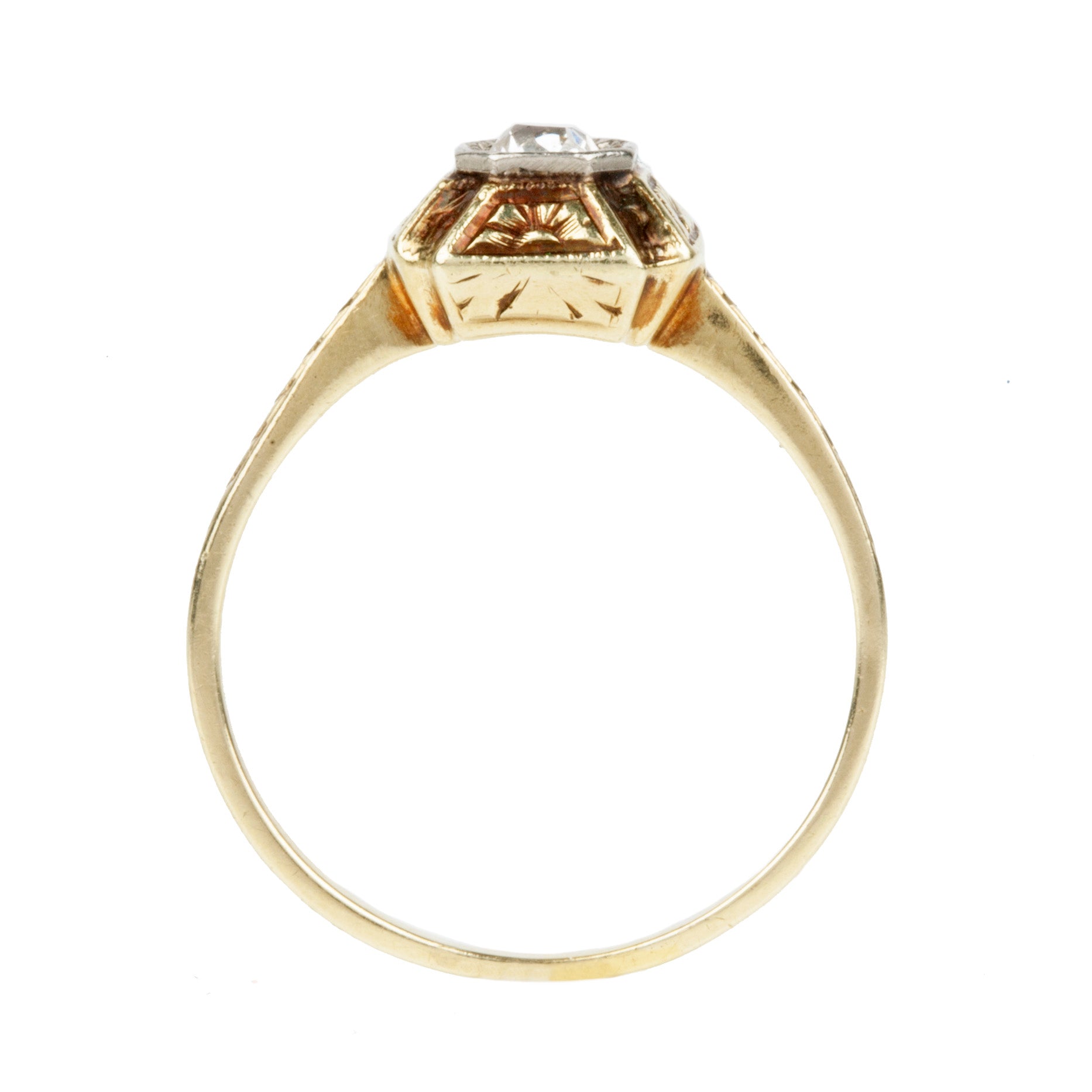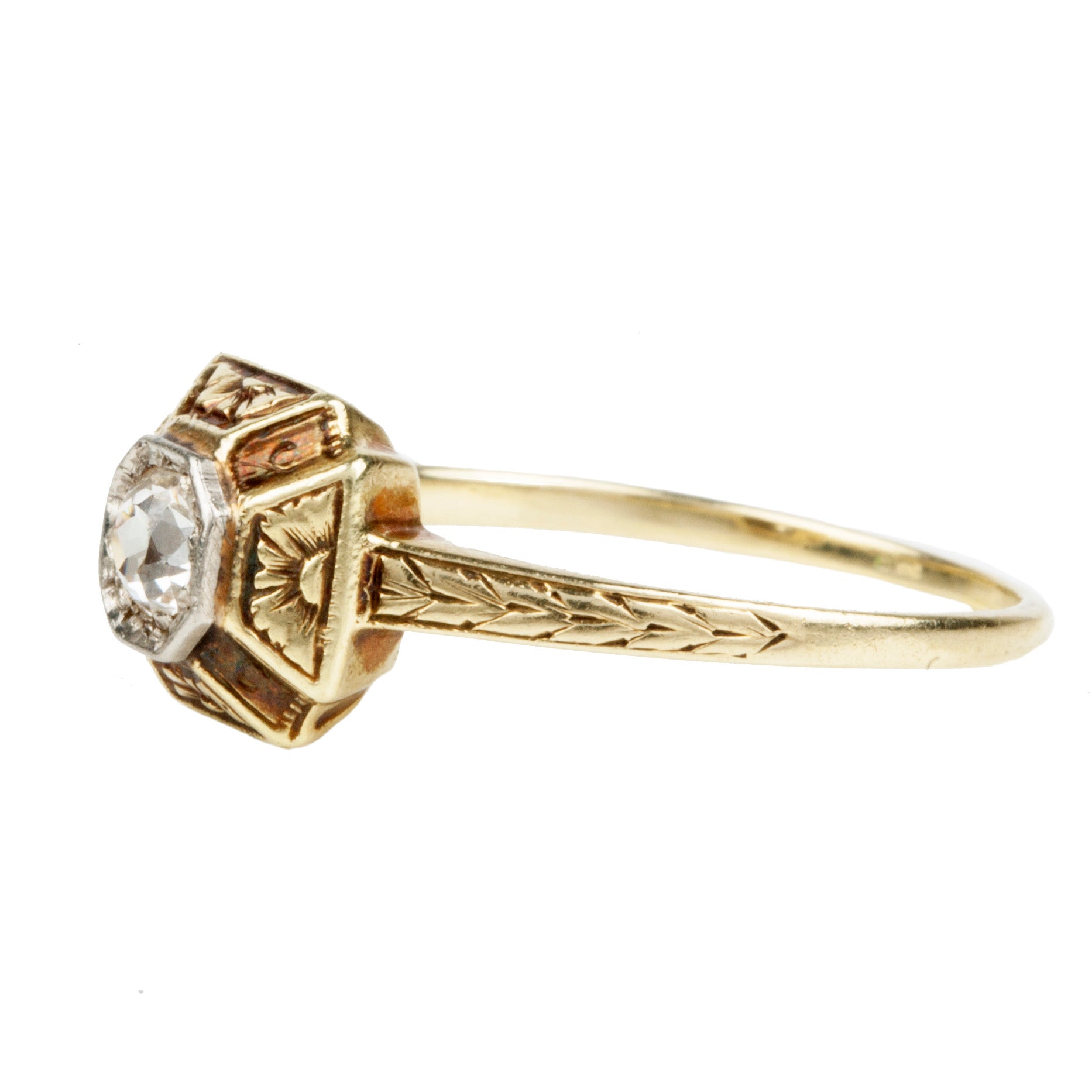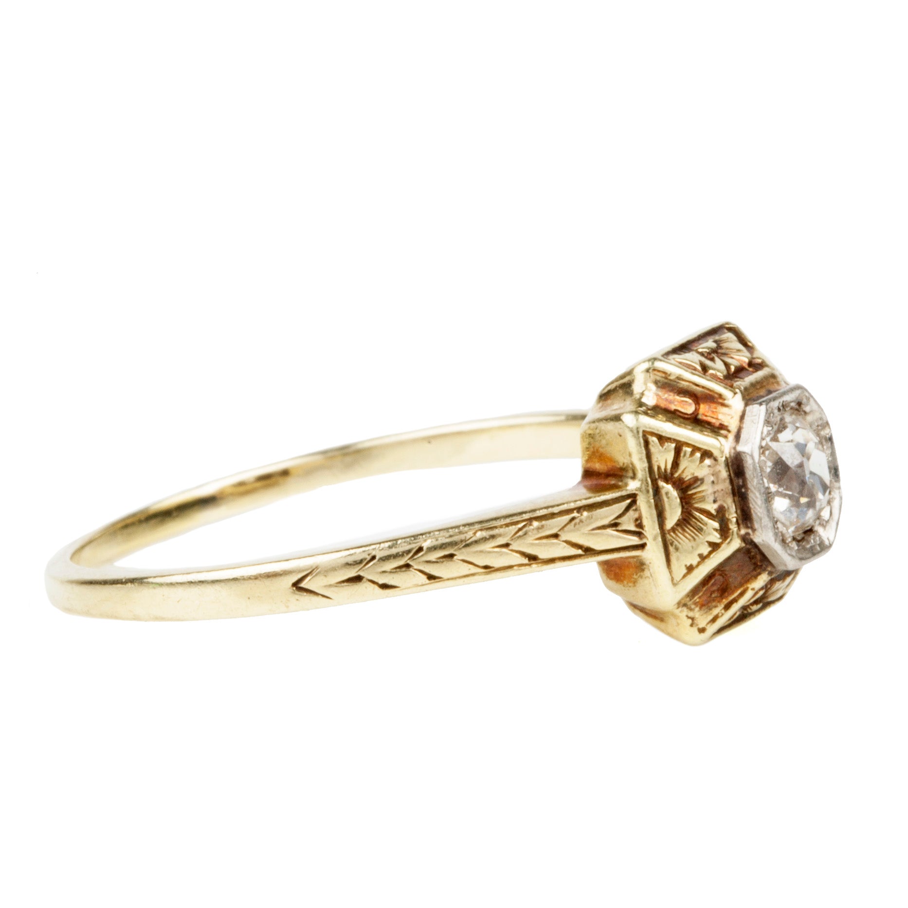Early 20th century engraved gold ring, in 14k yellow. Center diamond is approximately 0.30 carat Old Mine cut diamond, eye clean. Lovely engraved details on solitaire setting and shoulders. American in Origin. Circa 1900.
