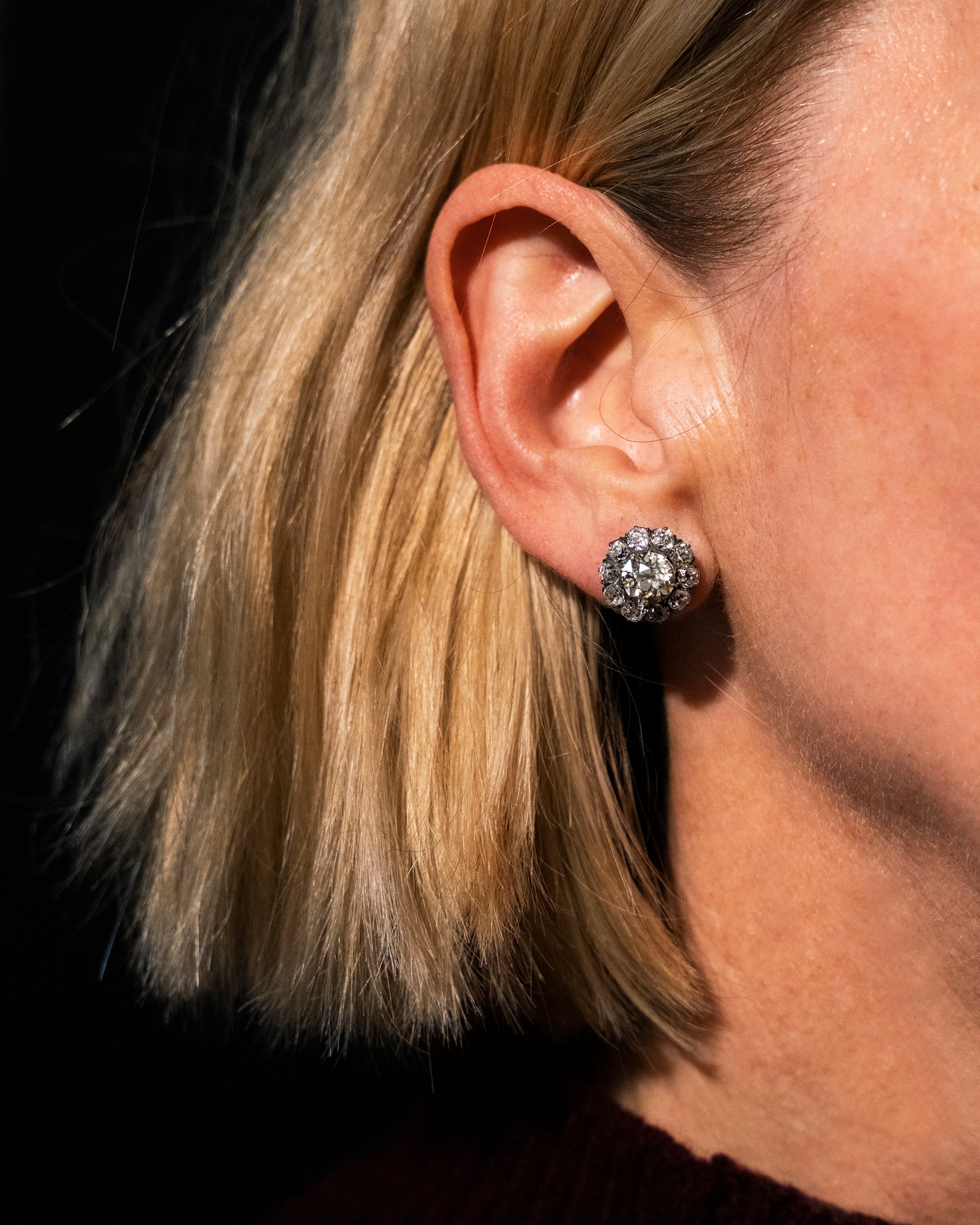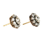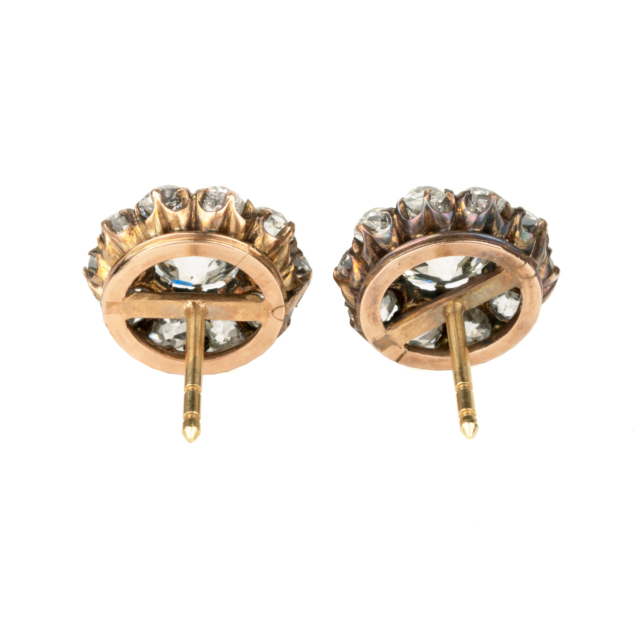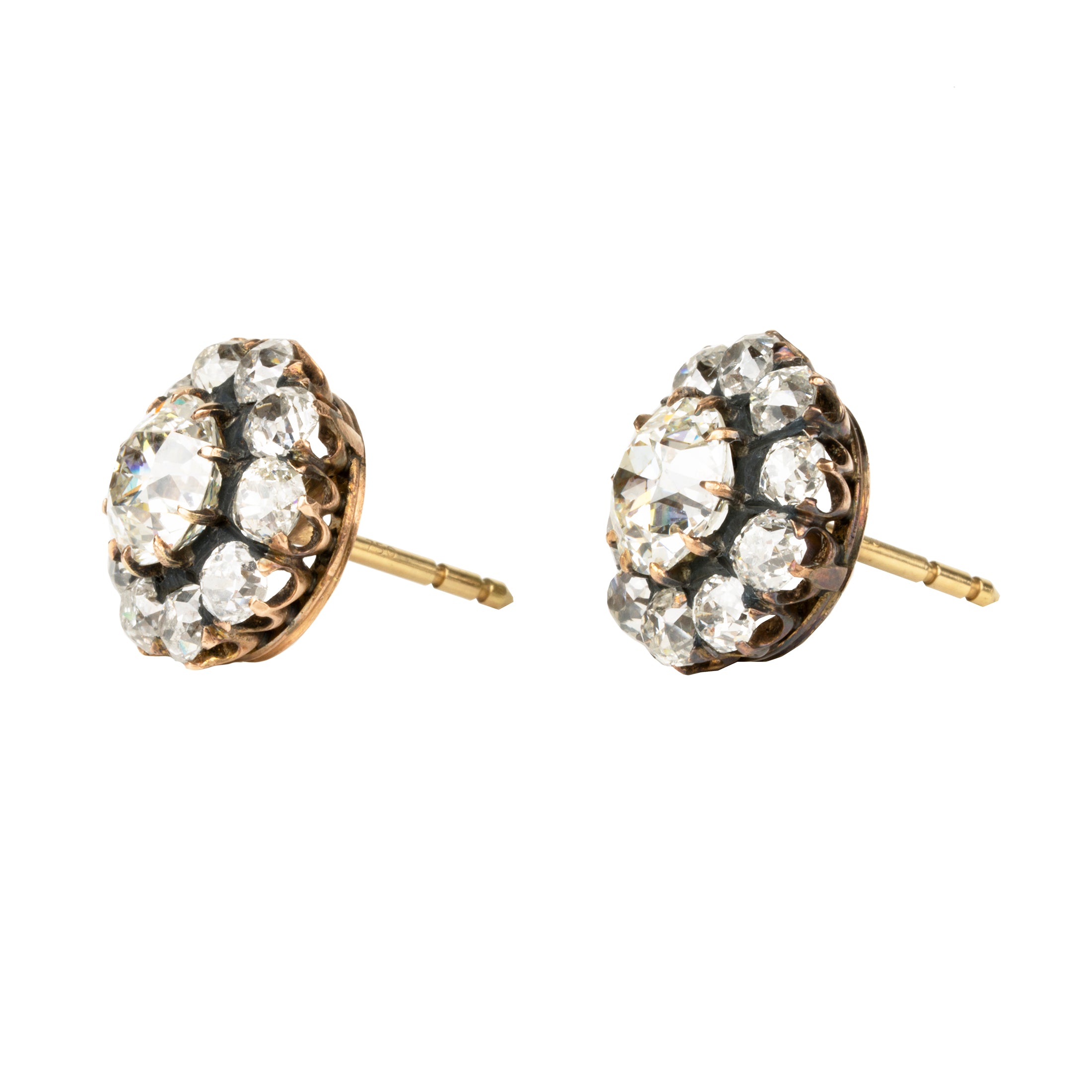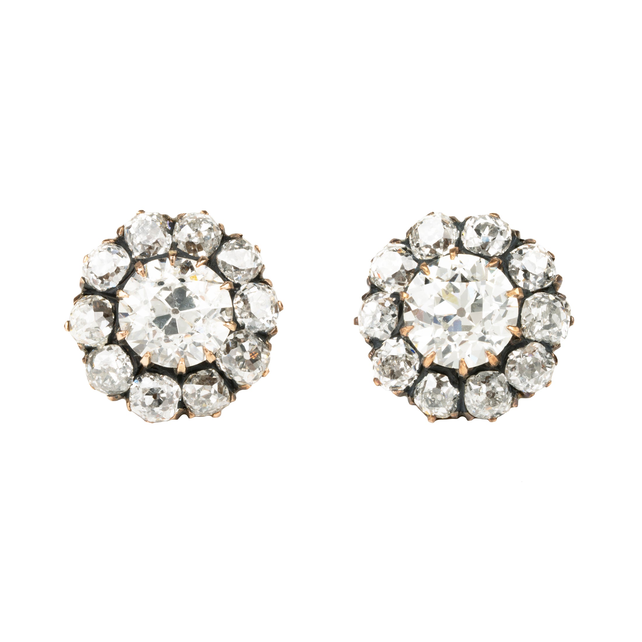 Antique diamond cluster earrings, set in oxidized gold. The primary stones weigh approximately 1.3 carats each. Each stone is surrounded by 10 additional old mine cut diamonds, weighing approximately 2 carats in total weight. Qualities range from J-K color and VS2-S1 clarity. Approx. 4.6 carats in total weight. Circa 1900.
