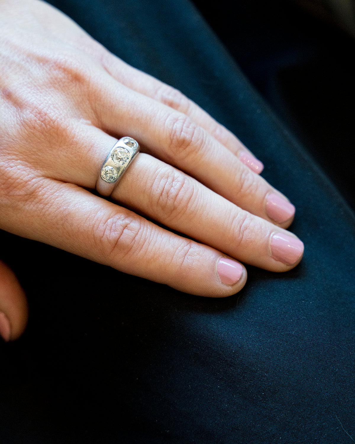 Early 20th Century Platinum Three Stone Ring with Old Mine Cut Diamonds