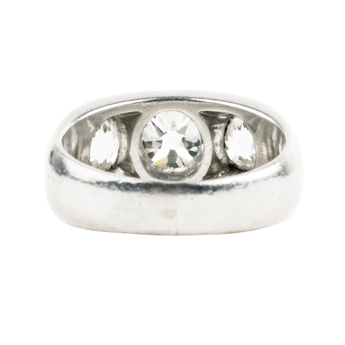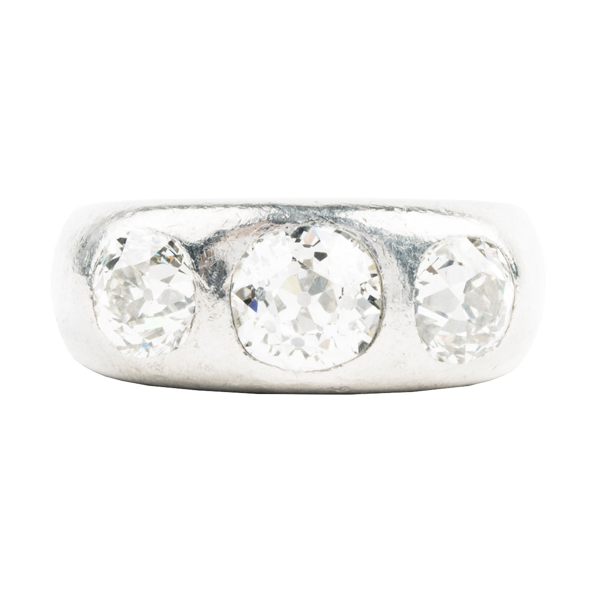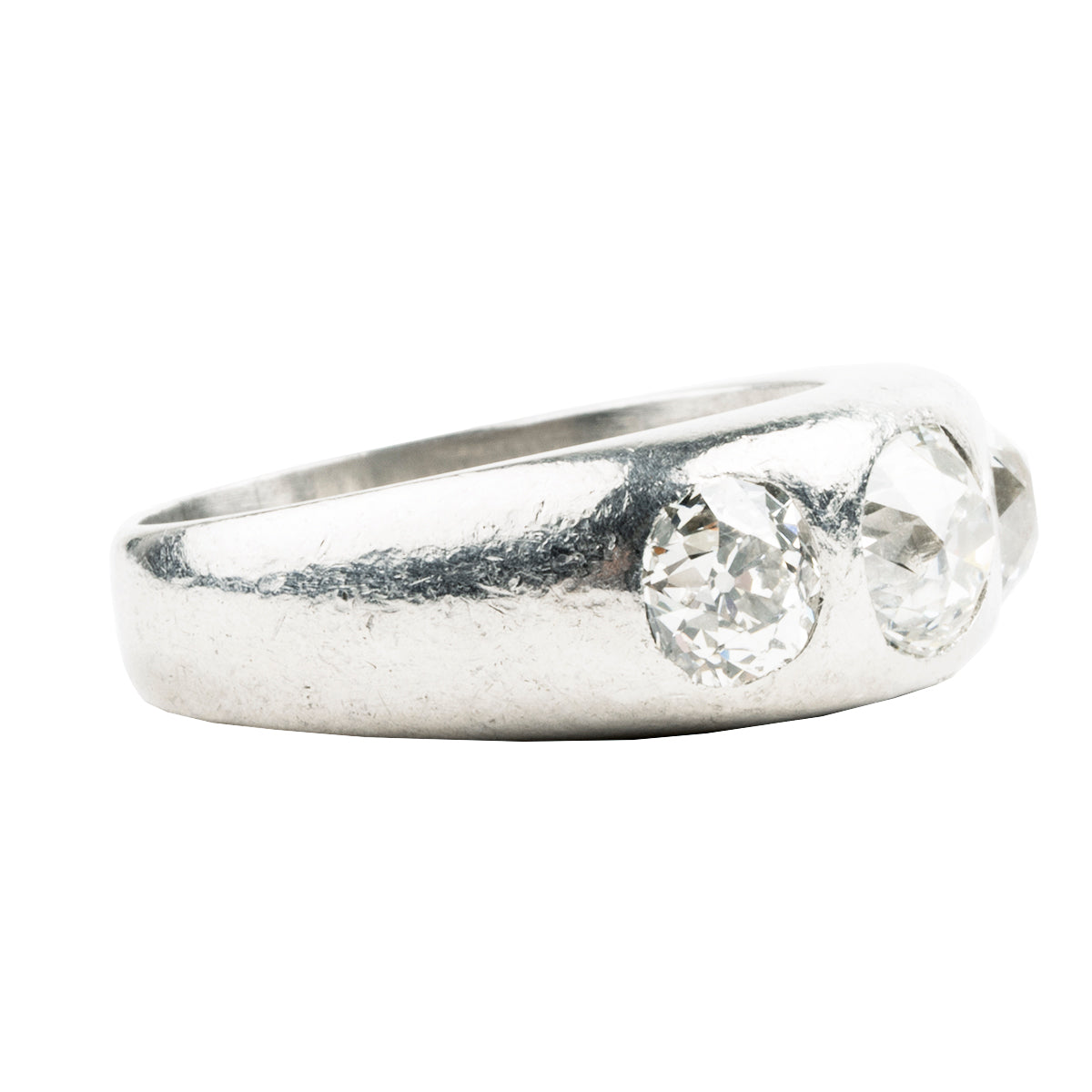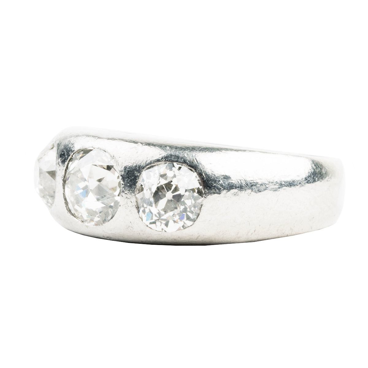 This is a Turn-of-the-Century flush-set old mine-cut diamond three-stone ring in platinum. The center is an approximate 1.00-carat old mine-cut diamond, I/J color, and SI1 clarity. The side diamonds are approximately .75 carats each, I/J color, and SI1/SI2 clarity. Approximate total diamond weight is 2.5 carats. English in origin. Circa 1920.