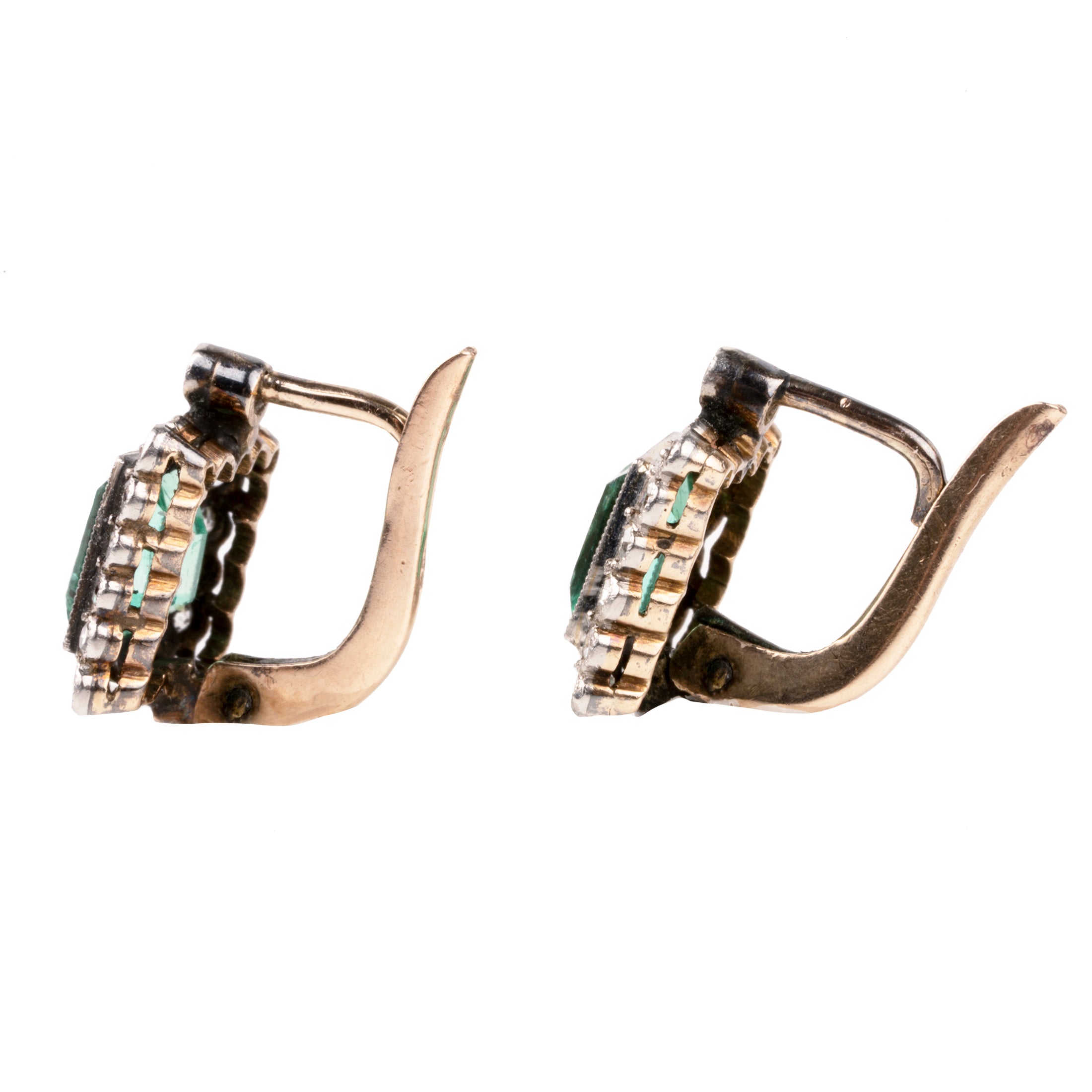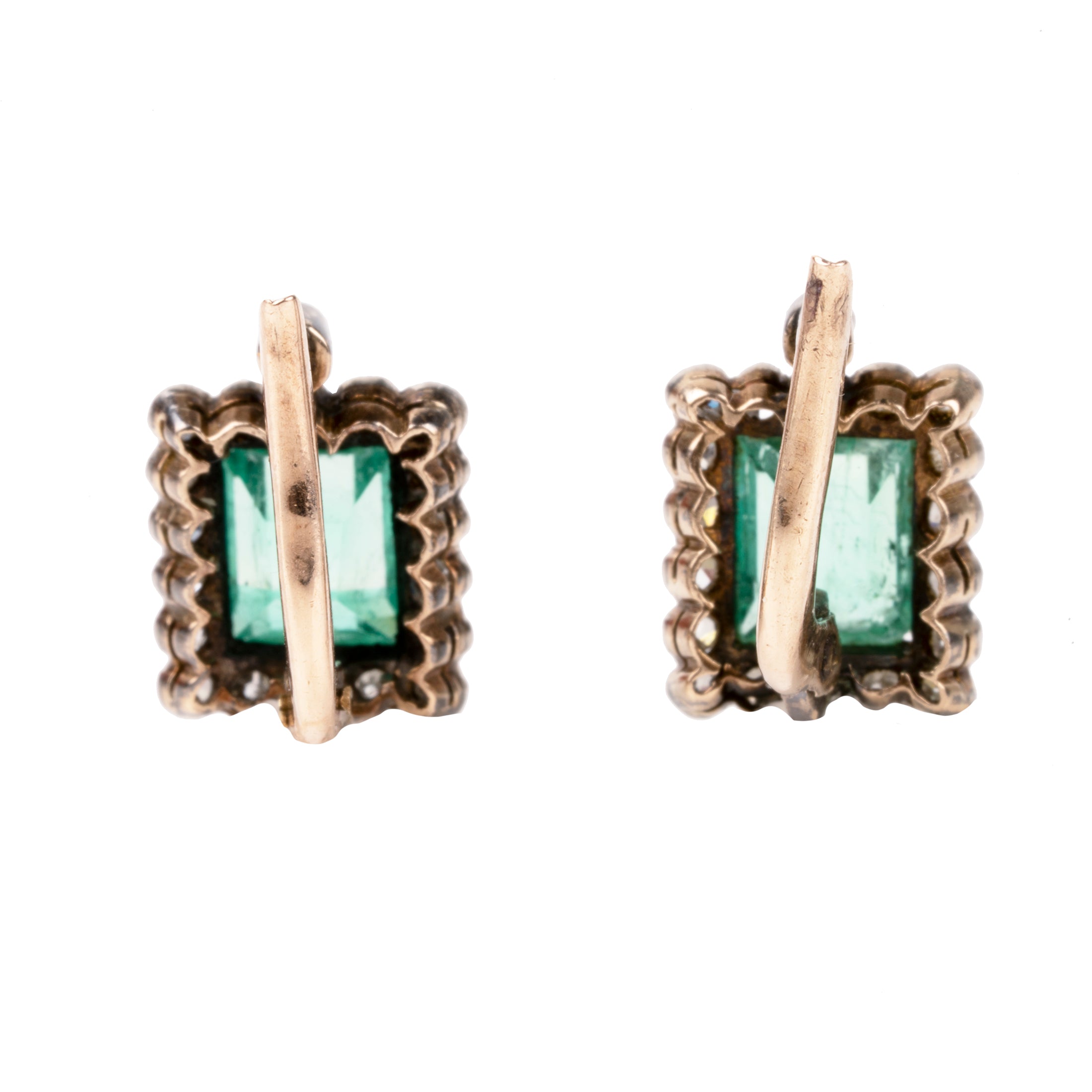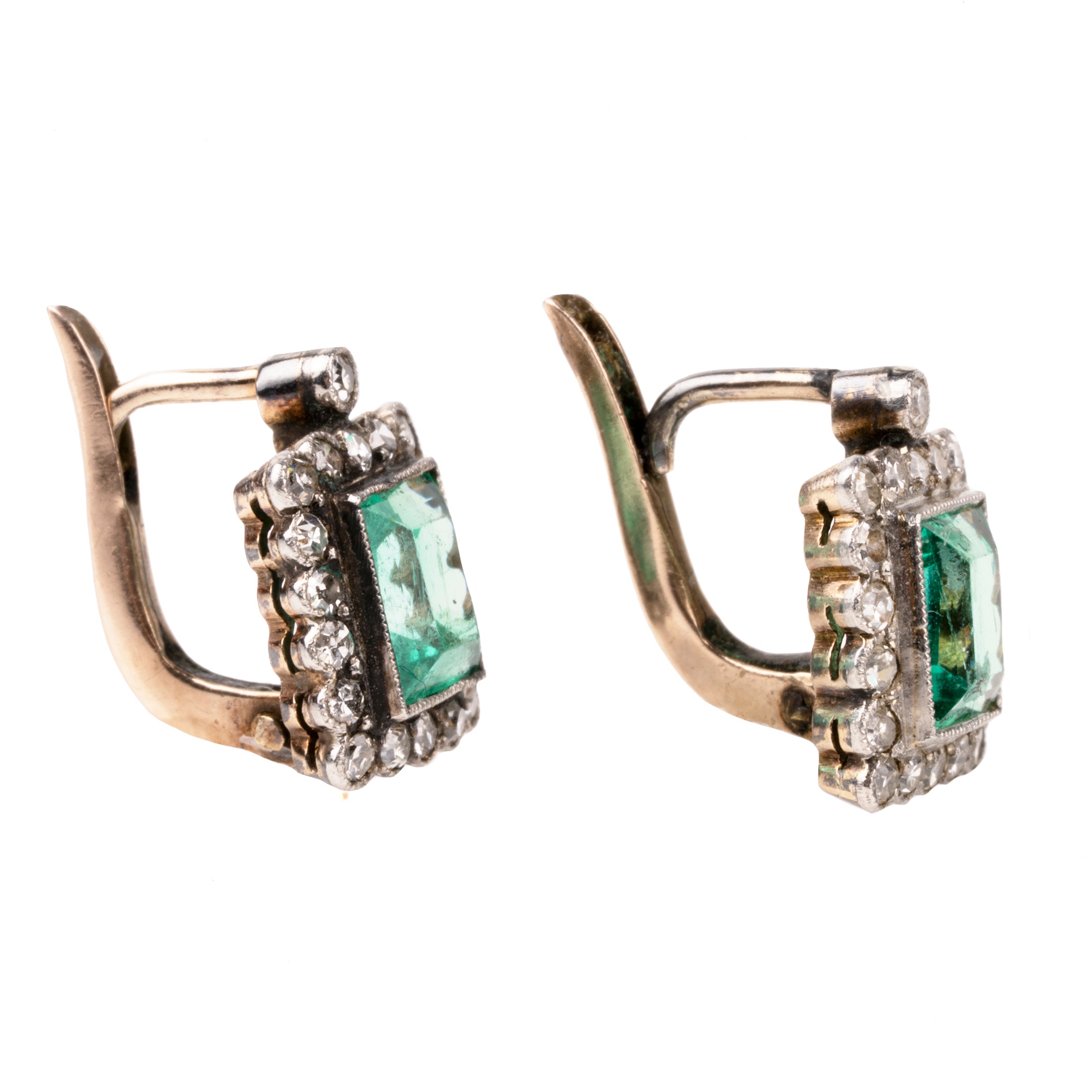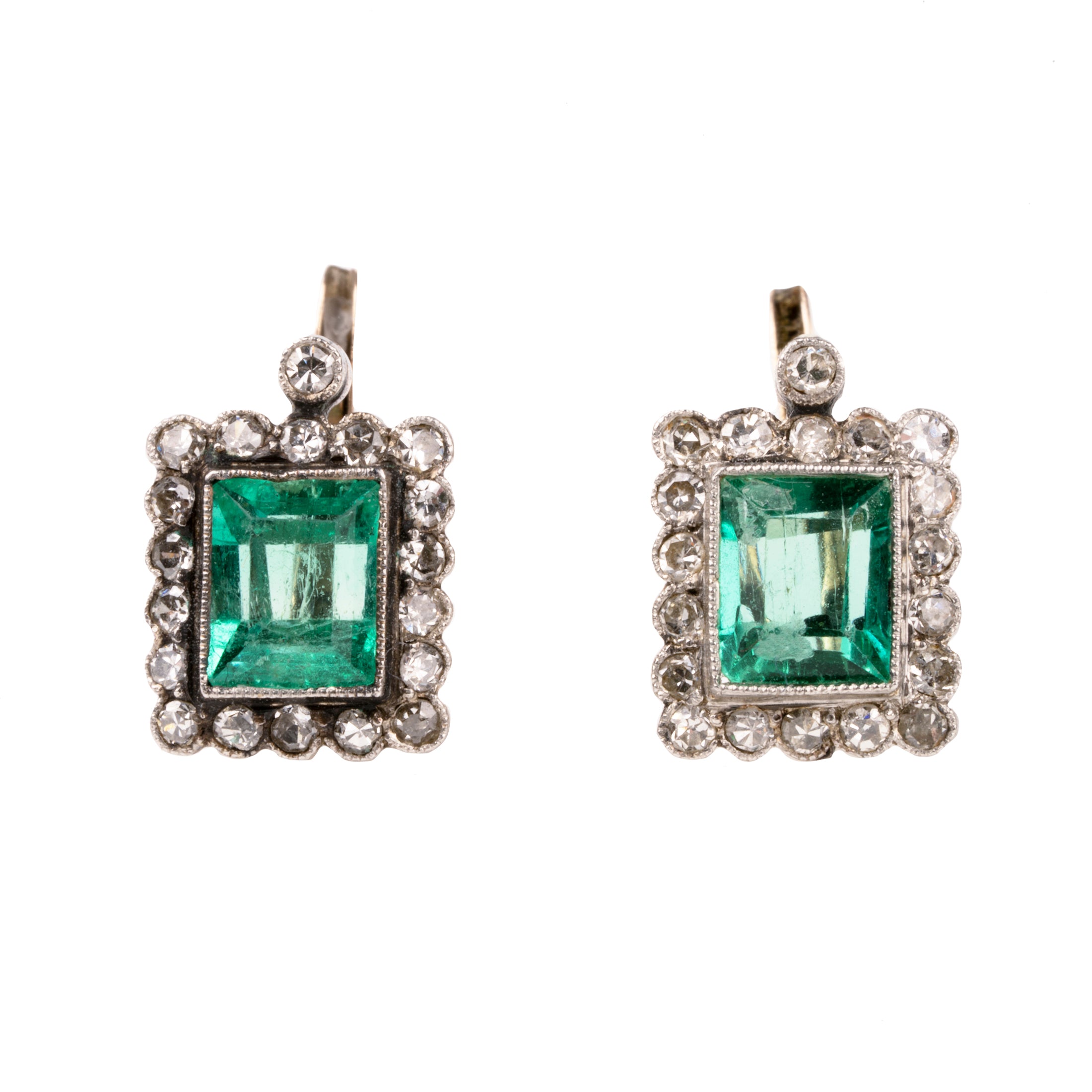 Early 20th century emerald and diamond cluster earring, in sliver topped yellow gold settings. Emerald cut emeralds framed by single cut diamonds.