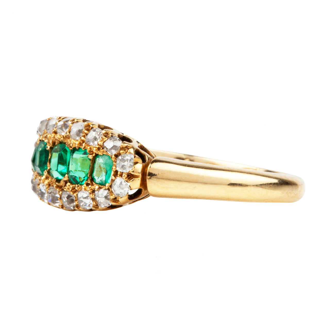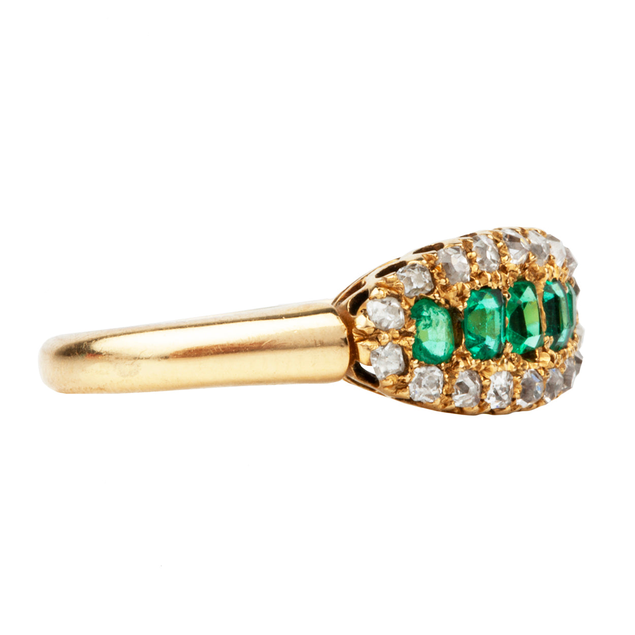 Early 20th century emerald and diamond five stone ring, in 18k gold. Five cushion cut emeralds surrounded by single cut diamonds. English in origin. Circa 1900.