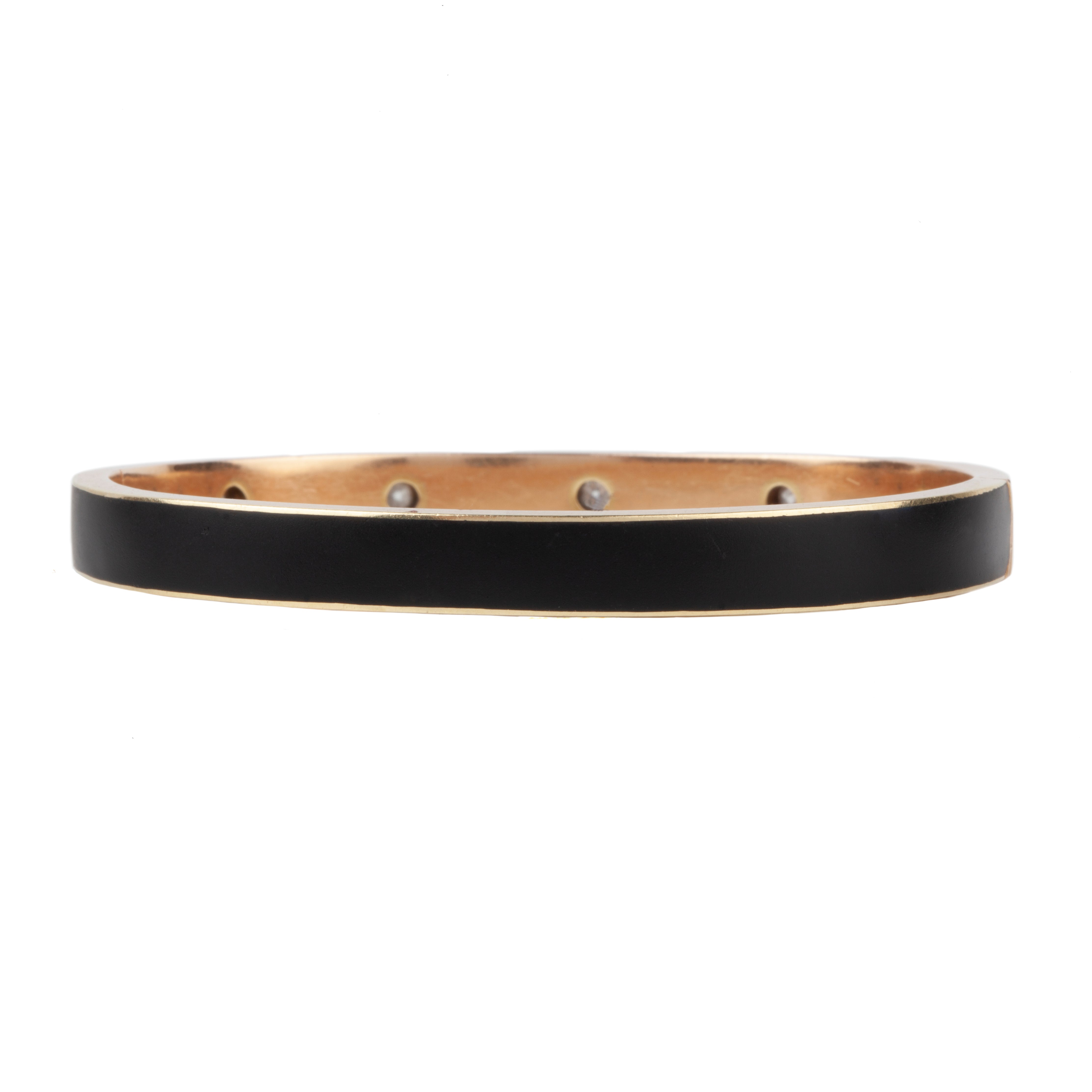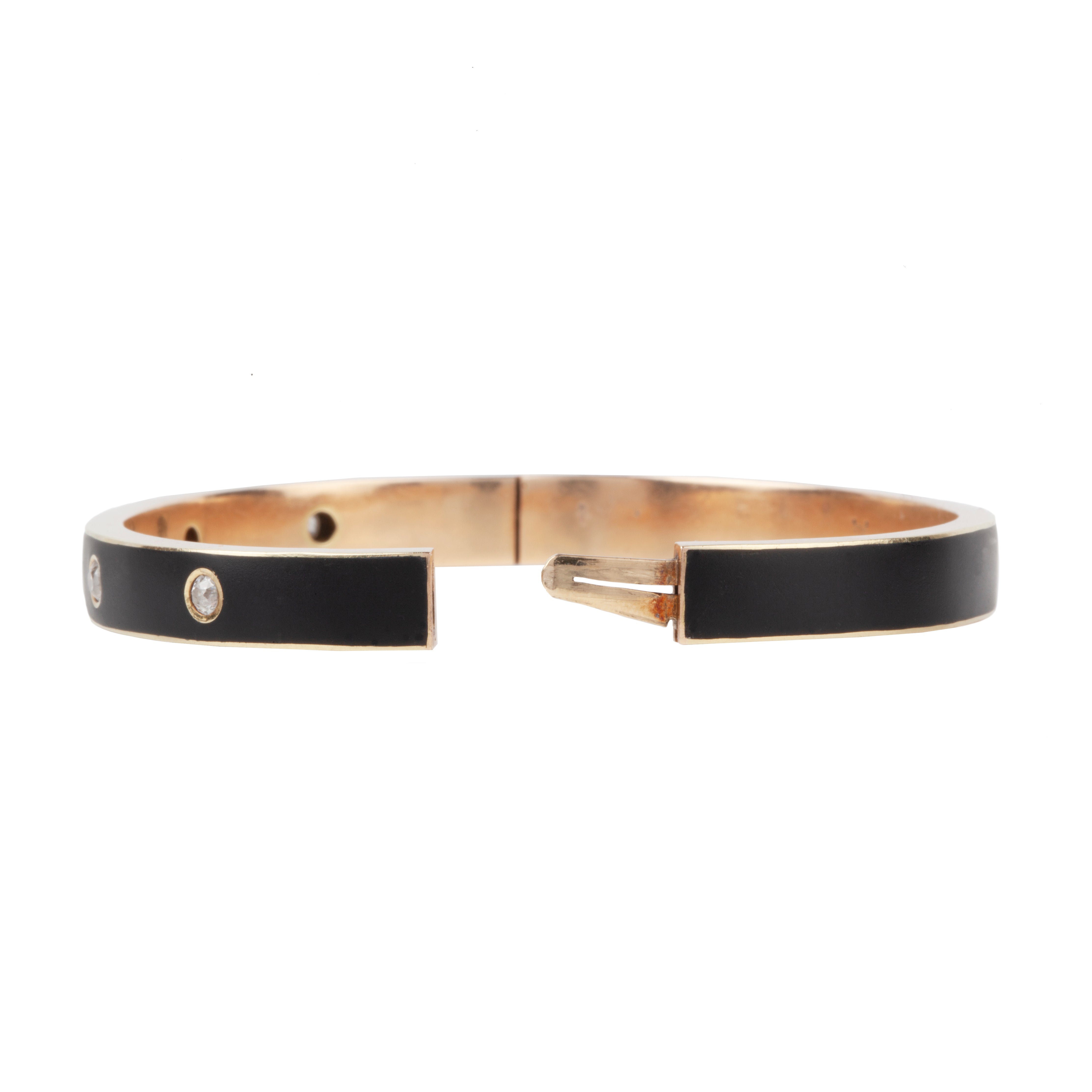 Black enamel and diamond bangle, in 14k gold Five flush set old European cut diamonds sparkle from the black background. Approximately 1 carat in total diamond weight. The enamel has a lovely matte finished. Circa 1900, American in Origin.