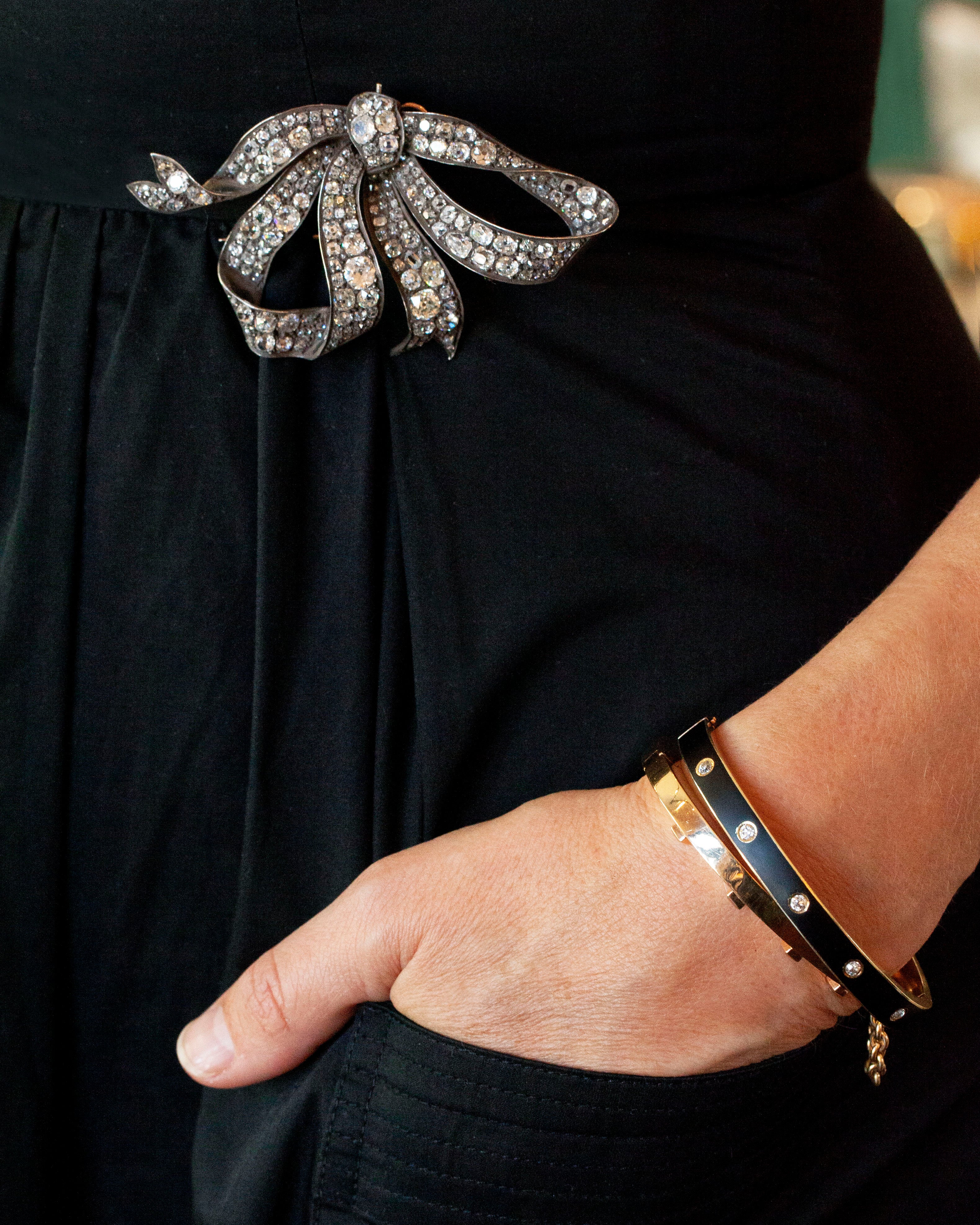 Bangle paired with Victorian diamond bow brooch and our handmade diamond horseshoe bracelet.