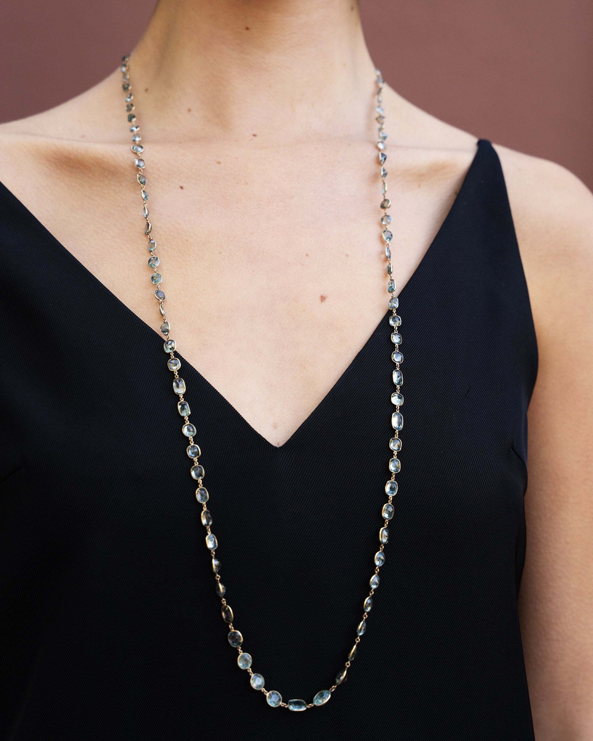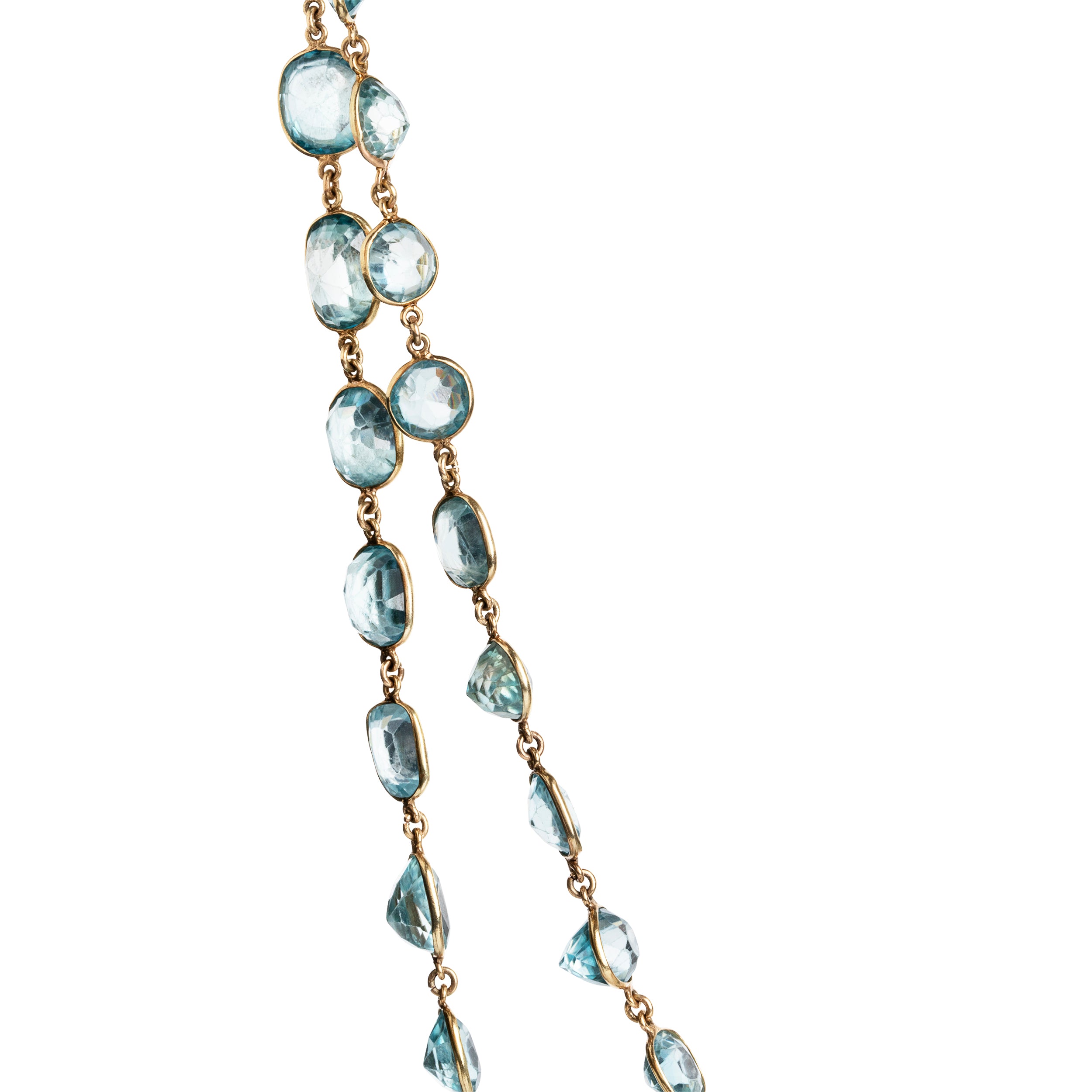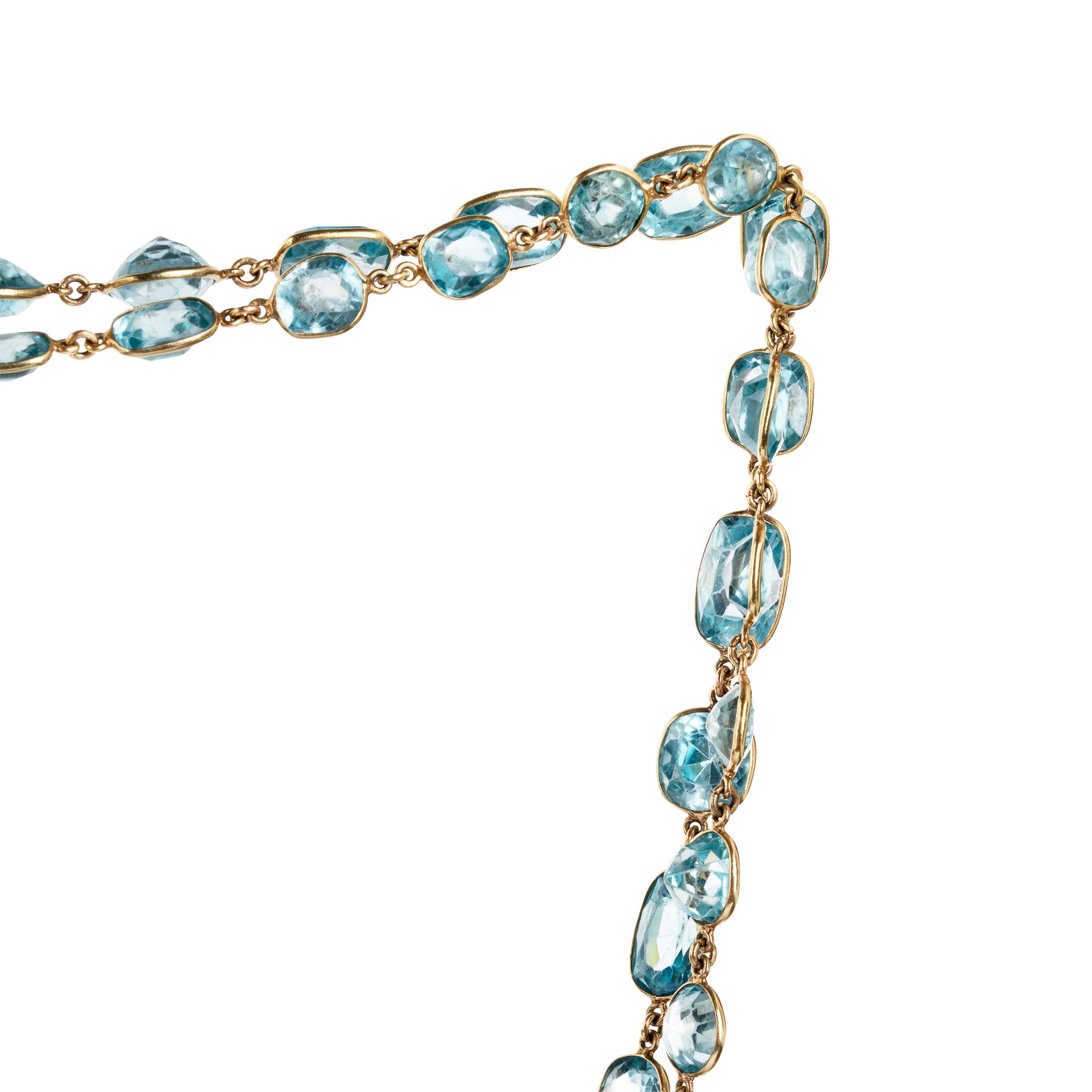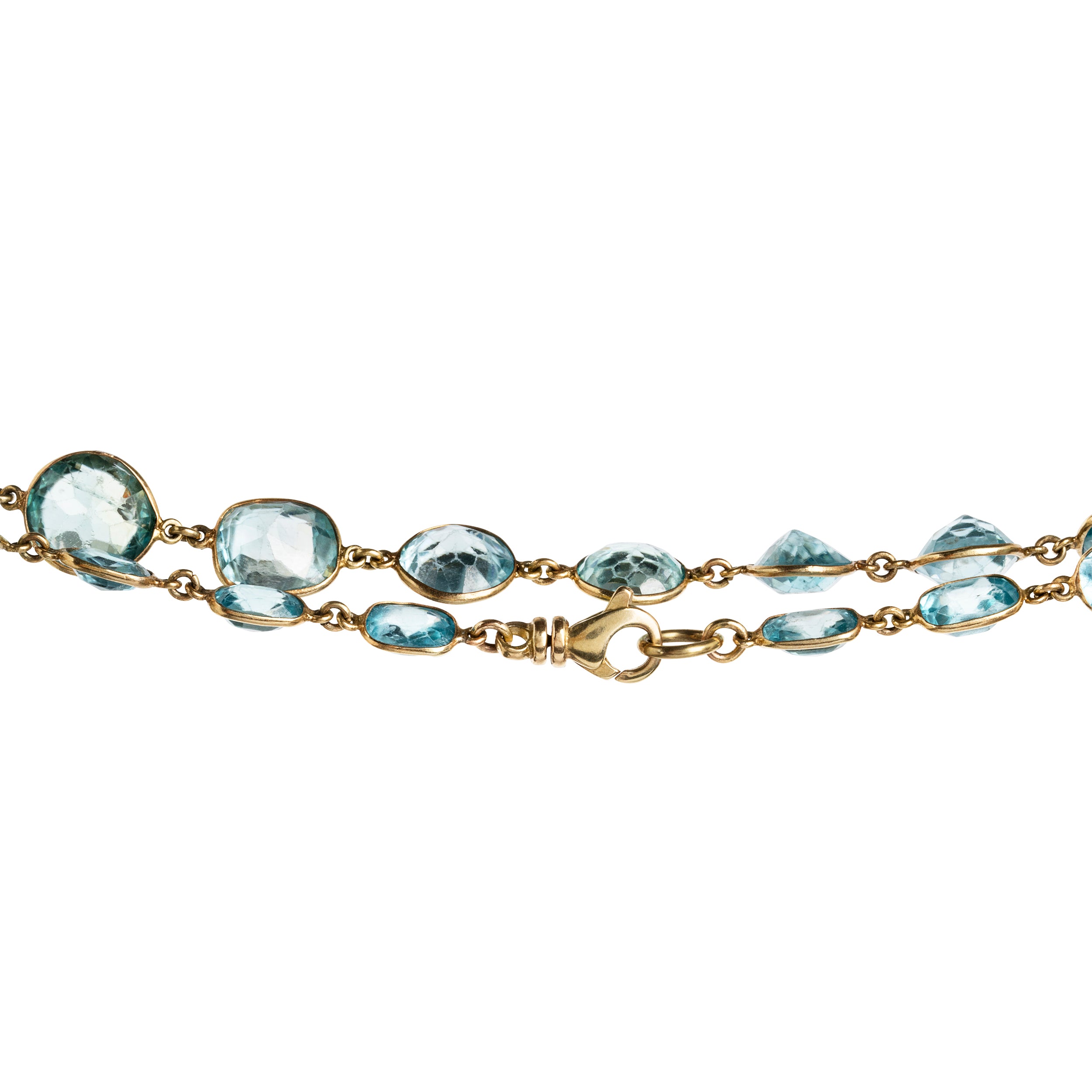 Set in 18k yellow gold. The chain necklace has varied-shaped gemstones in a vibrant aqua color. The gemstones are approximately 110 carats in total weight.
