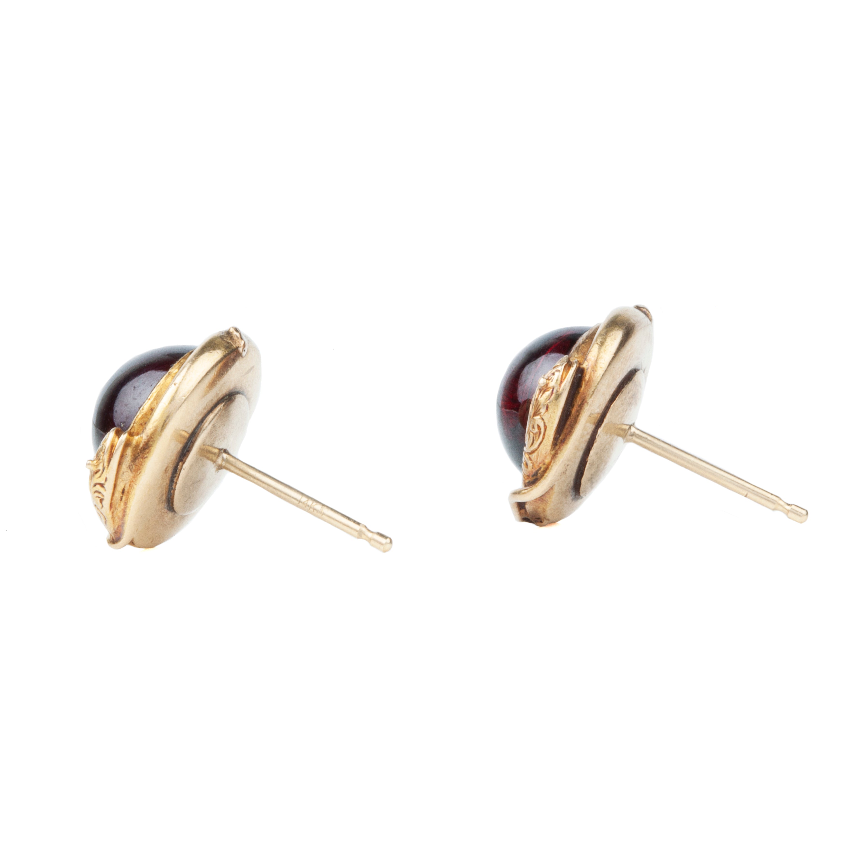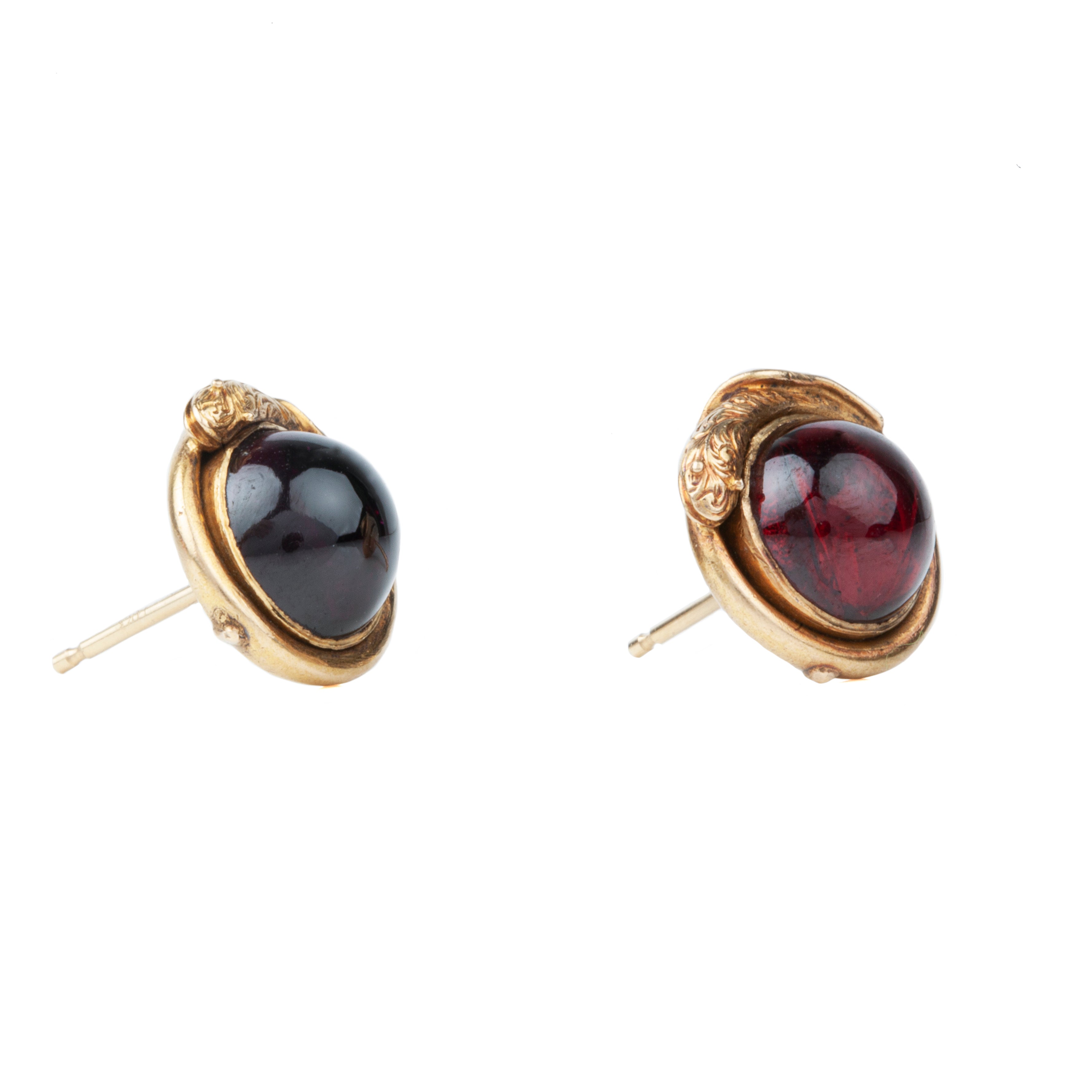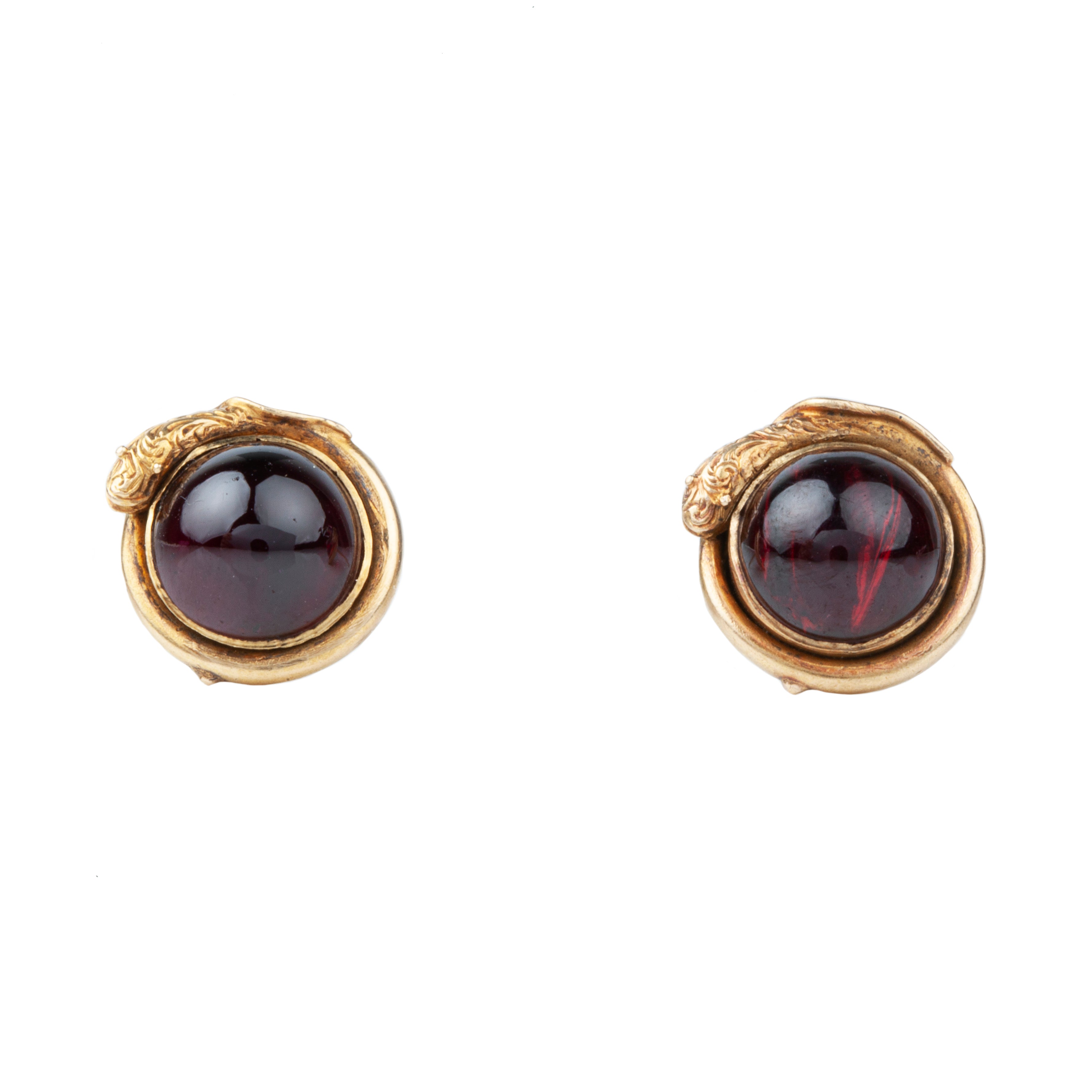Late Victorian Era earrings, each with a cabochon garnet encircled by a snake. Set in 15k gold. The snakes have hand engraved details. Likely a later conversion from cufflinks or buttons. English in origin. Circa 1890.