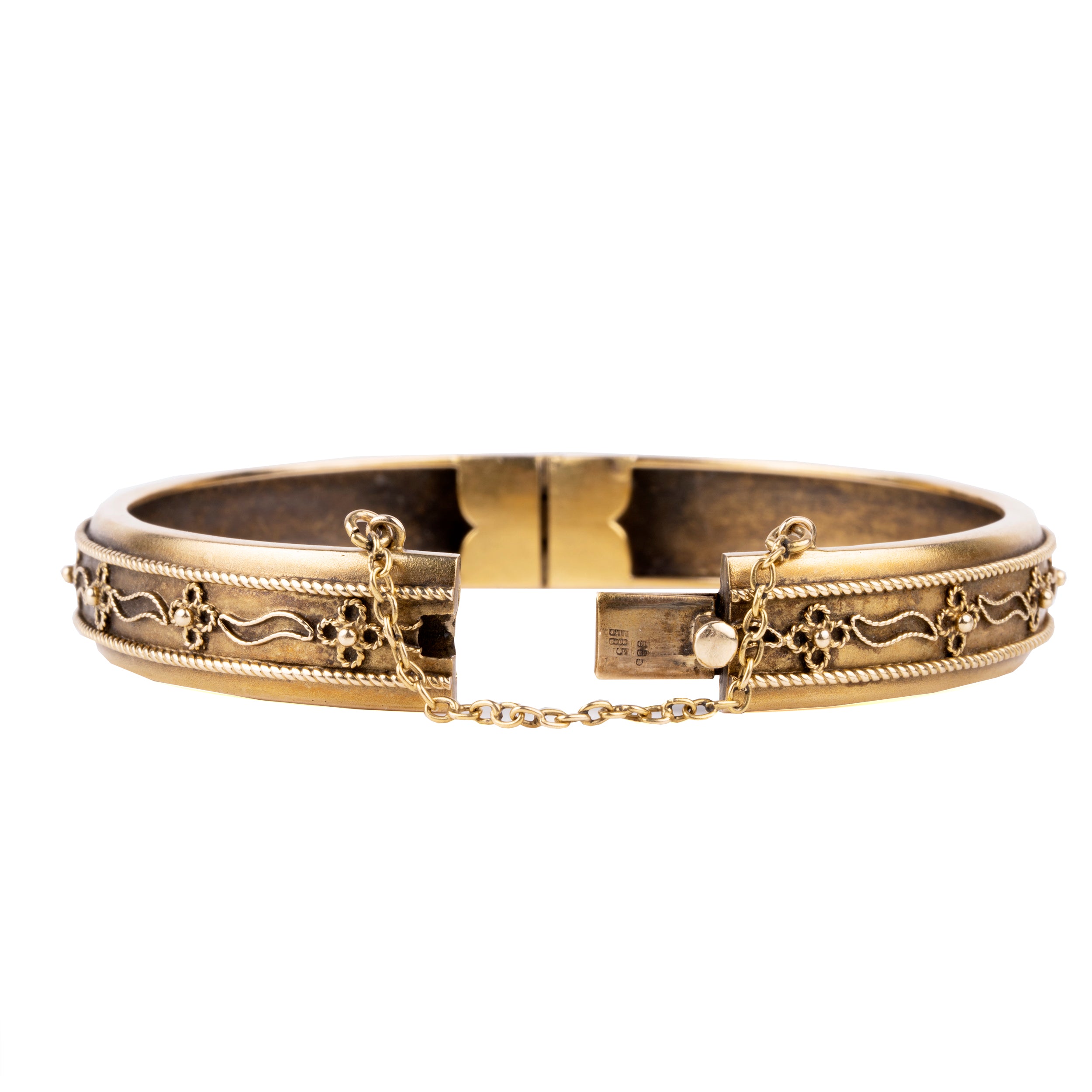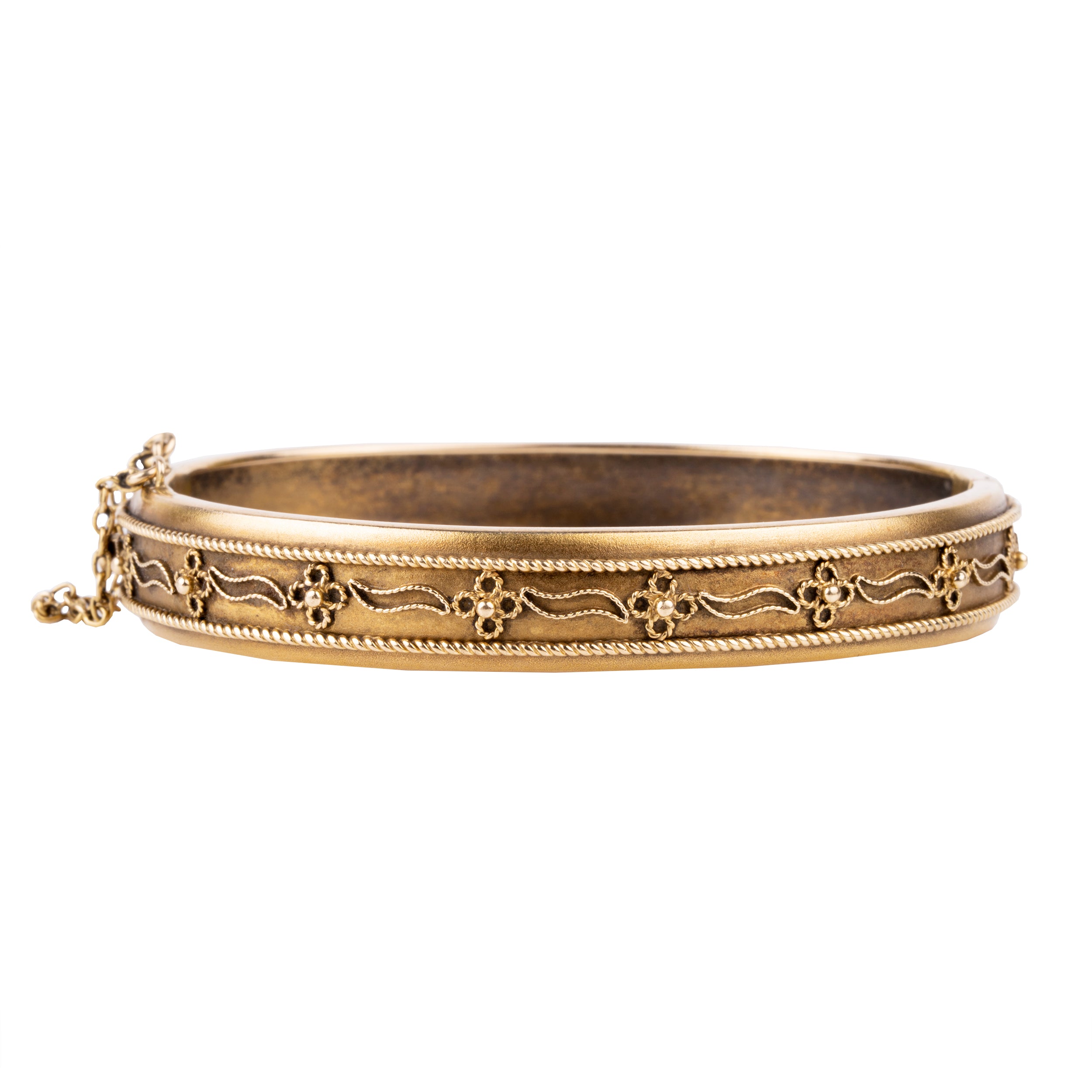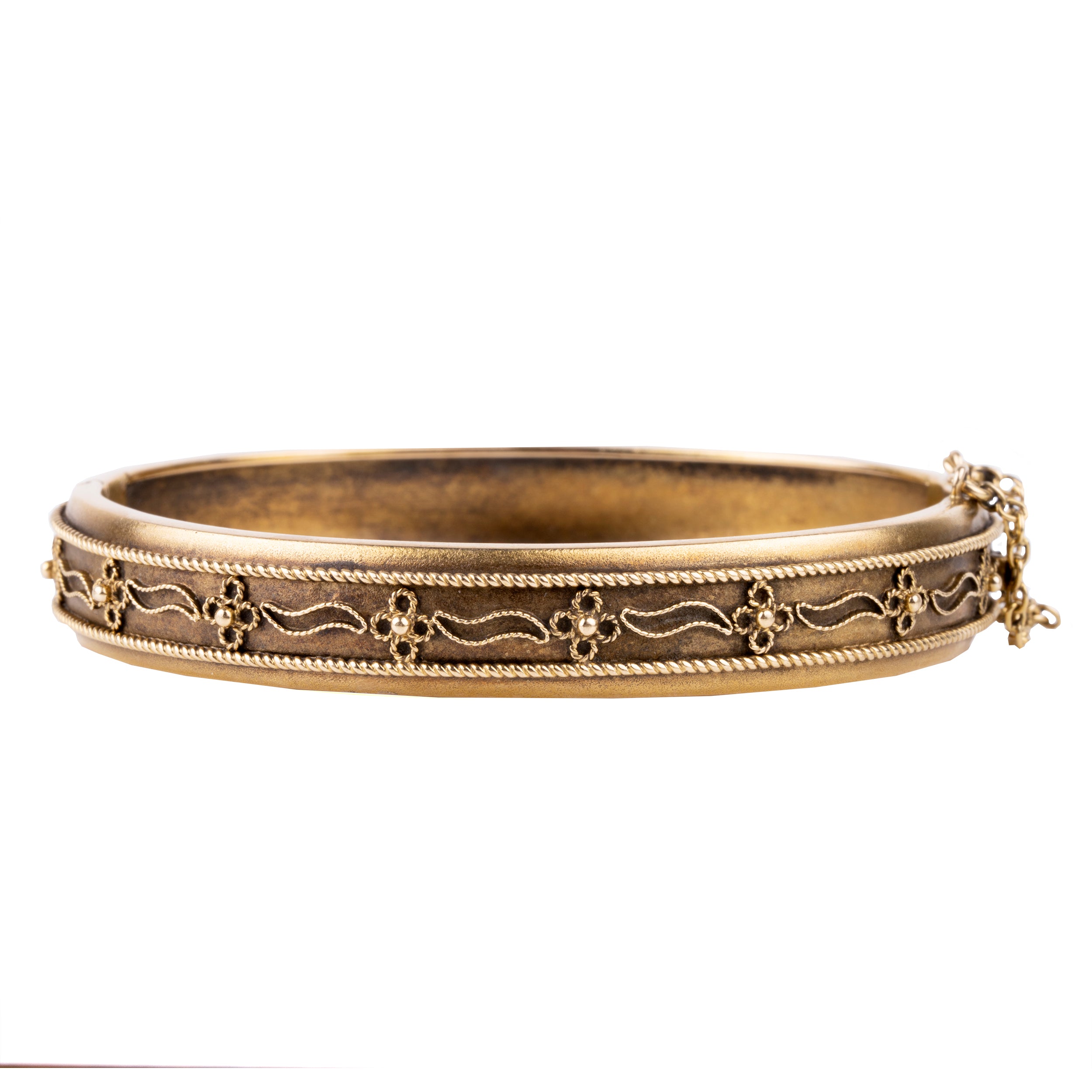 Early 20th century gold Etruscan revival bangle bracelet, in 15k gold. English in origin. Circa 1920.