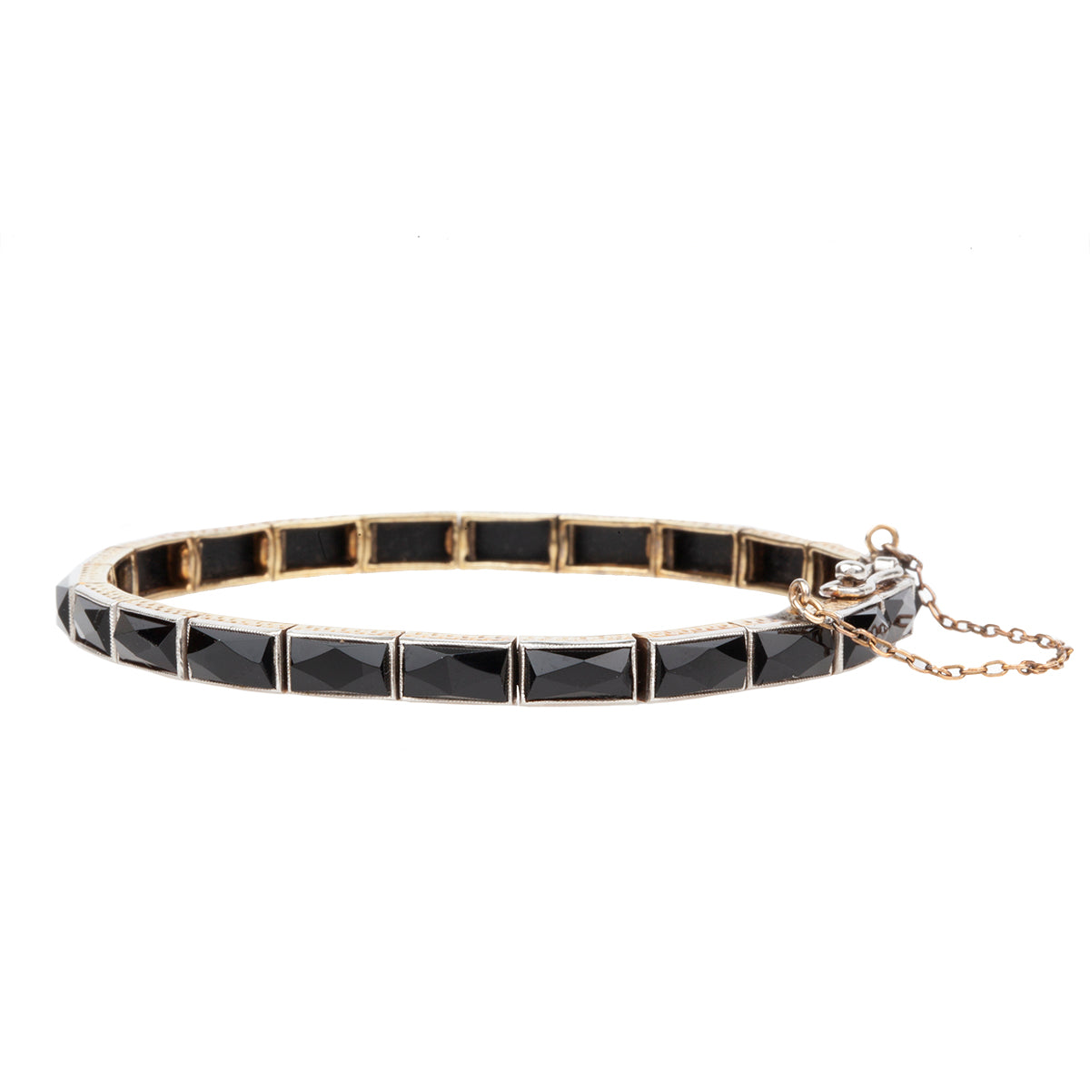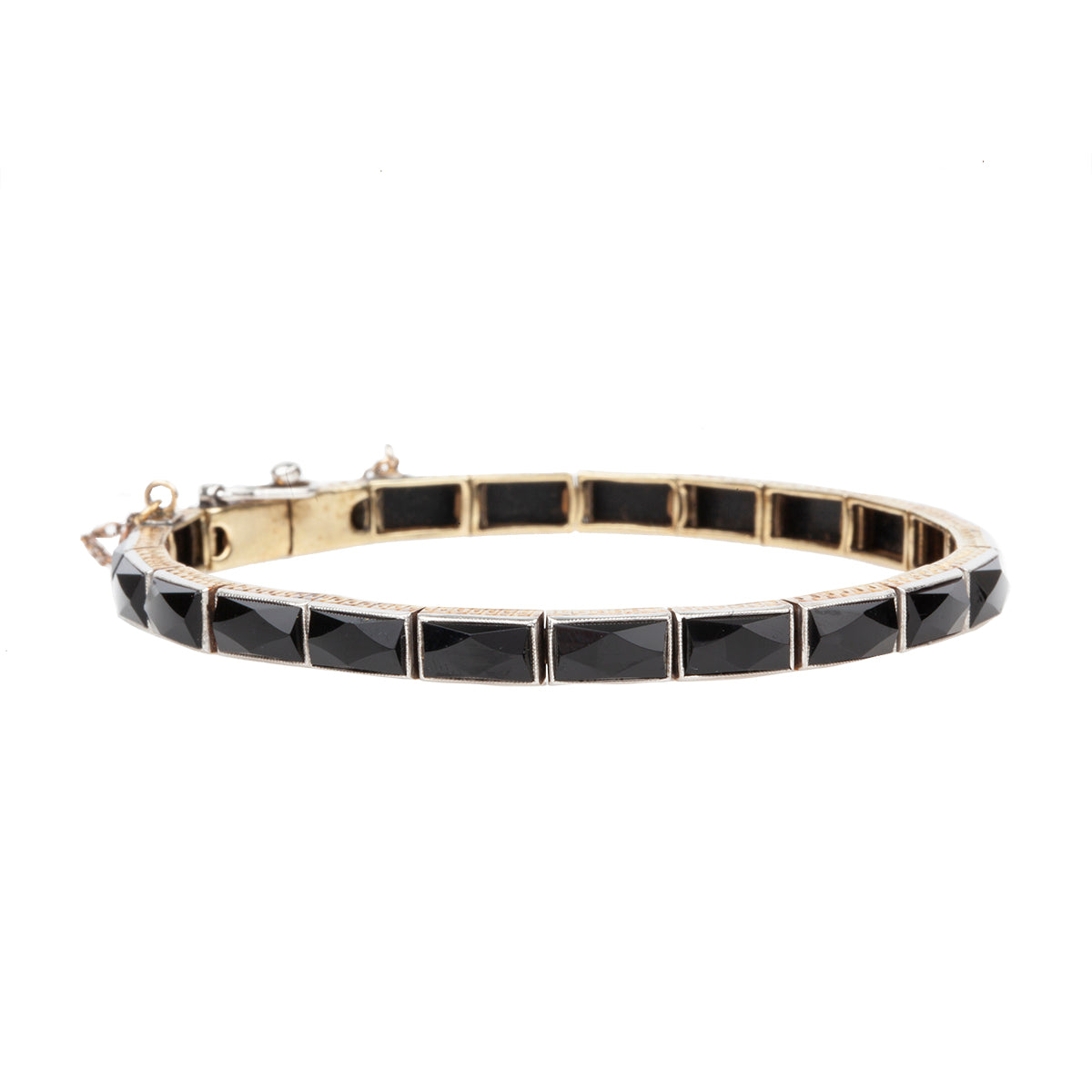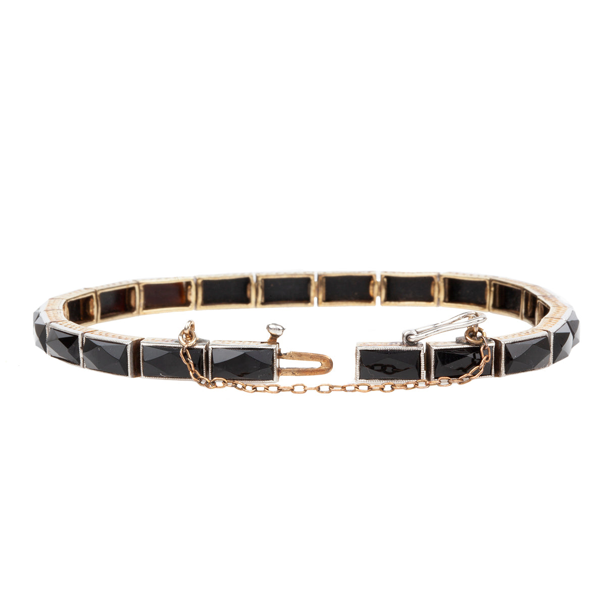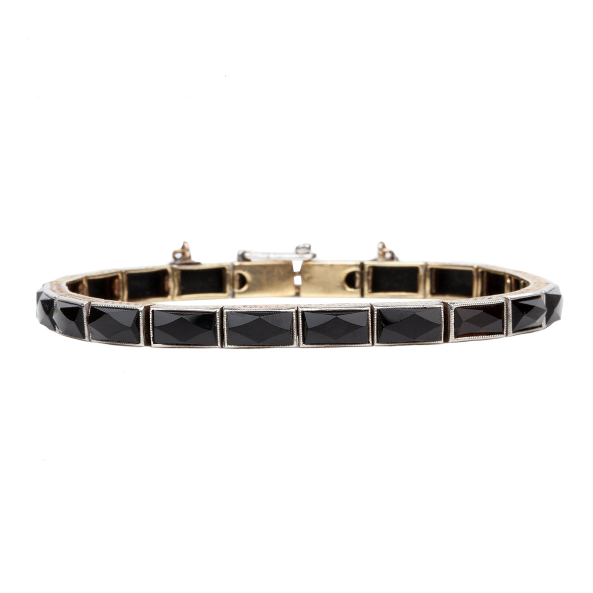 Early 20th century facetted onyx link bracelet. Each stone is set in platinum topped gold setting. English in origin. Circa 1910.