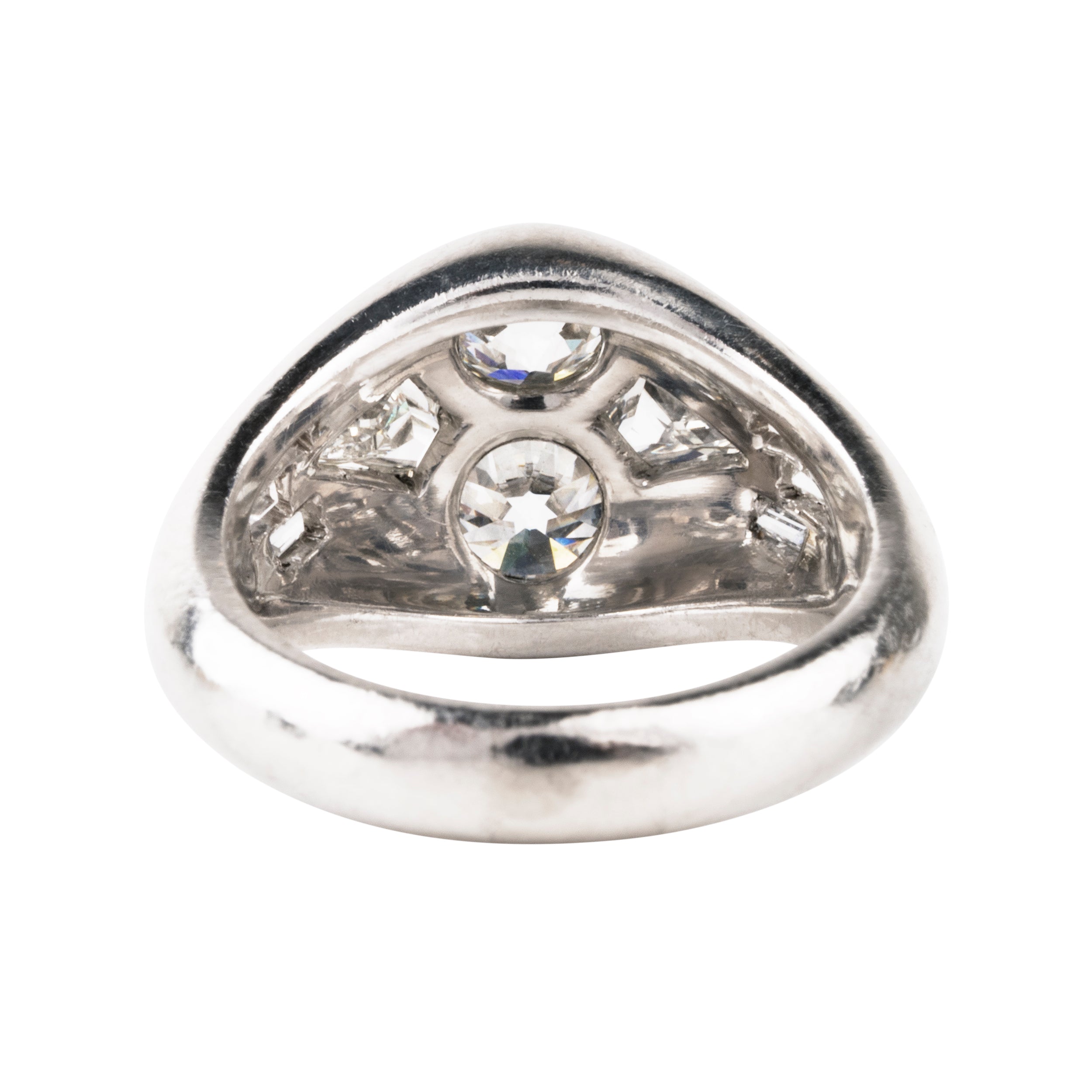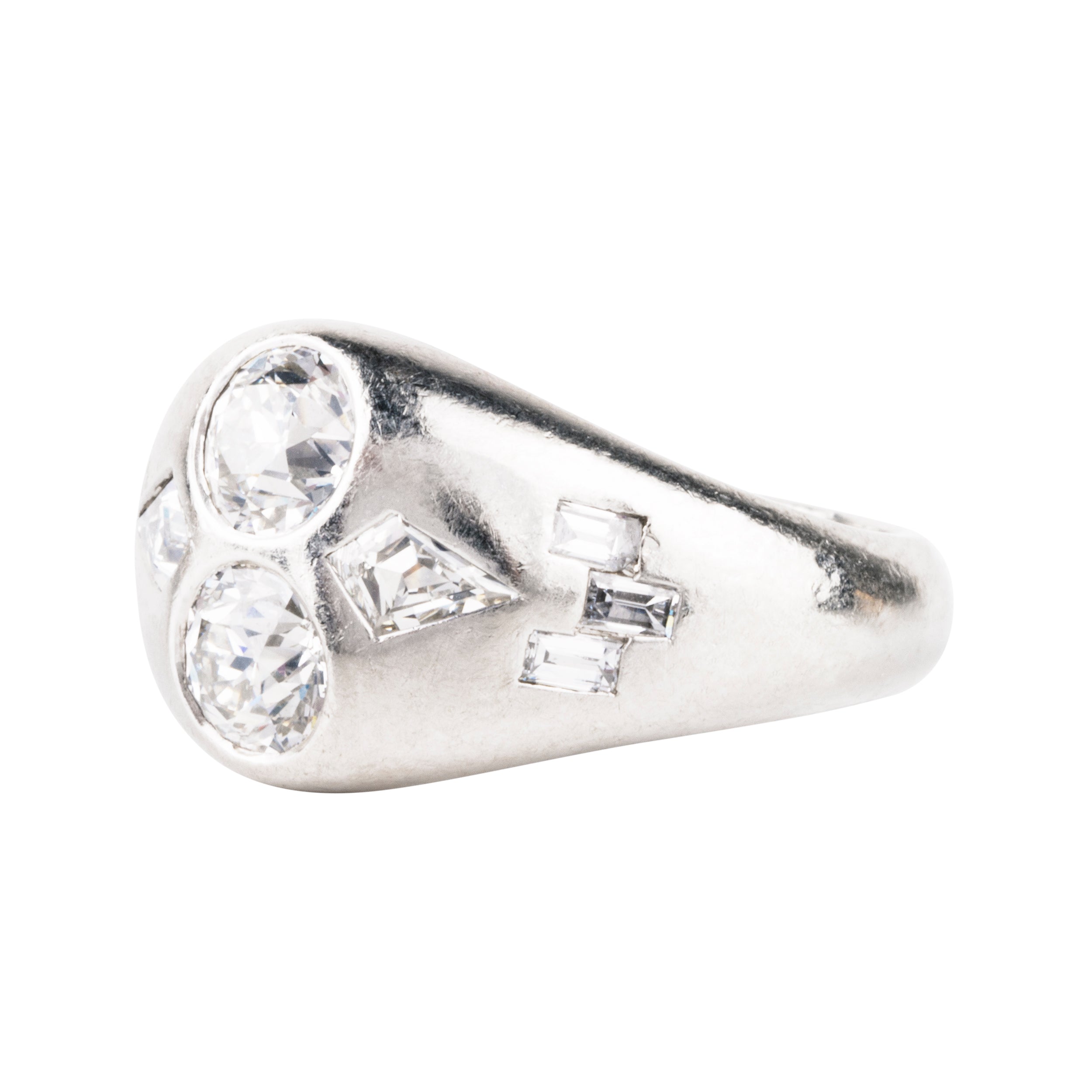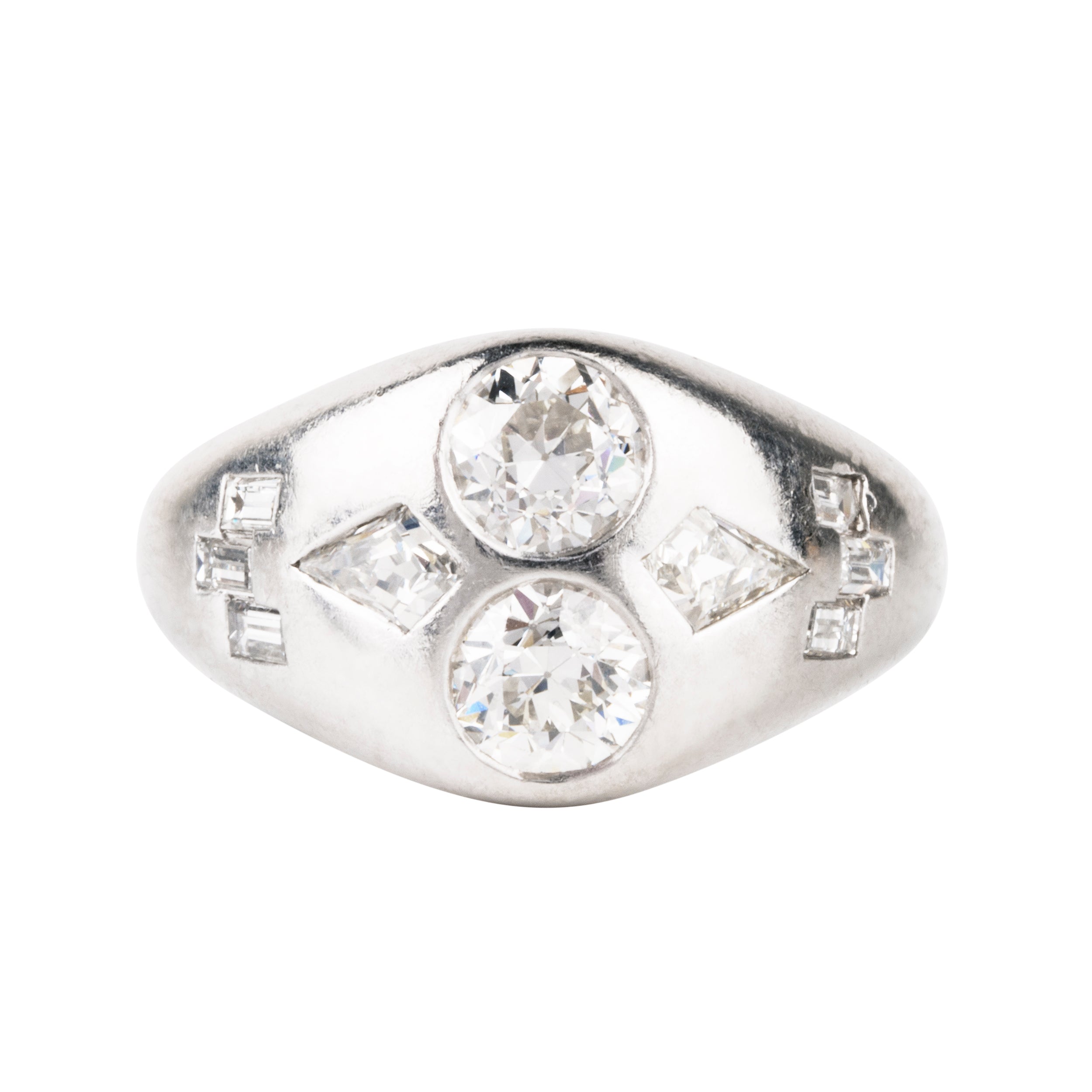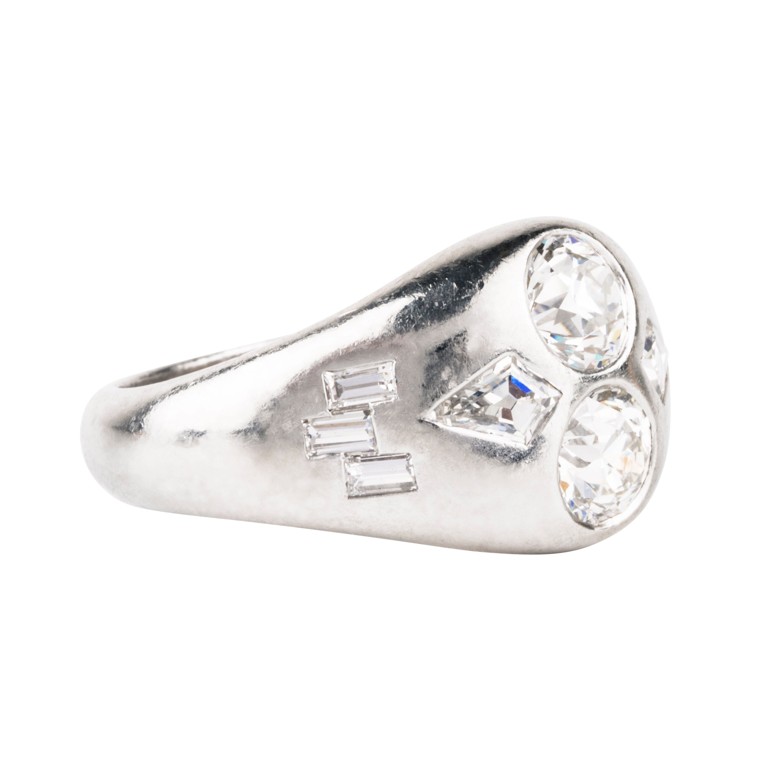 Early 20th century diamond flush set ring, in platinum. A mixture of old European cut and fancy cut diamonds in a mosaic pattern. Circa 1920.