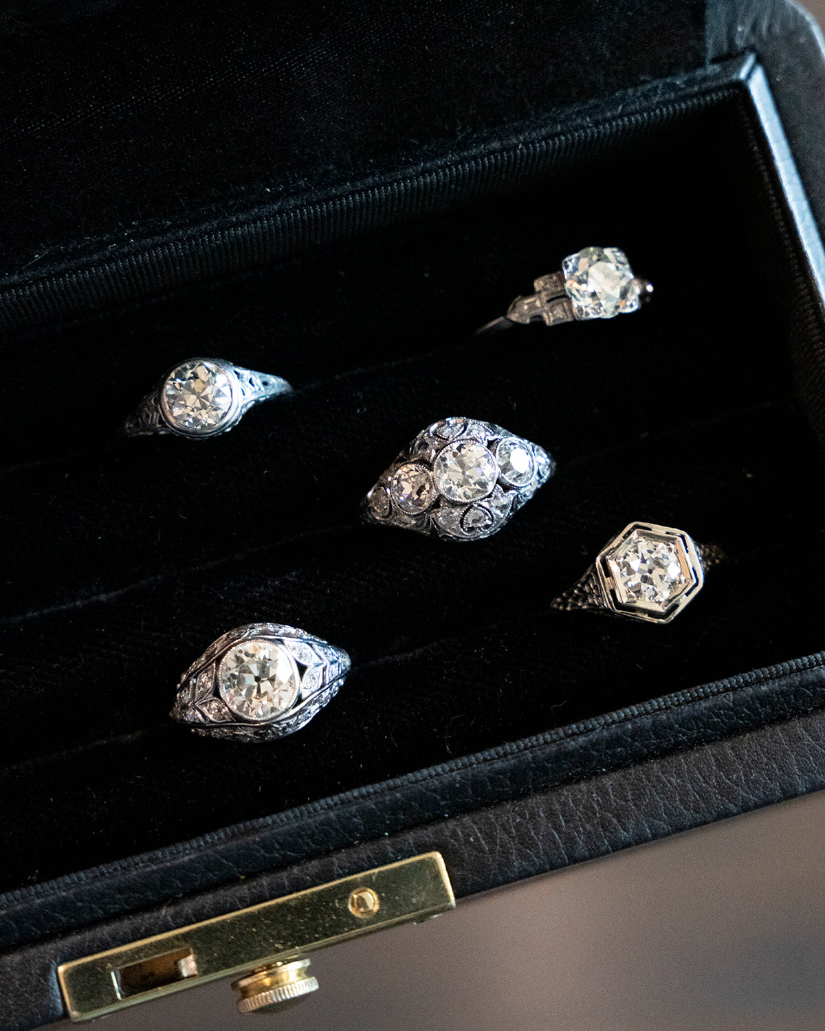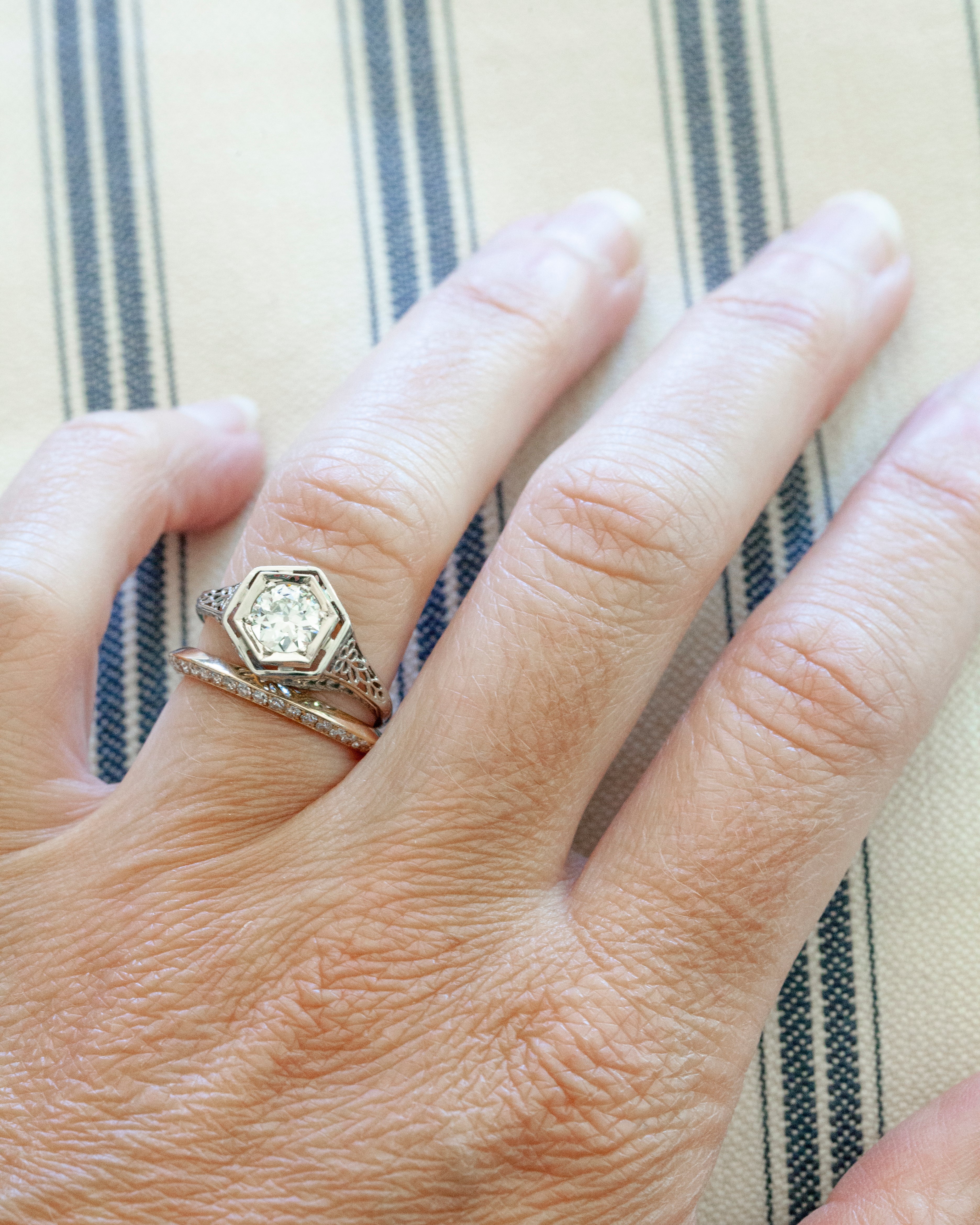 Paired with a Bell & Bird half pave diamond knife edge band.