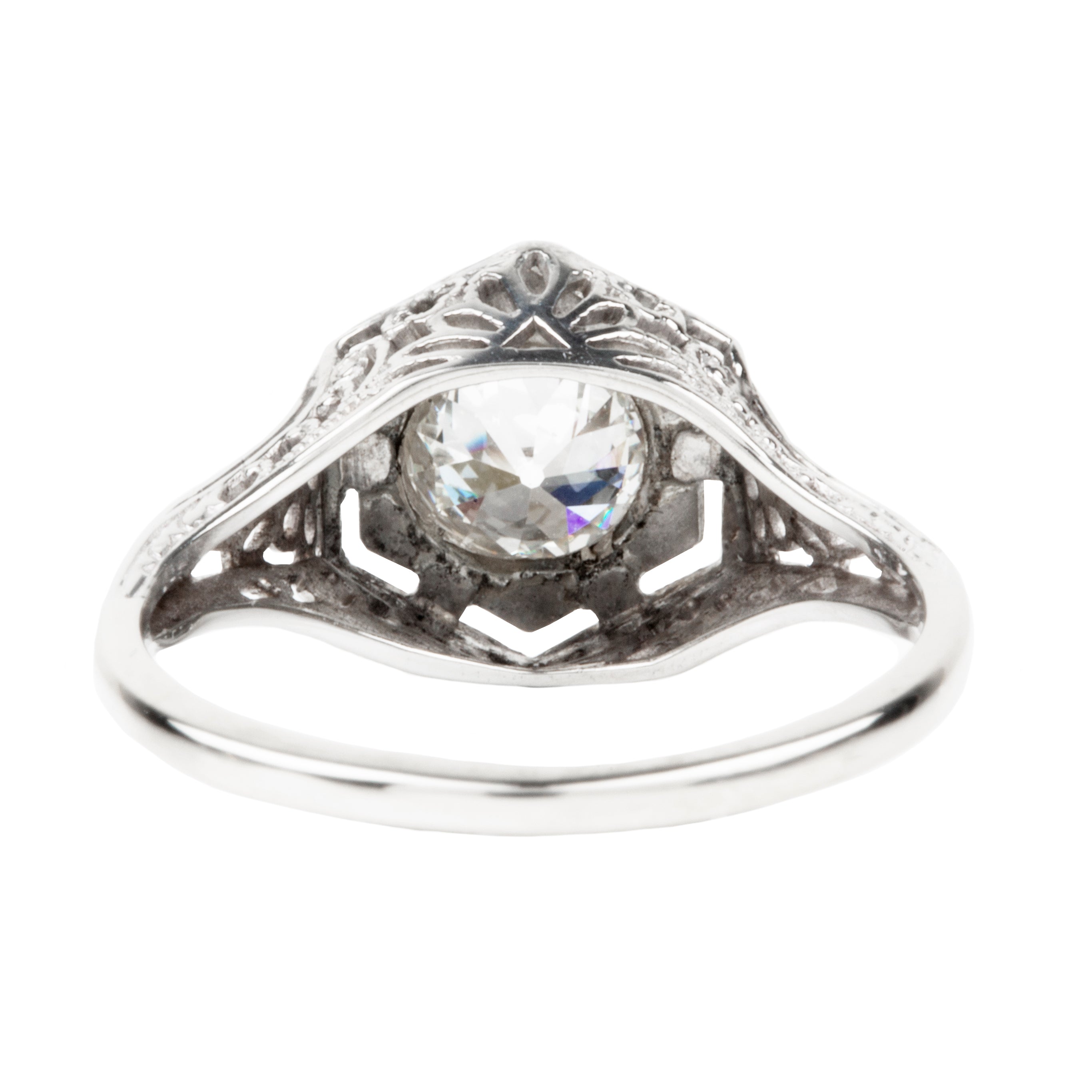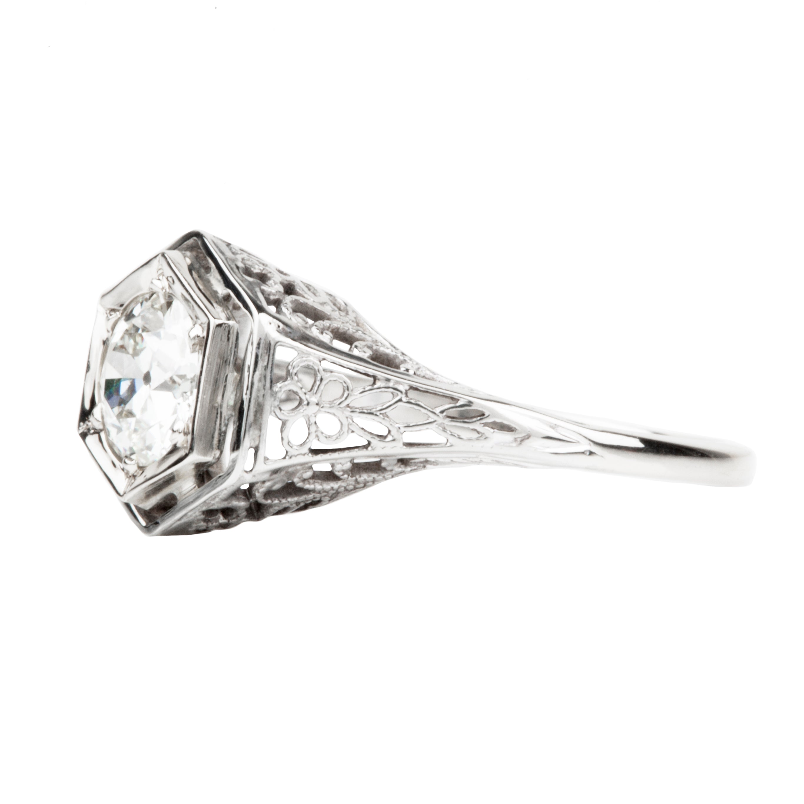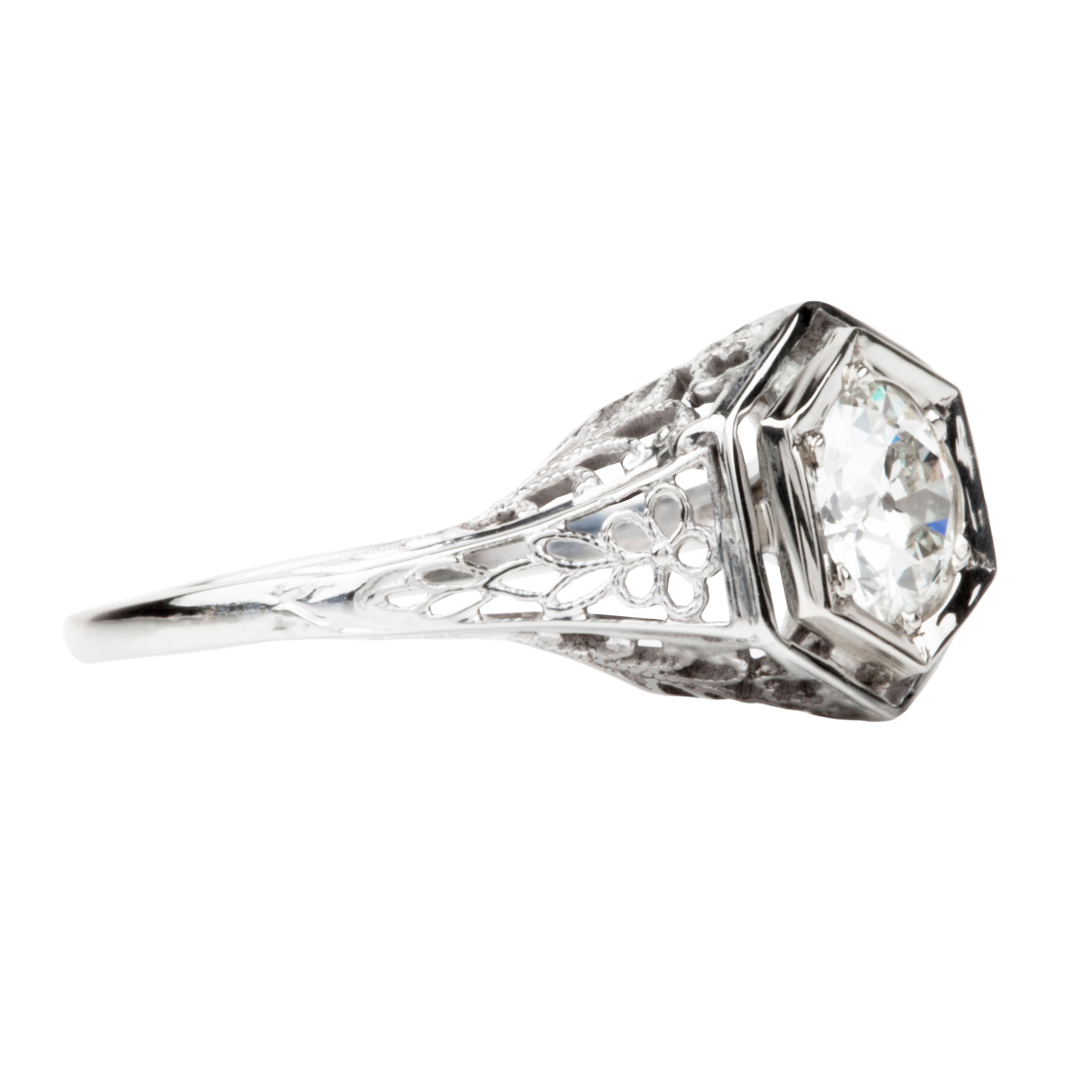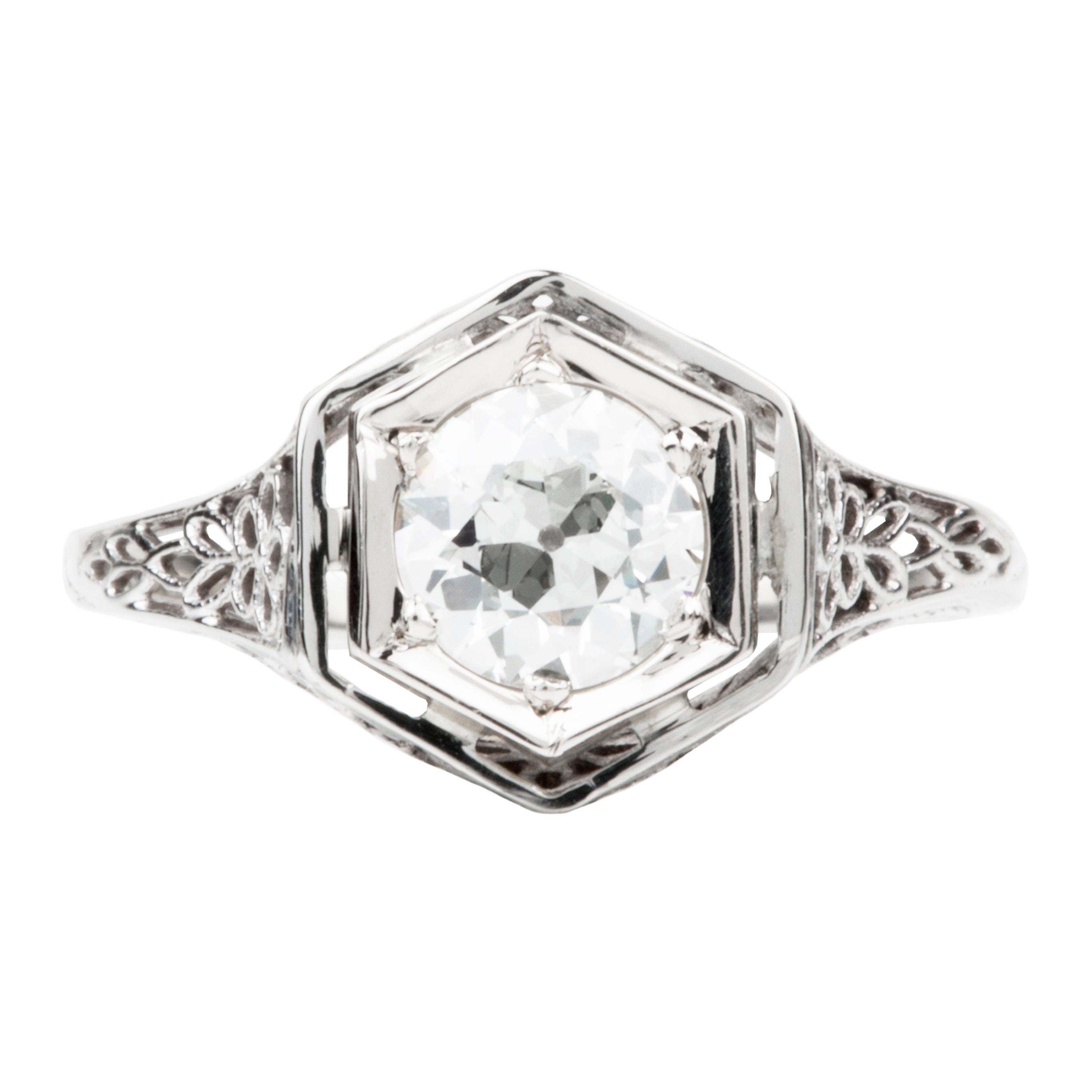 Early 20th century solitaire diamond ring, in a white gold filigree setting with intricate pierced work. Approximately .70 carat, K color and SI1 and Old European cut diamond, set in a hexagonal setting. Circa 1930's.