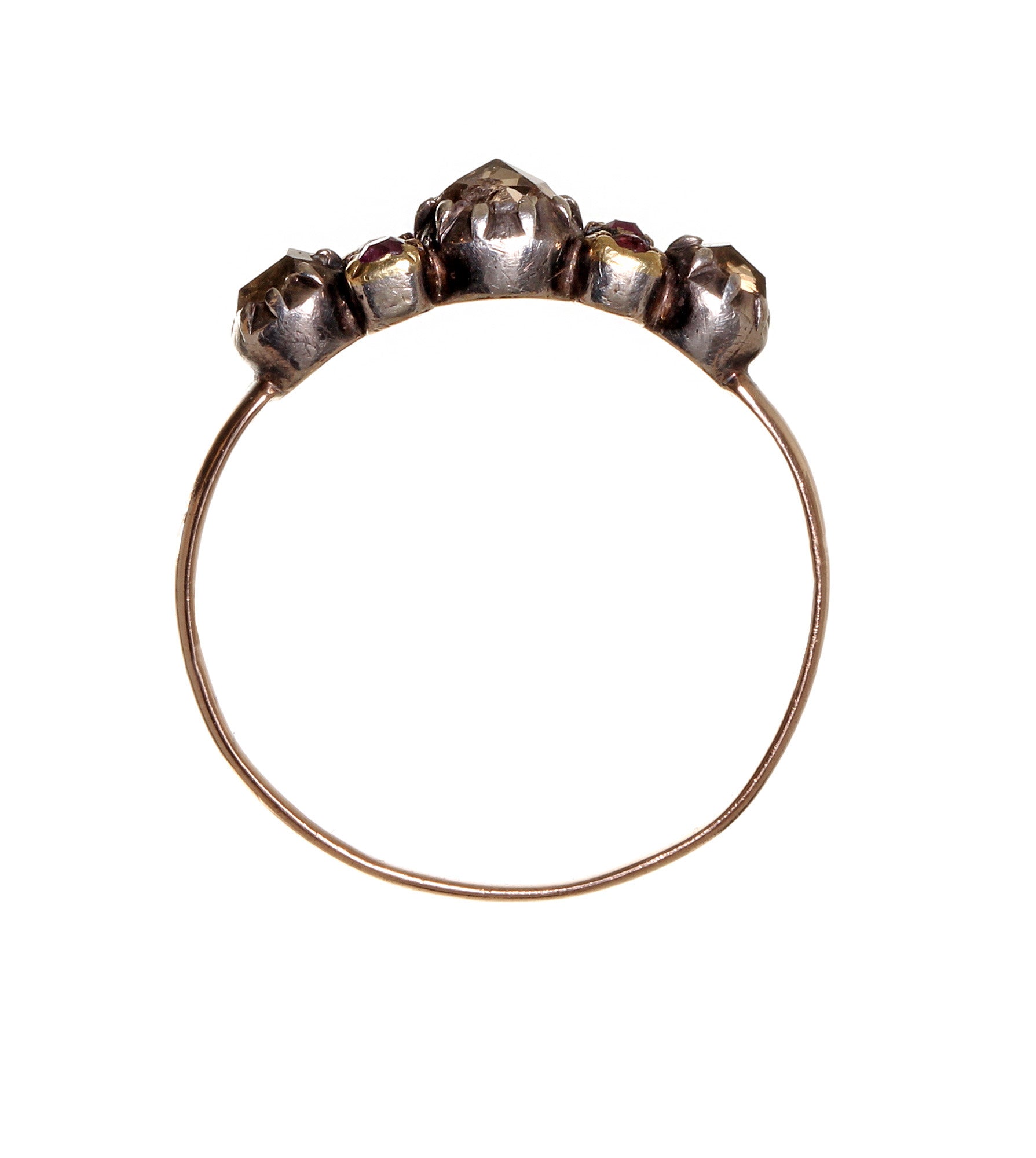 Georgian Era Ring with two Table Cut diamonds and one pointed Rose Cut Diamond surrounded by natural bright red Rubies. The stones are set in sterling silver while the rest of the ring is in rose gold. It was difficult for the camera to capture the dark sparkle of these stones. The stones are brighter than they appear in the photographs. English in Origin, found in London. Circa 1750-1800