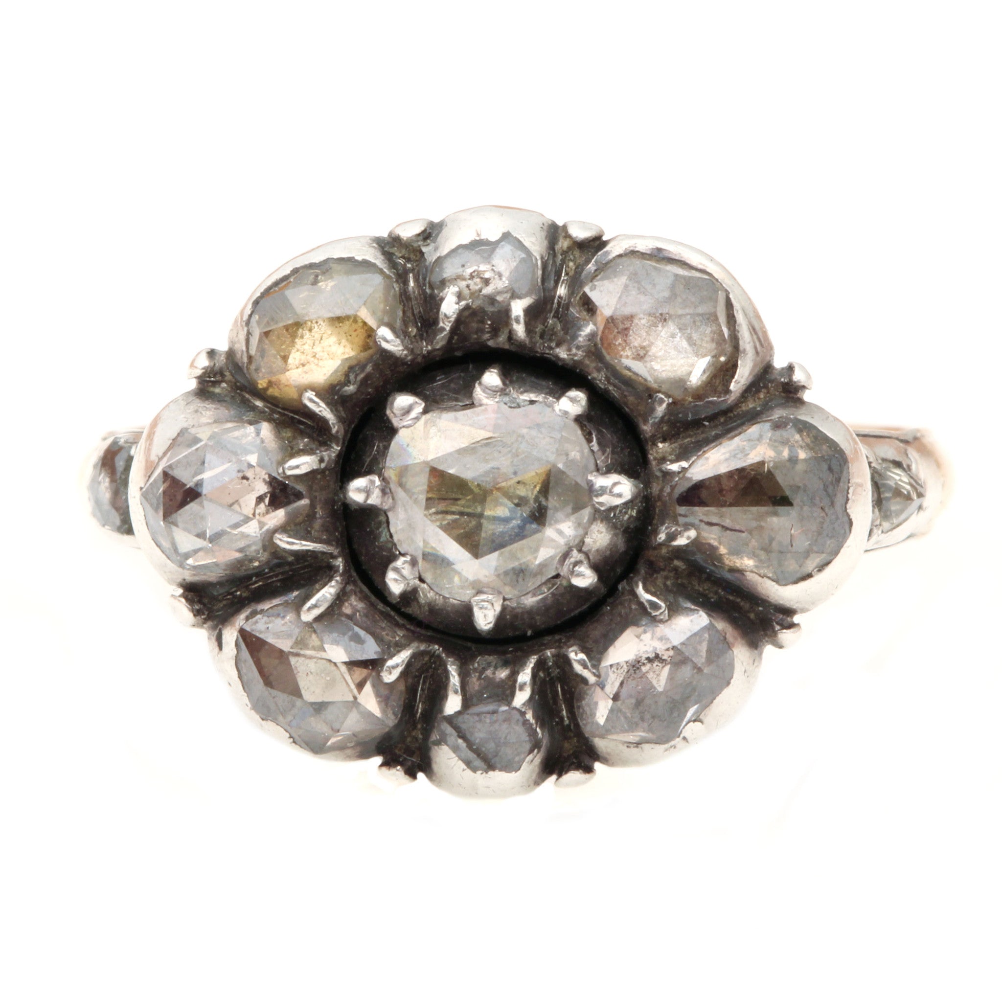 Beautiful early rose cut diamond ring in 18k gold and sterling silver. Circa 1700-1780. Diamonds set in silver back and shank in gold. Reeded detail on back of setting.