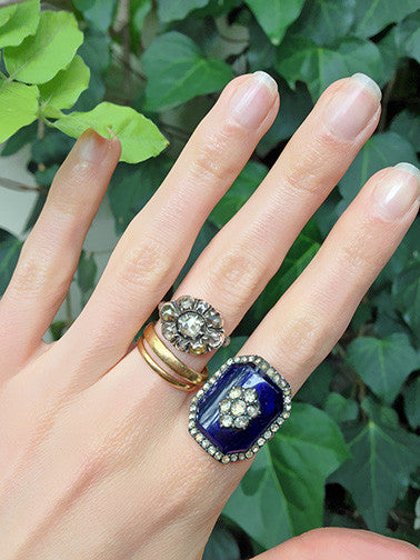 Size 6.5 can be sized. Shown on model with two of our antique gold bands (available in-store) and our 18th Century Paste & Blue Glass L'enfantement Ring.