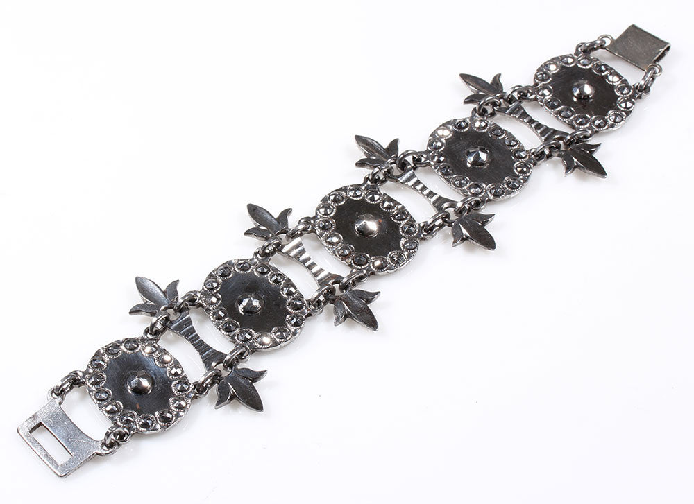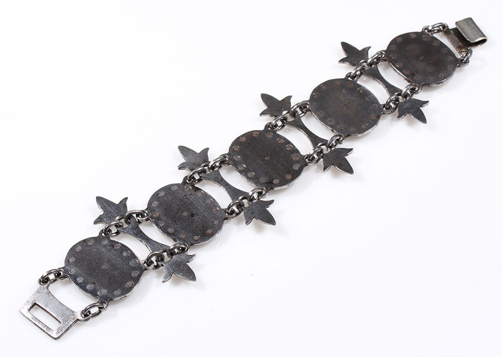 Early steel bracelet dating to the late 18th century or early 19th Century. Bright polished steel plaques are divided by gothic looking fleur de lis bars. A well preserved early example of steel jewelry. French or English in Origin.