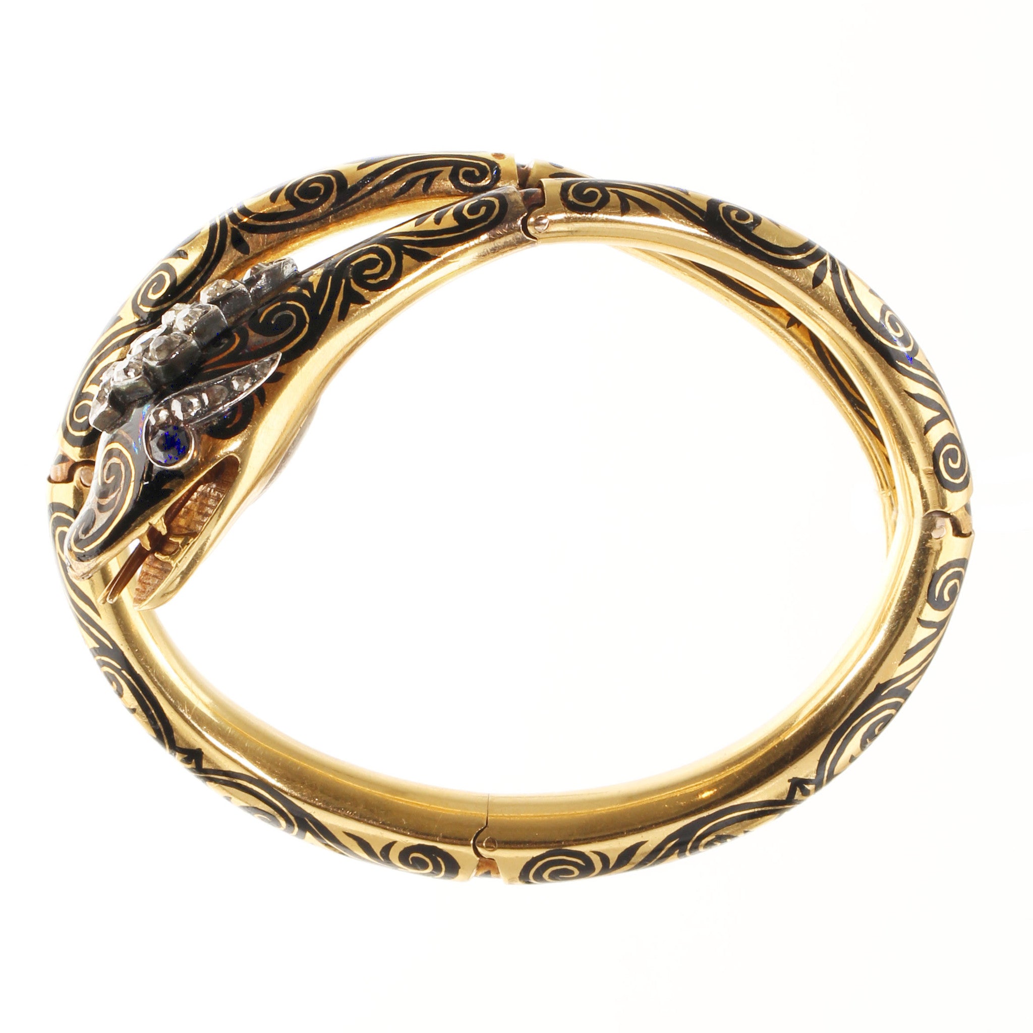 Early Victorian 18k Gold & Enamel Snake Bracelet with multiple hinges, Diamonds & Sapphires set in the head with a hidden locket compartment beneath. The serpent is masterfully hinged at 4 separate points allowing it to fit multiple wrist sizes. Circa 1850