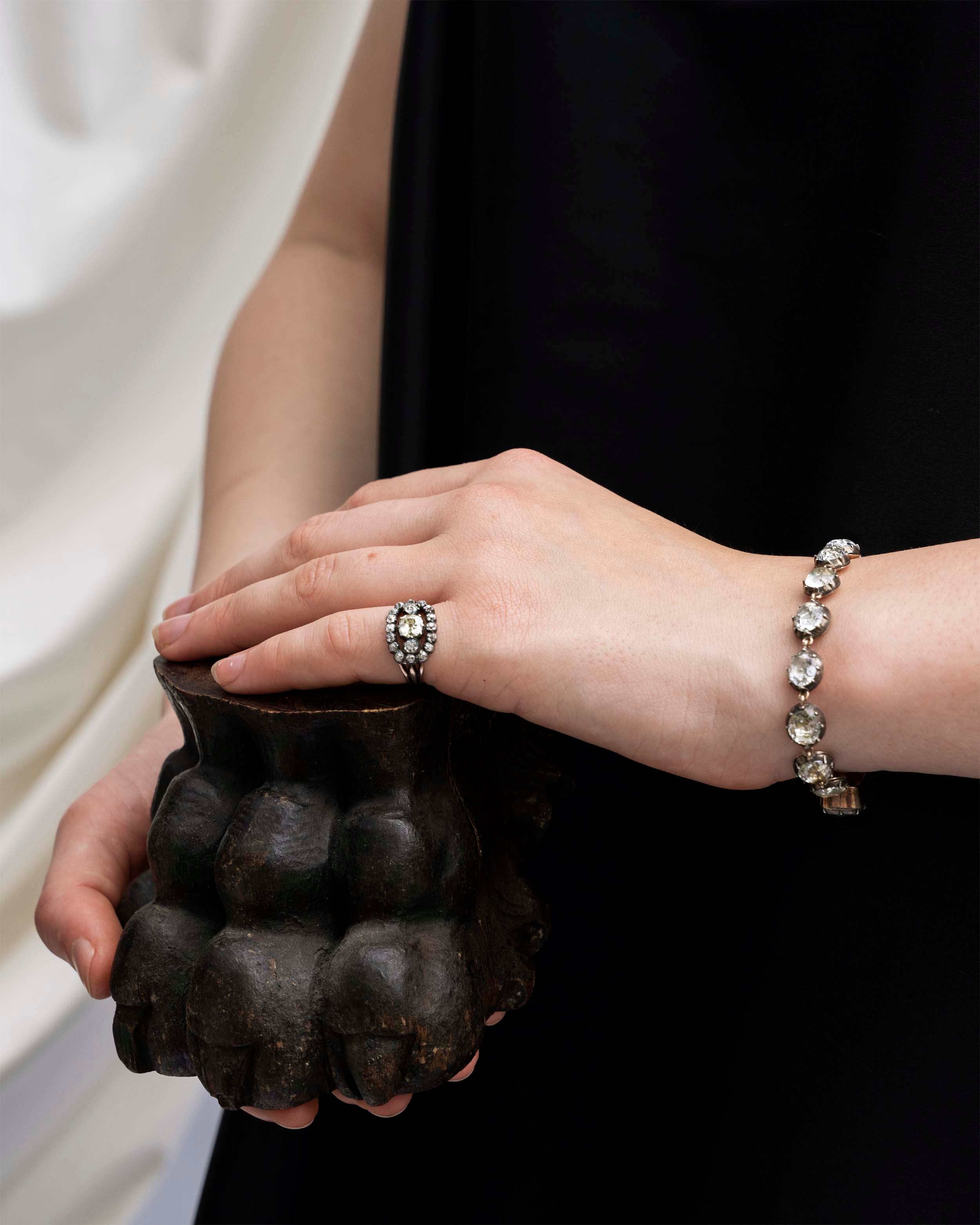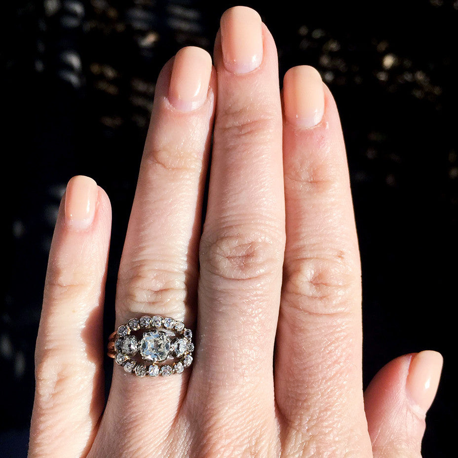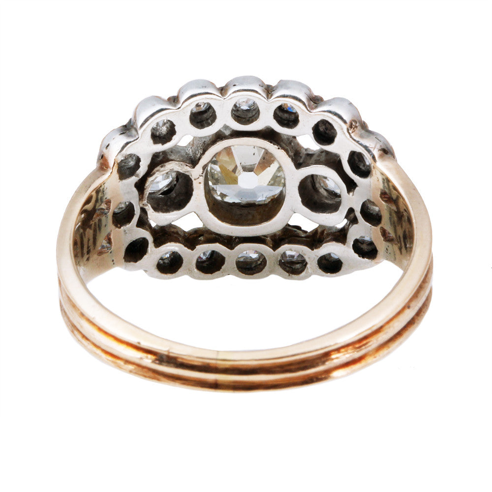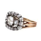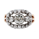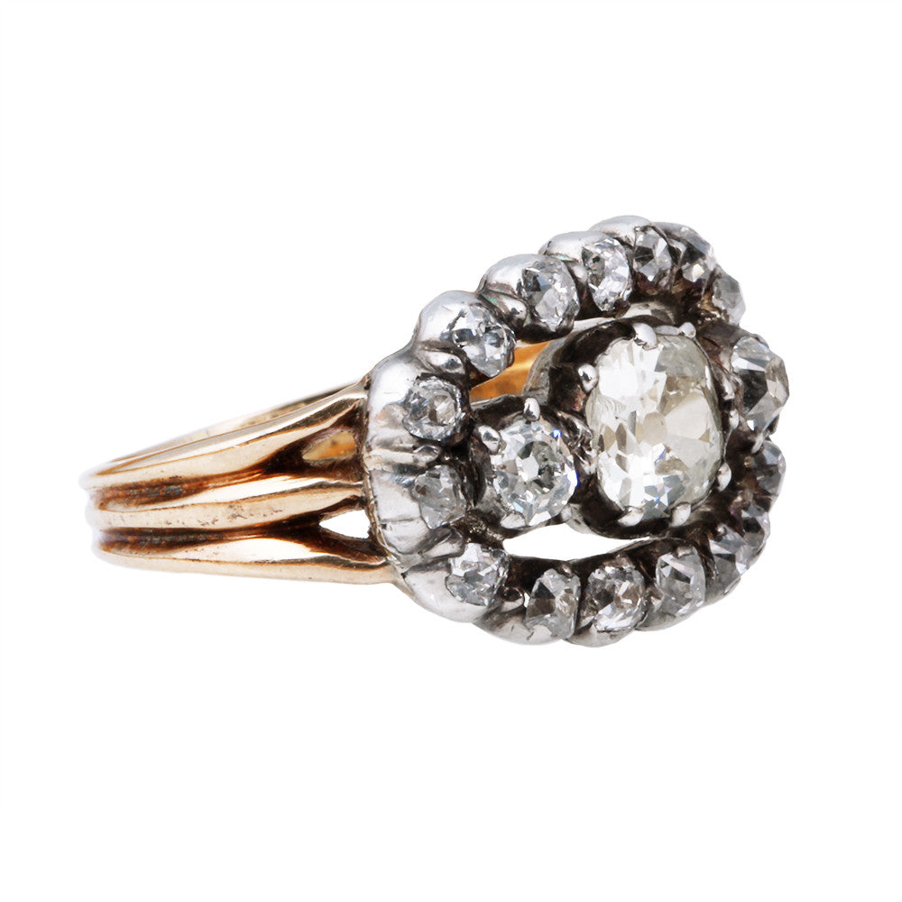 Early Victorian diamond ring. Three larger old mine cut diamonds surrounded by additional old mine cut diamond. Approximately 1.25 in total carat weight. Central old mine cut diamond weighing approximately .50 carats. The diamonds are set in a silver open back setting on an 18k gold shank. English in origin, Circa 1860.