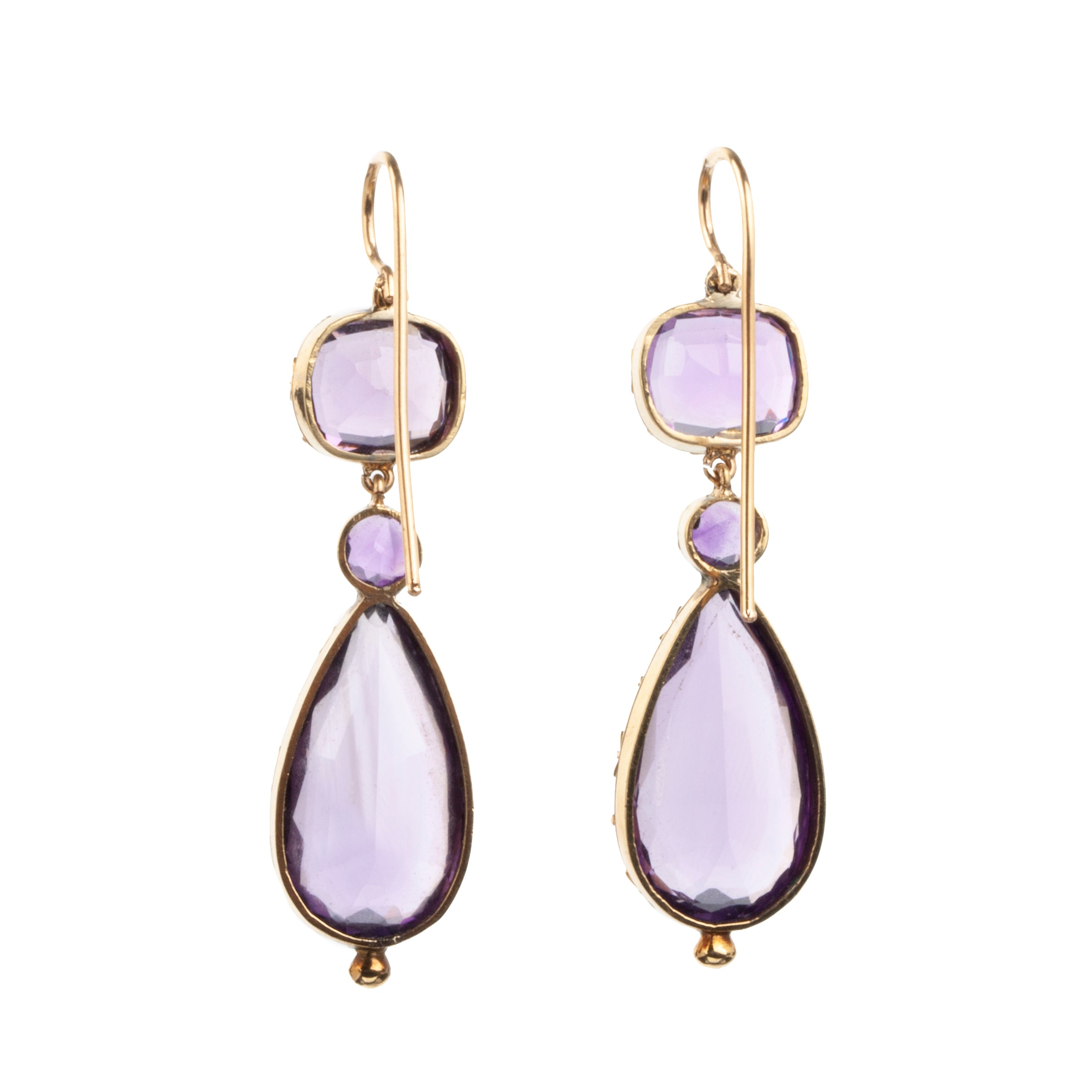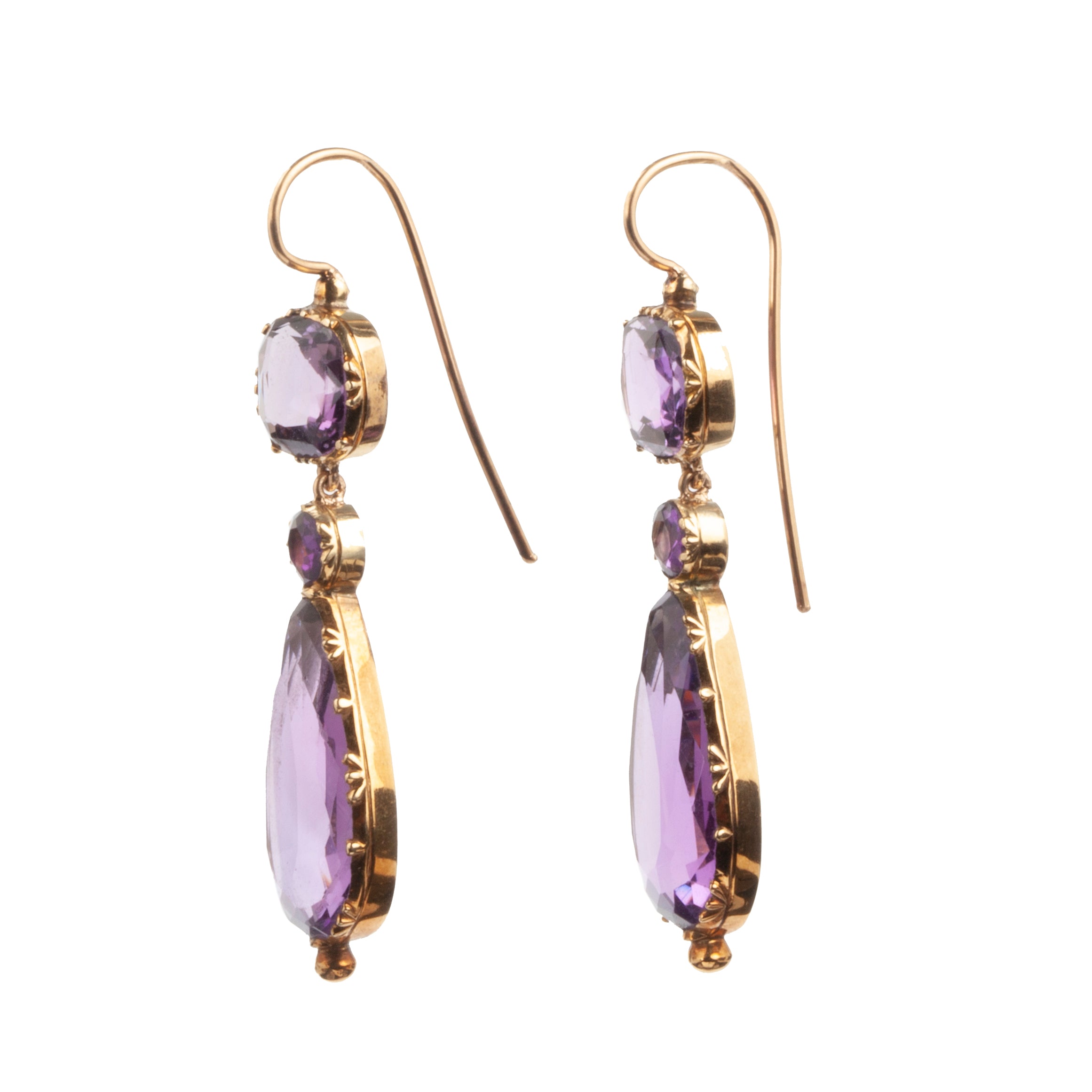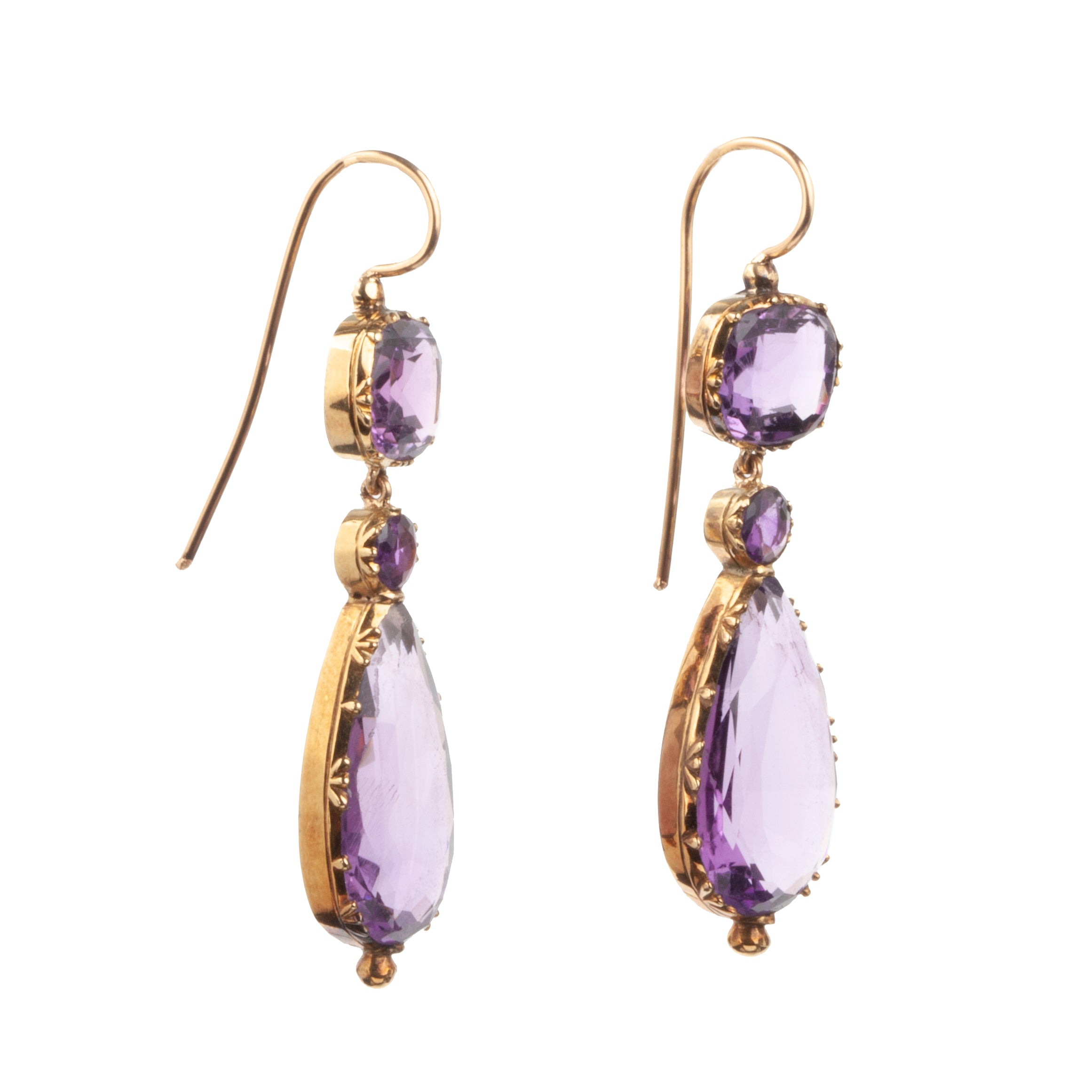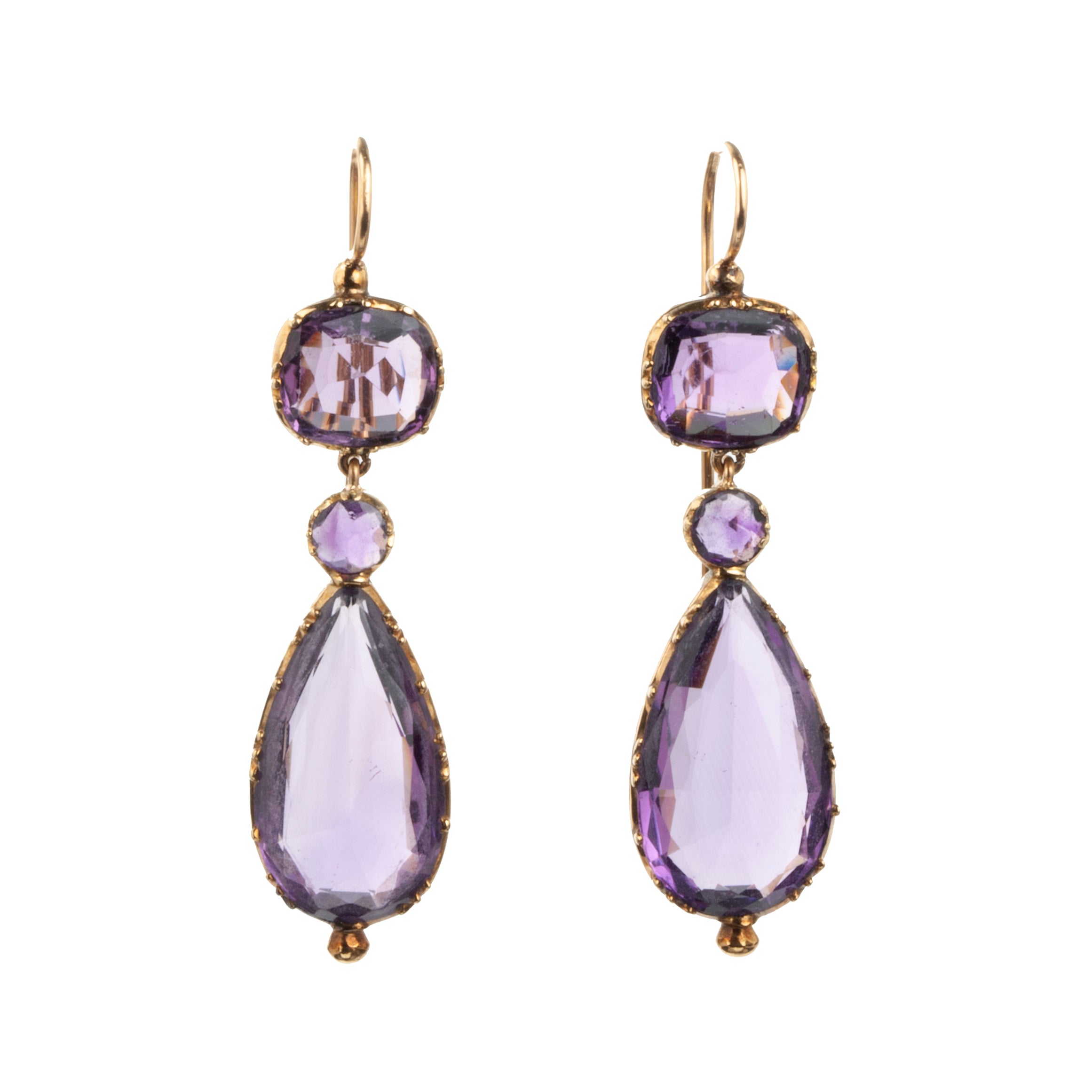 Early victorian era amethyst gemstone earrings, in 18k gold. Vibrant colored teardrop stones hanging from cushion shaped stones in cutaway settings. Circa 1850. English in Origin.