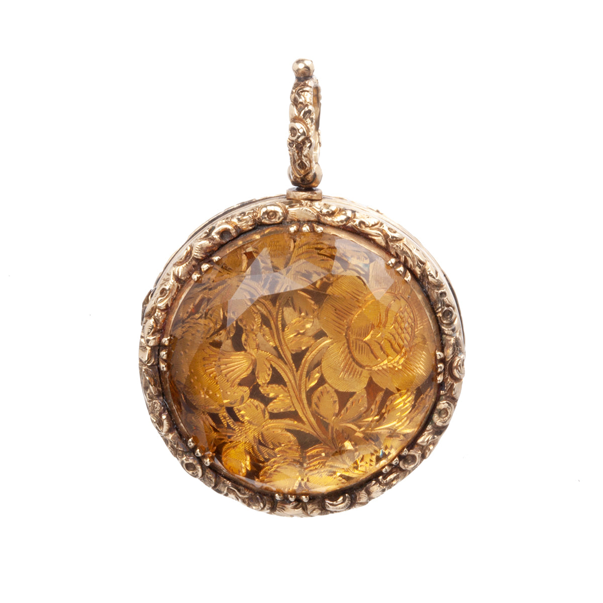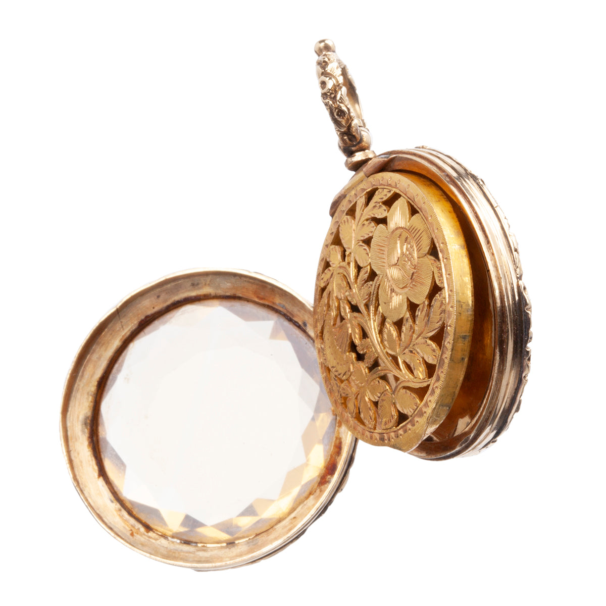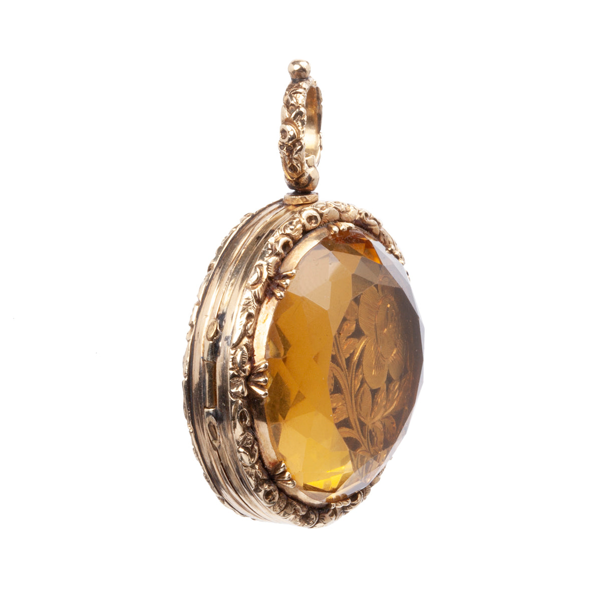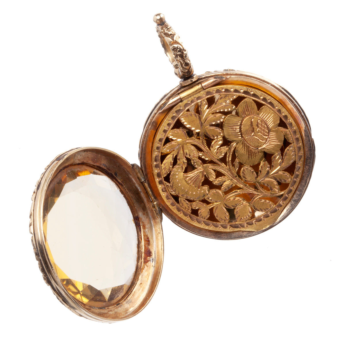 Early Victorian era vinaigrette locket. Beautifully cut citrine stone covers an intricately pierced floral panel that opens to reveal a compartment within. This style of locket is called a vinaigrette. It was a common accessory with the elite classes of the time. A bit of perfume soaked cloth would be placed beneath the pierced panel and allow the wearer to open the locket and enjoy the scent or mask unpleasant odors in the environment.