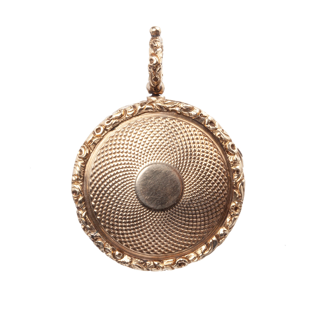 The reverse side of locket has an engine turned panel as well has hand chased details on the frame and bail in 18k gold. English in origin. Circa 1850.