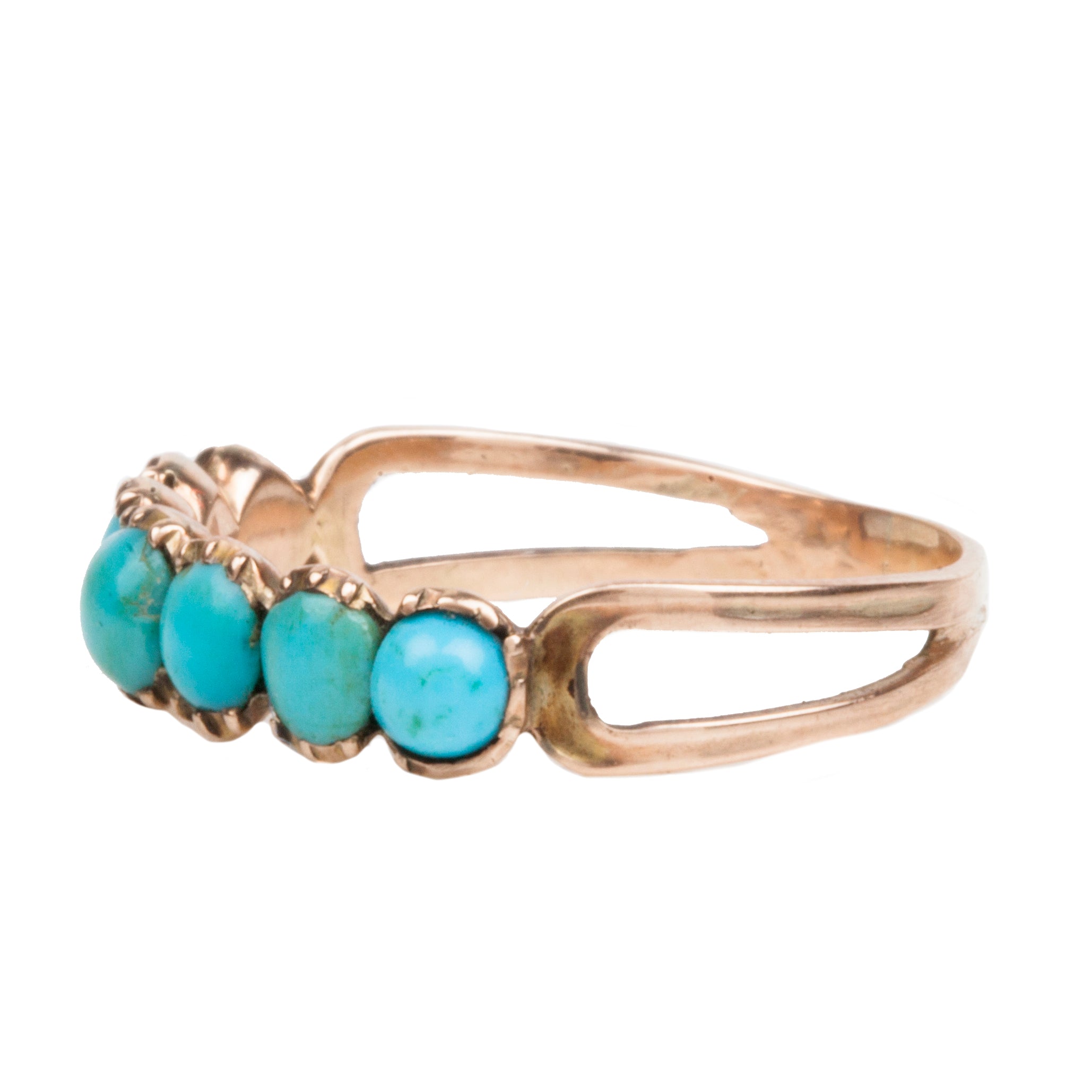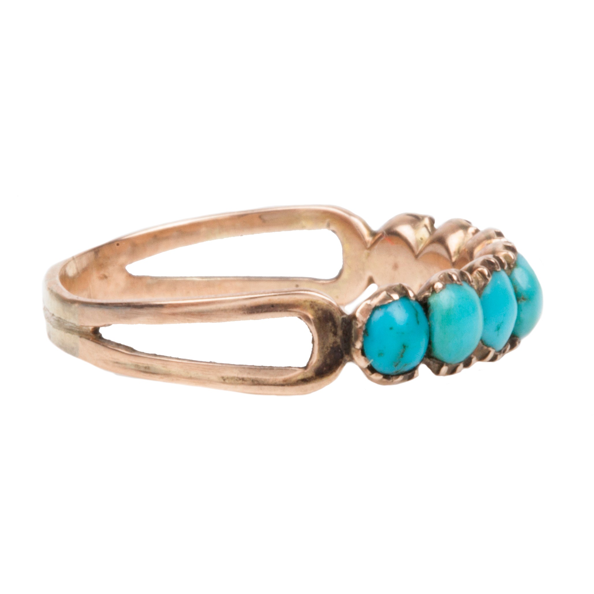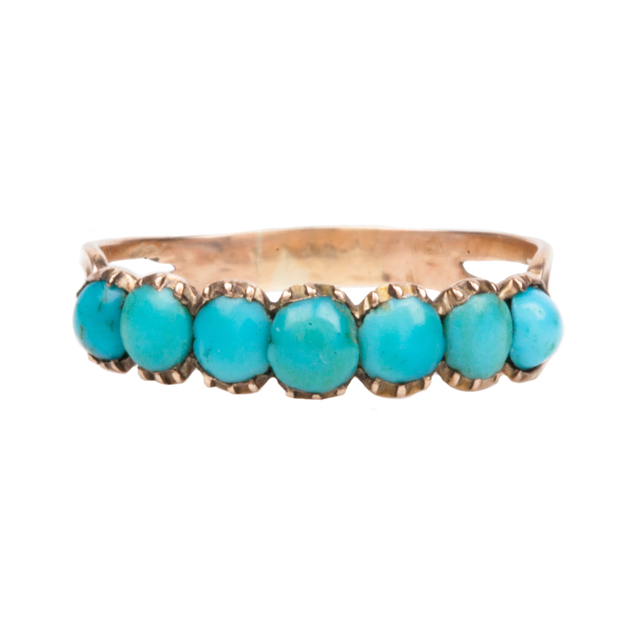 Early Victorian era Persian turquoise half hoop band, in 15k Gold. English in Origin. Circa 1860. This delicate ring, should be worn with care.