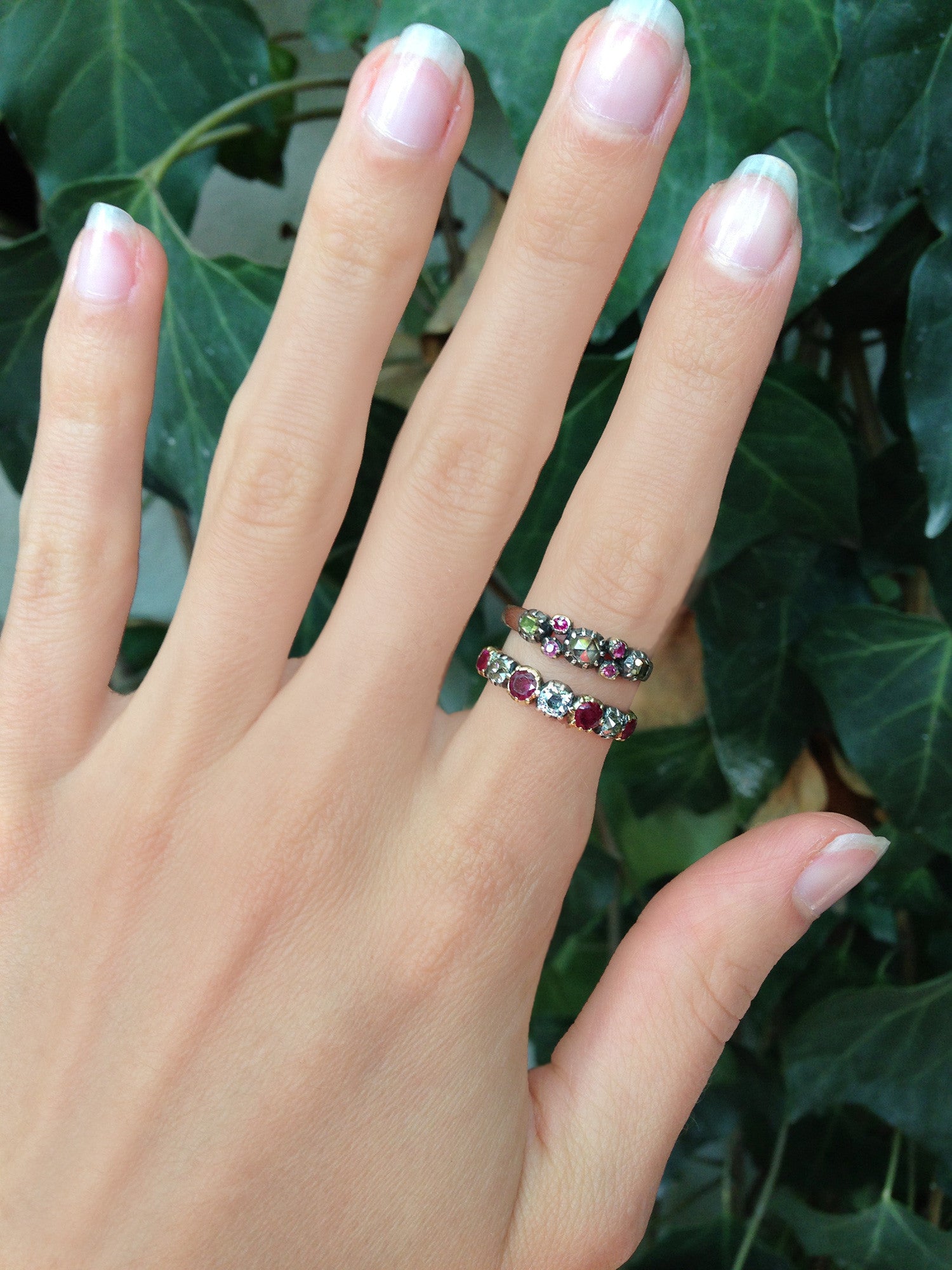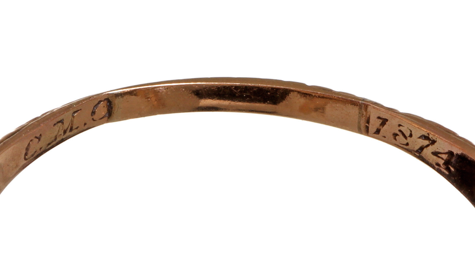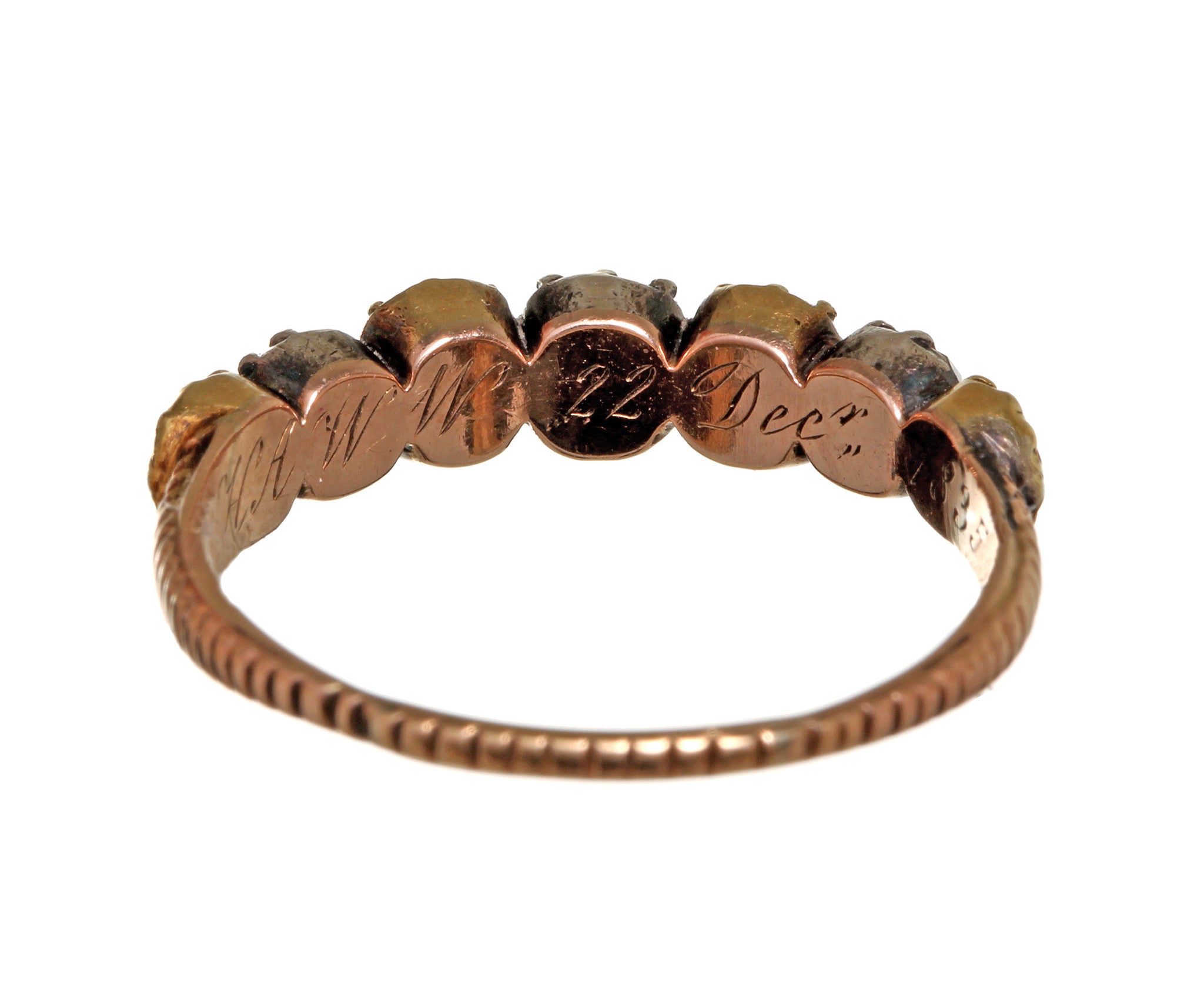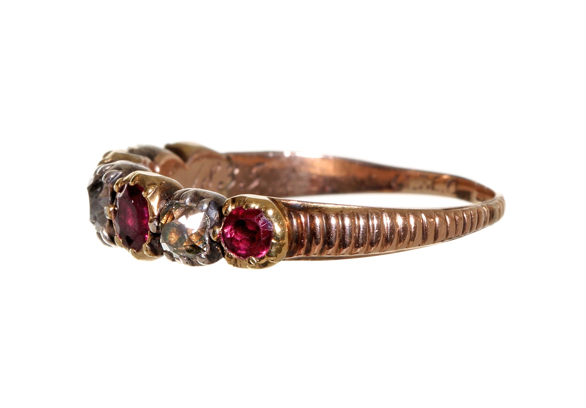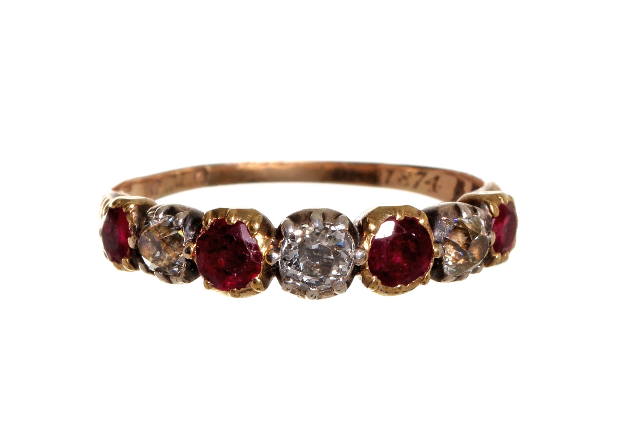 Early 19th Century natural ruby and old mine cut Diamond half-hoop band. Very bright old mine cut stones interspaced with deep red rubies. Several hand engravings on inside of band. Each was clearly done by different hands commemorating two different occasions 40 years apart: "HA WW 22 , December 1835" "C.M.O" & "1874" English in Origin, found in England.